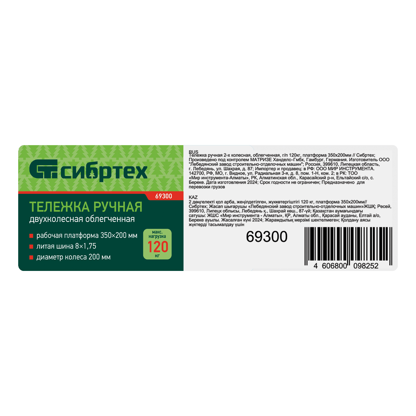 <p>Ручная облегченная двухколесная Сибртех 69300 с платформой размером 350 х 200 мм предназначена для перемещения грузов массой до 120 кг. Два колеса с литыми шинами устойчивы к нагрузкам и механическим повреждениям. Тележка будет полезна на складе и производственном предприятии.</p><h2>Преимущества</h2><ul><li>Прочная конструкция, защищенная от коррозии — рама диаметром 25 мм изготовлена из стали толщиной 1,3 мм и покрыта порошковой эмалью.</li><li>Возможность горизонтальной погрузки — изогнутые рукоятки можно использовать в качестве опор.</li><li>Свободное перемещение нагруженной тележки — в каждом колесе имеется 2 шарикоподшипника, которые облегчают вращение.</li></ul>