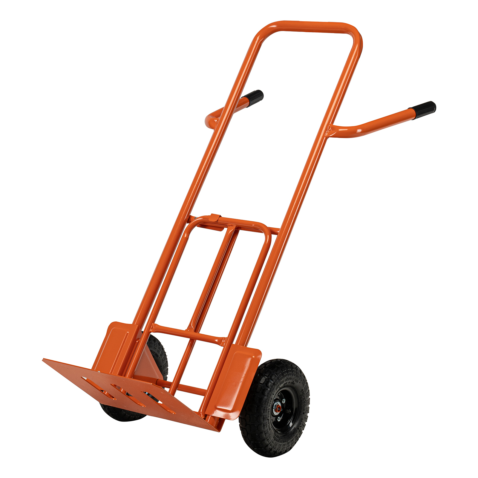 - Удобная транспортировка груза — пневматические колеса с камерами, резиновыми шинами и 2 шарикоподшипниками в каждом гасят вибрации и обеспечивают плавность хода.