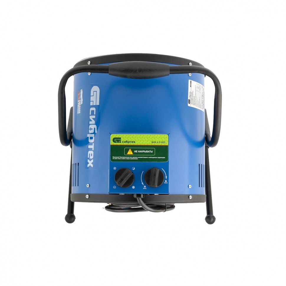 Тепловая пушка (тепловентилятор) Сибртех BHR 6/9-820 96427 работает от сети 380 В и поддерживает 3 режима: вентилятор, нагрев 6000 и 9000 Вт до максимальной температуры 33 °С. Поможет быстро обогреть гараж, склад, подсобку размером до 90 м2. Также подходит для дистанционного просушивания поверхностей (оштукатуренных и окрашенных стен) или сырых помещений (погребов или подвалов). Трубчатый электронагреватель (ТЭН) отличается неприхотливостью, поэтому пушку можно установить на строительной площадке с высокой степенью запыленности.