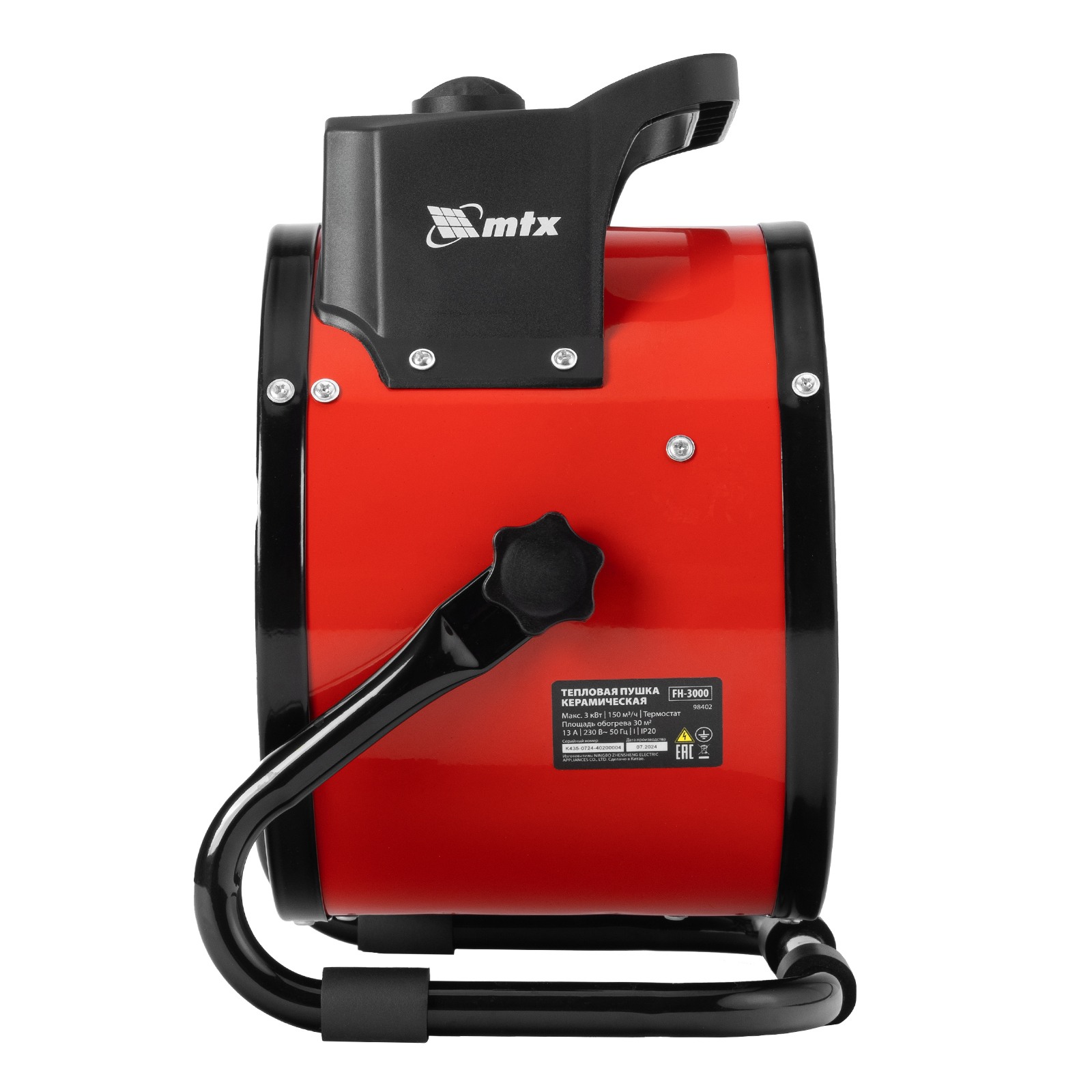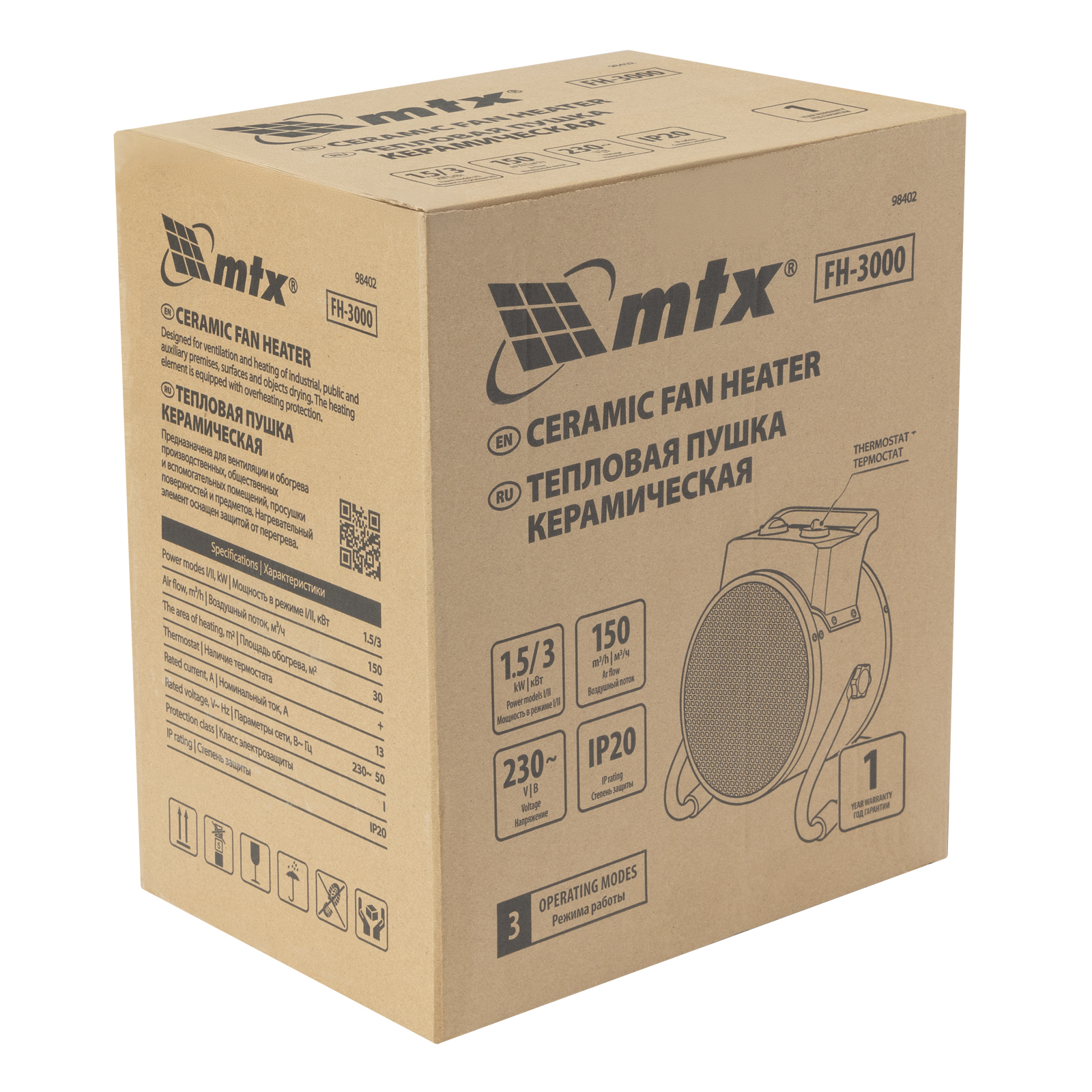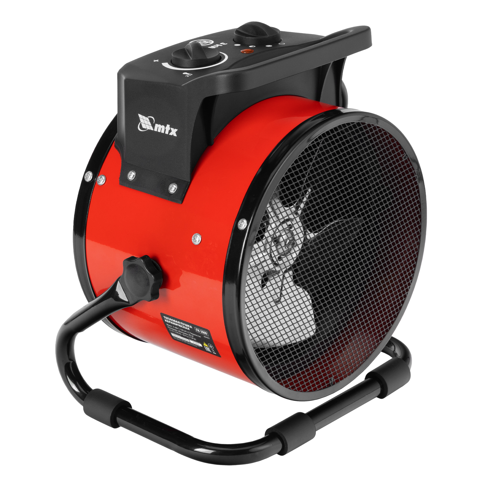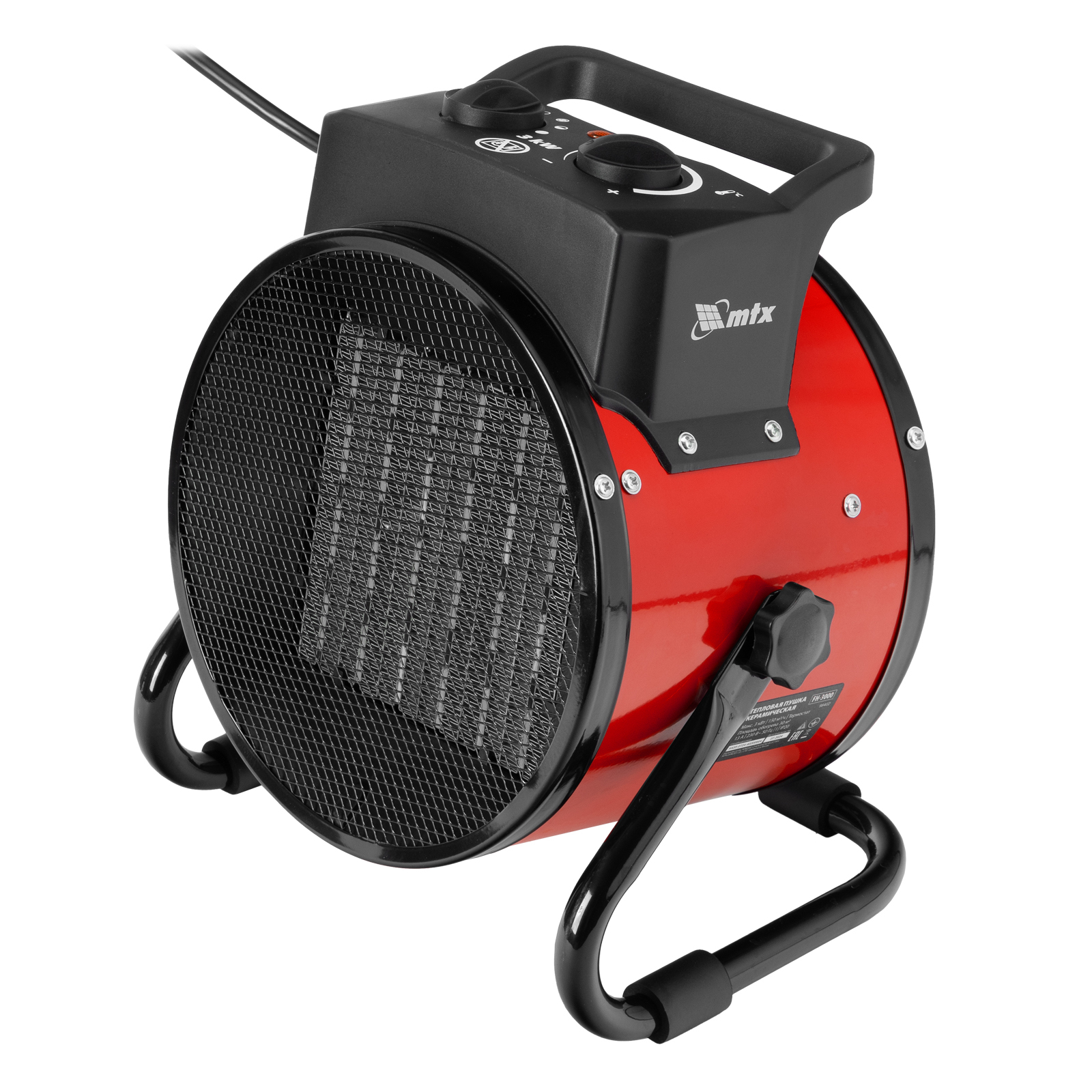 Керамическая тепловая пушка MTX FH-3000 98402 с термостатом, максимальной мощностью 3 кВт, работает в 3 режимах и предназначена для обогрева складов, мастерских и других нежилых помещений площадью до 30 м2. Также может использоваться для быстрой просушки различных поверхностей, например, стяжек пола, оштукатуренных и окрашенных стен.