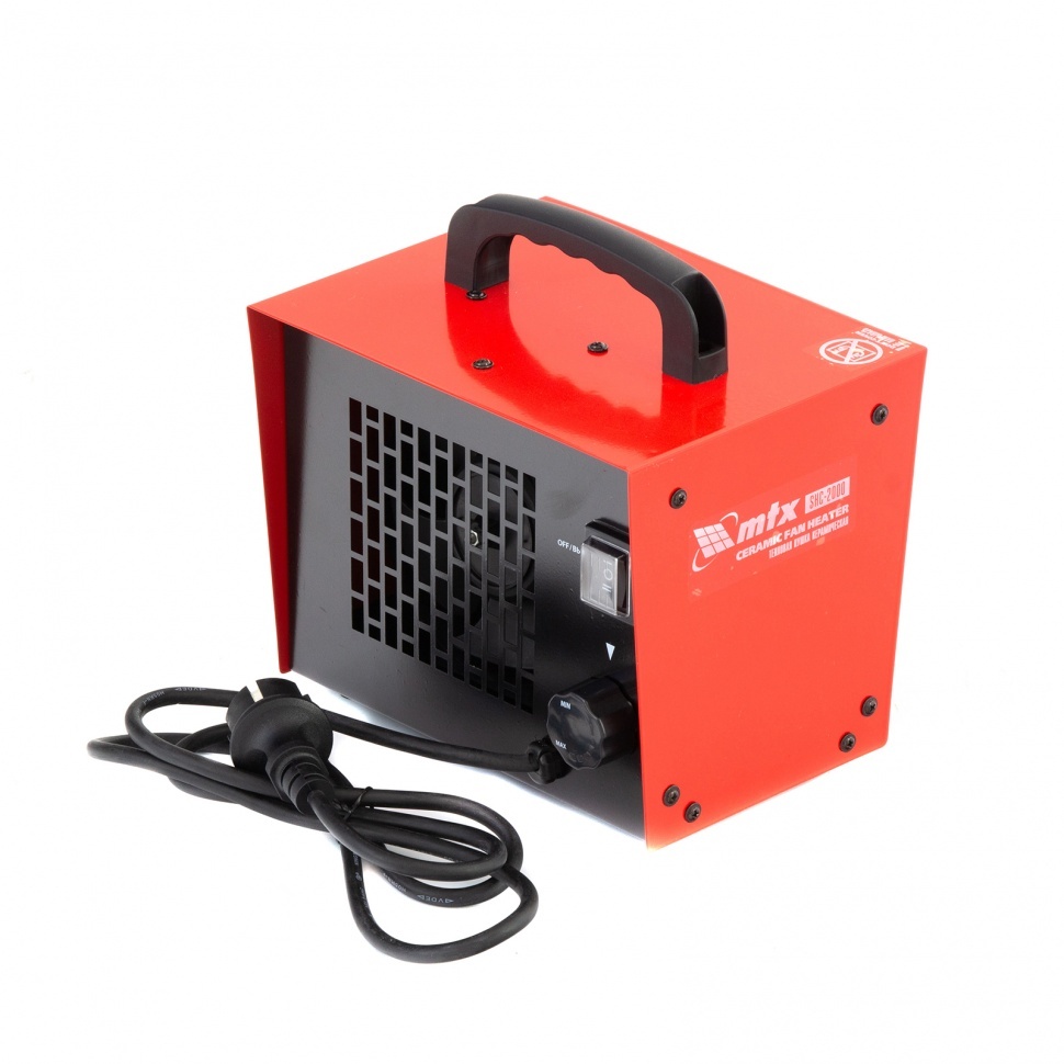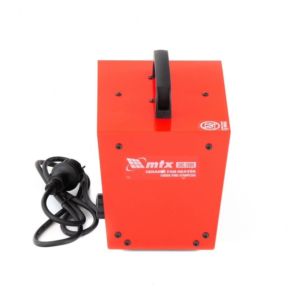 Керамическая тепловая пушка MTX SHC-2000 96422 производительностью 120 куб. м/ч, квадратная, рассчитана на обогрев помещений площадью до 20 кв.м. на мощности 1 или 2 кВт. Работает в режиме теплый воздух / горячий воздух, подходит для использования в гараже, теплице, на складе, в погребе, подвале или ангаре. Также поможет ускорить процесс ремонта в сырую и холодную погоду, ведь ее можно использовать для просушки поверхностей, например, оштукатуренных и окрашенных стен.,В пушке используется керамический нагревательный элемент — он отличается от открытых спиралей нагрева меньшей рабочей температурой и большей площадью, поэтому не сжигает мелкие частицы пыли, не выделяет вредных веществ и не сушит воздух.