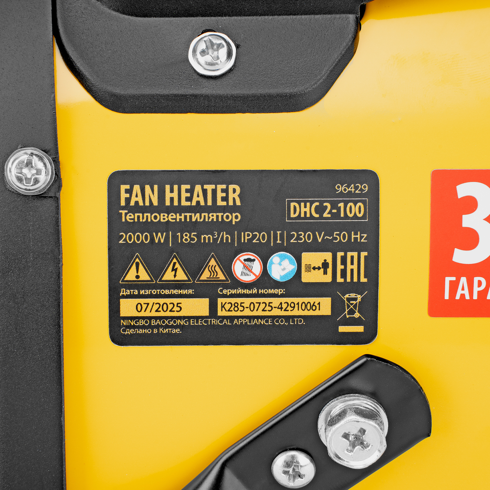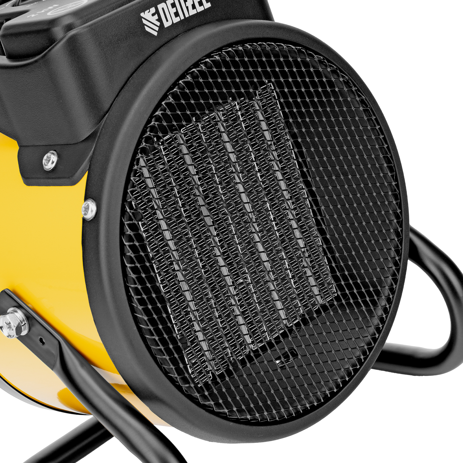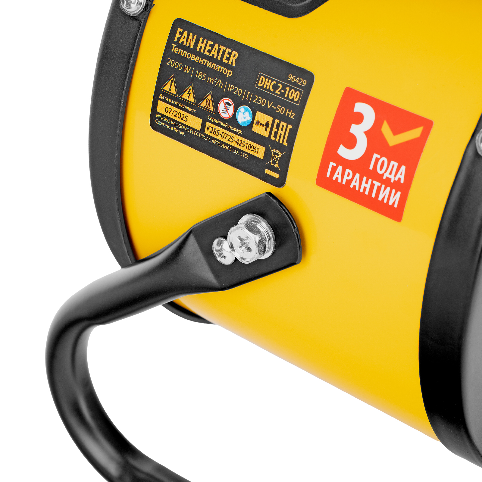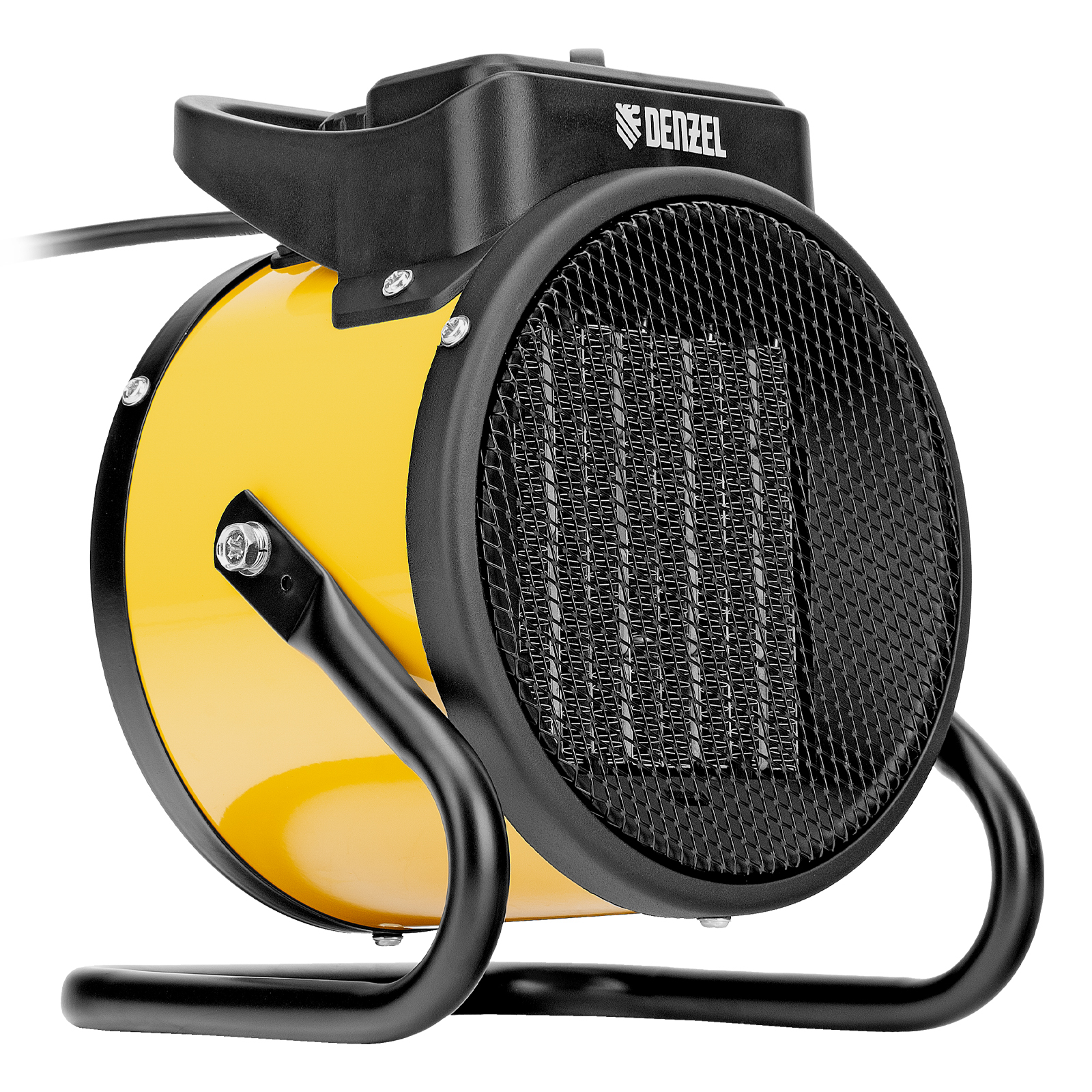 Тепловая пушка Denzel DHC 2-100 96429 работает на мощности 0,025, 1 или 2 кВт. Пригодится в любую погоду: в холод обогреет помещение, а в жару может использоваться в качестве вентилятора. Также тепловентилятор применяется для просушки поверхностей — окрашенных и оштукатуренных стен, стяжек. Максимальной мощности 2 кВт хватит для обогрева помещения площадью до 20 м². Работа пушки не доставляет дискомфорт, безопасна для здоровья людей и животных, поскольку керамический нагревательный элемент не сушит воздух и не выделяет вредных веществ.