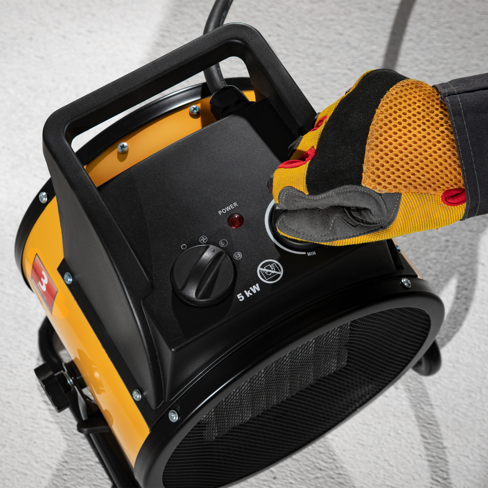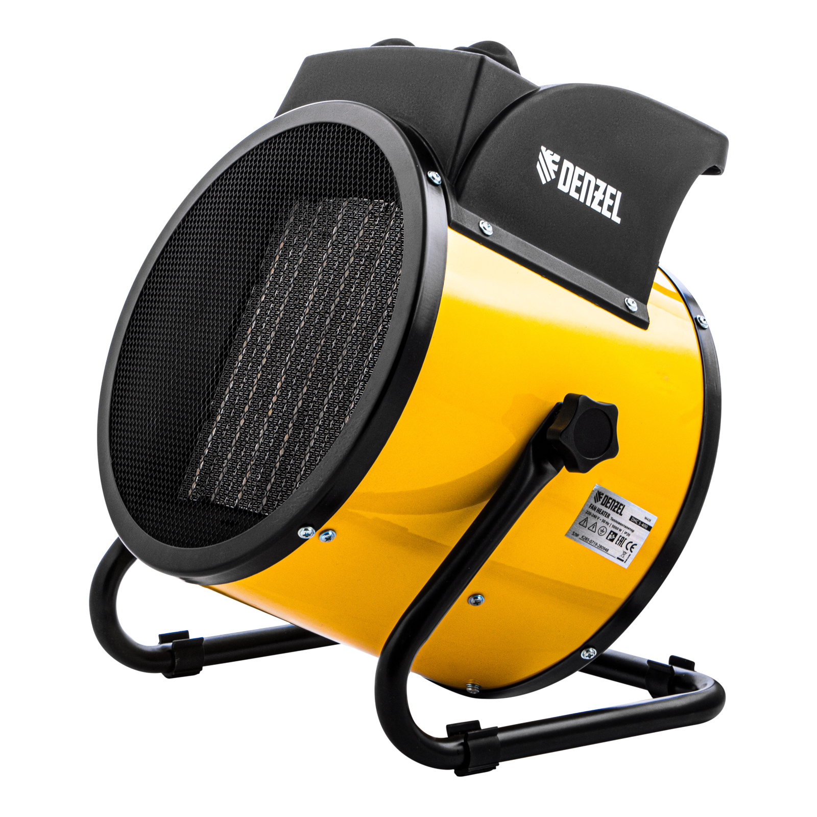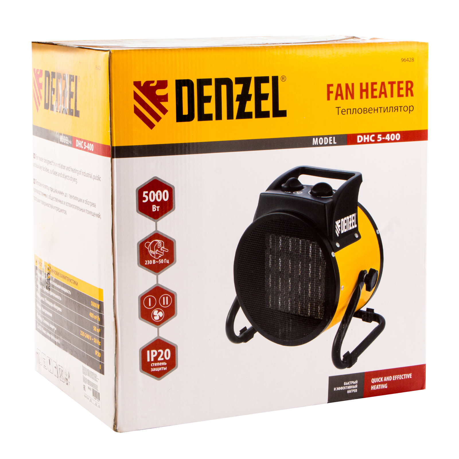 Тепловая пушка (тепловентилятор) Denzel DHC 5-400 96428 с керамическим нагревательным элементом работает на мощности 0,04/3/5 кВт. Пригодится в любую погоду: в холод обогреет помещение, в теплое время года может использоваться как вентилятор. Также пушка применяется во время отделочных работ для просушки поверхностей — окрашенных и оштукатуренных стен, стяжек и т.д. Максимальной мощности 5 кВт хватит для обогрева помещения площадью до 50 кв.м. Работа тепловентилятора не доставляет дискомфорт, безопасна для здоровья людей и животных, поскольку керамический нагревательный элемент не сушит воздух и не выделяет вредных веществ.,Внимание! Тепловая пушка поставляется с установленным кабелем питания и силовой вилкой 230 В / 32 А, для подключения используется силовая розетка 230 В / 32 А (обычные бытовые розетки не рассчитаны на мощность 5 кВт).