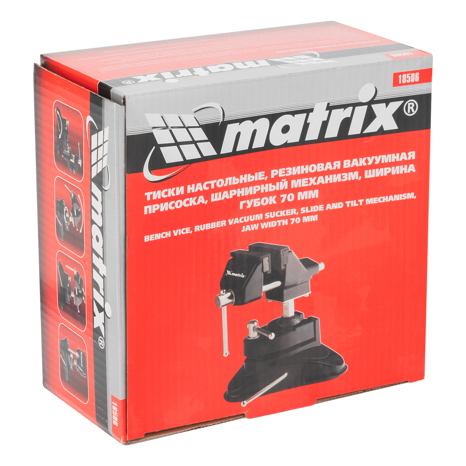 <p>Настольные тиски Matrix 18506 с резиновой вакуумной присоской и шарнирным механизмом, имеют рабочие губки шириной 70 мм и используются для фиксации обрабатываемых деталей. Максимальное расстояние между губками составляет 68 мм, что позволяет закреплять небольшие заготовки для выполнения ювелирных, ремонтных и других тонких работ.</p><h2>Преимущества</h2><ul><li>Надежная фиксация на ровных поверхностях любого типа — тиски оснащены резиновой вакуумной присоской.</li><li>Обработка заготовок под разными углами — шарнирный механизм позволяет поворачивать и наклонять верхнюю часть инструмента с амплитудой 360°.</li><li>Аккуратная работа — резиновые накладки на прижимных губках позволяют фиксировать хрупкие детали без риска поломки.</li></ul>