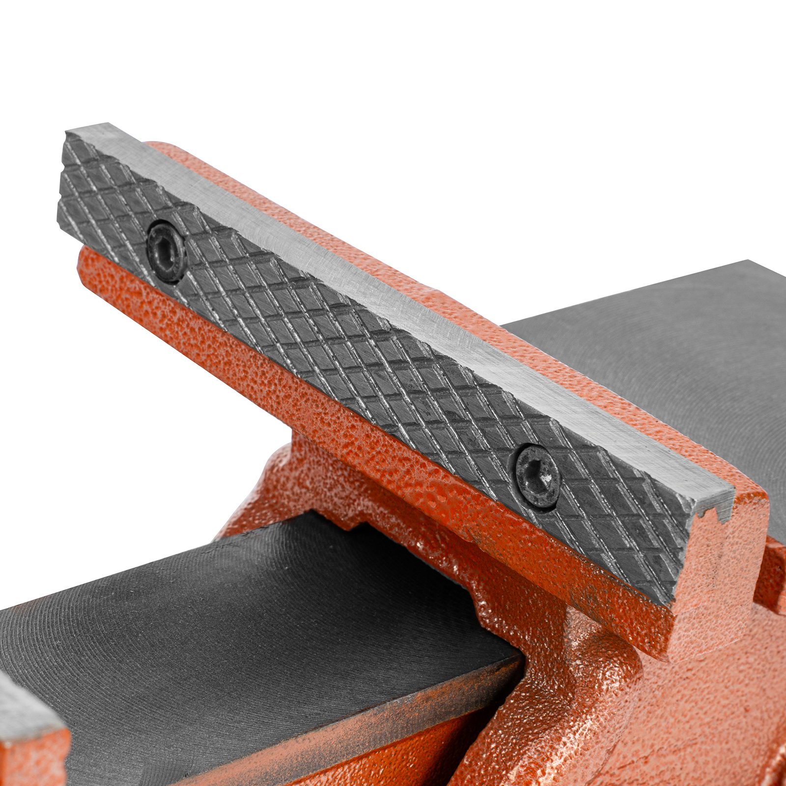 - Корпус тисков выполнен из чугуна, а губки — из стали, благодаря чему достигается высокая прочность инструмента.