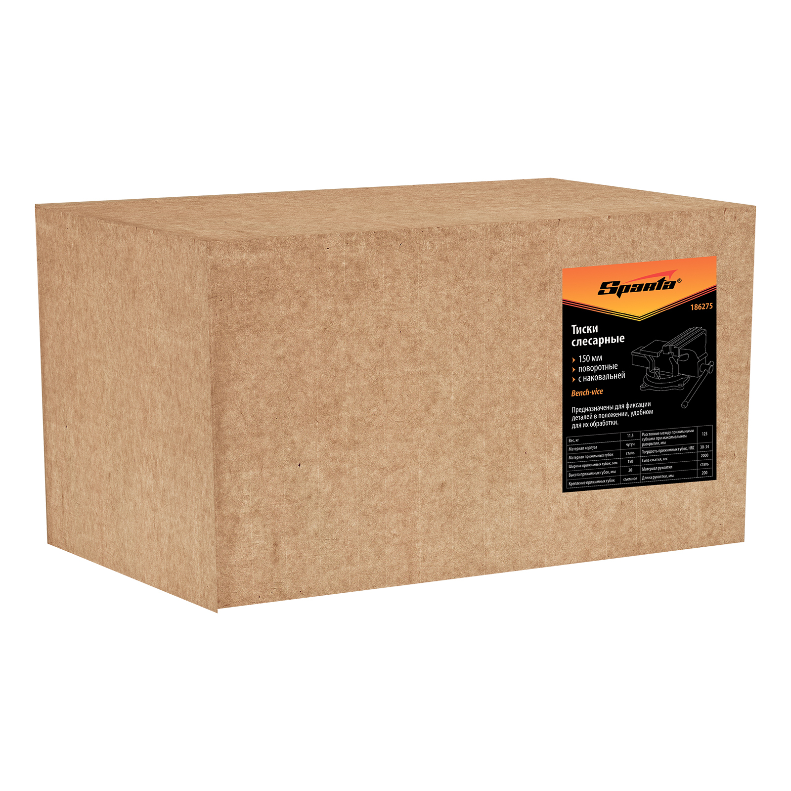 <p>Поворотные слесарные тиски Sparta 186275 с наковальней, ширина губок 150 мм, — это небольшой инструмент для захвата деталей до 125 мм. Будут полезны в частной мастерской или гараже для удобства обработки крупногабаритных заготовок.</p><h2>Преимущества</h2><ul><li>Корпус тисков выполнен из чугуна, а губки — из стали, благодаря чему достигается высокая прочность инструмента.</li><li>На нерабочих поверхностях имеется порошковое покрытие для защиты от коррозии.</li><li>Поворотные тиски позволяют менять положение заготовки для удобства ее обработки.</li><li>Для осуществления ударных работ в конструкции тисков предусмотрена наковальня.</li><li>Рельефные прижимные губки обеспечивают надежный захват изделий.</li><li>Тиски можно использовать в качестве стационарного инструмента, т.к. они крепятся к верстаку на болты.</li></ul>