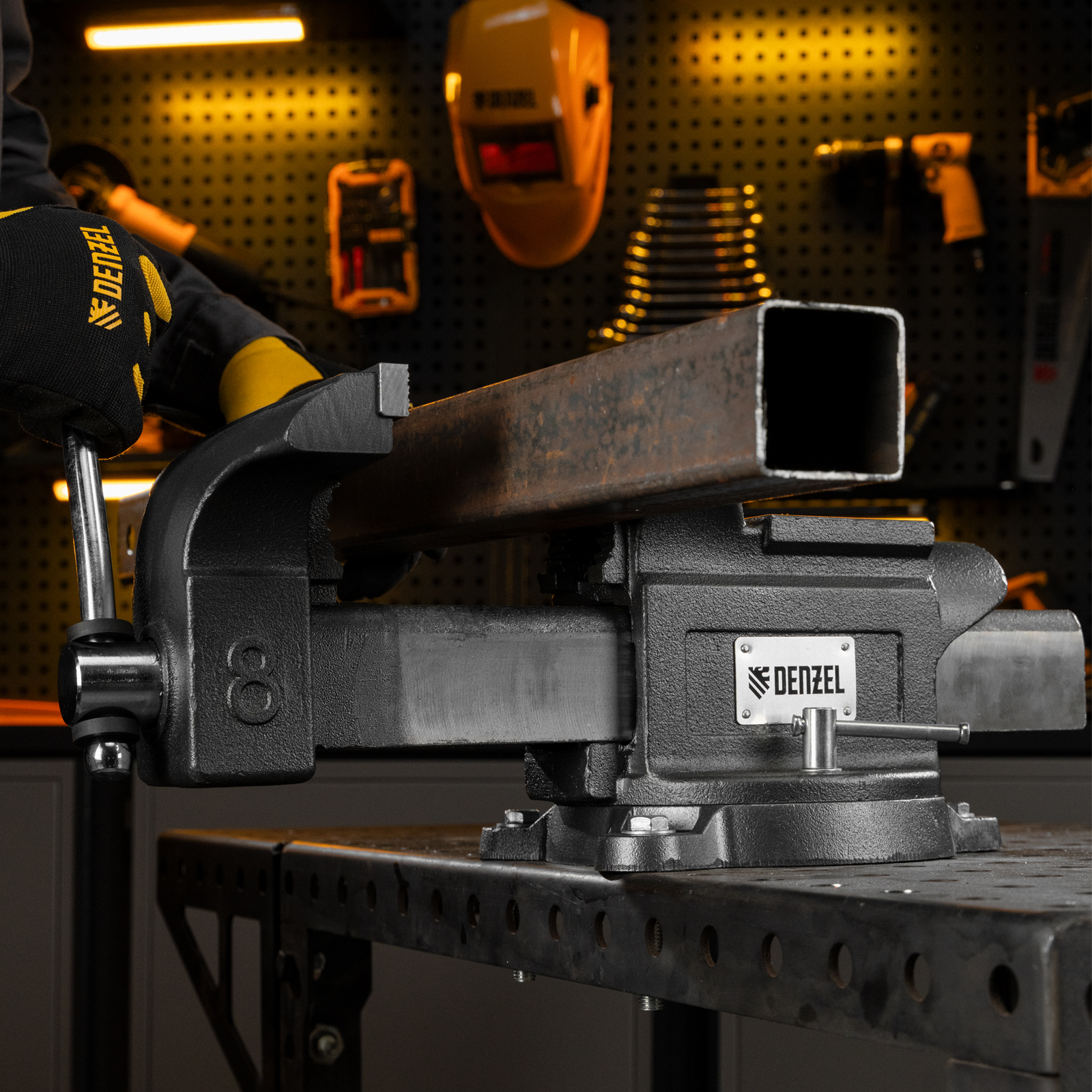 Слесарные поворотные тиски Denzel BVH-200 18686 с губками шириной 200 мм и стальной направляющей предназначены для фиксации деталей и заготовок, а также для выполнения мелких ударных работ — в конструкции предусмотрена наковальня. Рабочий ход составляет 200 мм, глубина зажима — 90 мм. Специальный зажим позволяет фиксировать трубы диаметром 25-64 мм, что расширяет возможности использования инструмента. На губки можно установить защитные накладки (приобретаются отдельно) для предотвращения повреждения зажимаемых предметов. Тиски пригодятся в мастерской и гараже.