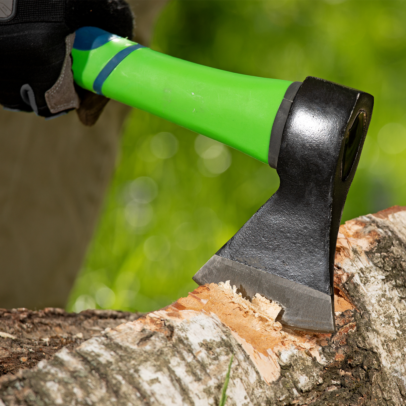 - Комфортная работа — фибергласовое топорище гасит вибрации, что в сочетании с малым весом полотна 600 г позволяет уменьшить нагрузку на руки.
