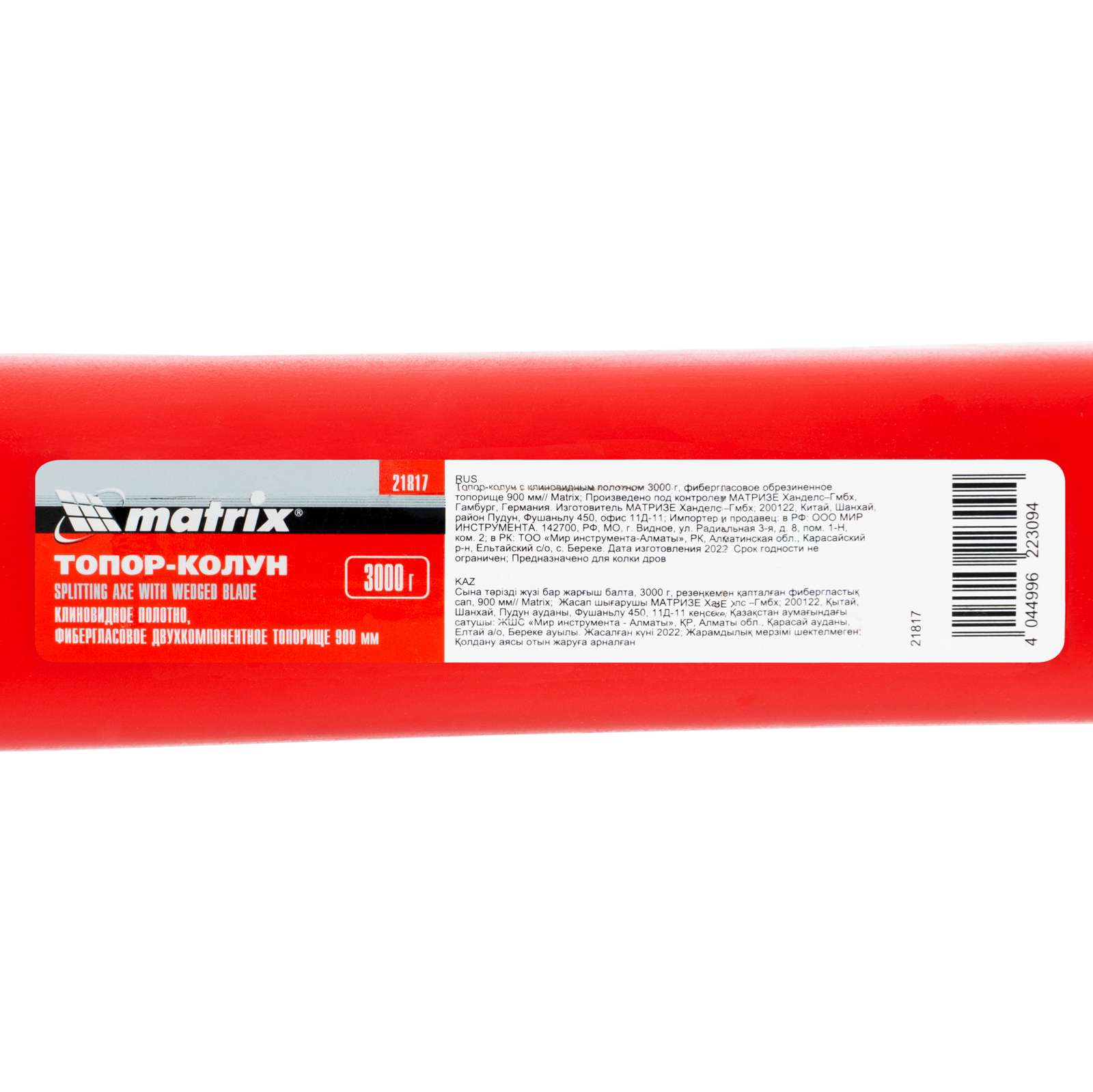 <p>Топор-колун Matrix 21817 длиной 900 мм, с клиновидным полотном весом 3000 г и фибергласовым обрезиненным топорищем, предназначен для колки и рубки древесины. Длинное топорище в сочетании с массивной рабочей частью позволяет наносить сильные удары и справляться с поленьями большого диаметра. Инструмент пригодится для заготовки дров.</p><h2>Преимущества</h2><ul><li>Прочность и высокий ресурс — полотно выковано из стали 45 и закалено до твердости 48-50 HRC, режущая кромка долго остается острой.</li><li>Высокая производительность — рабочая часть утолщена по бокам, что повышает эффективность наносимых ударов.</li><li>Фибергласовое топорище — рукоять топора выдерживает динамические нагрузки, не разрушается под воздействием внешней среды, а также гасит вибрации, уменьшая отдачу от удара.</li><li>Комфортная работа — топорище с резиновой накладкой не выскальзывает из рук.</li></ul>