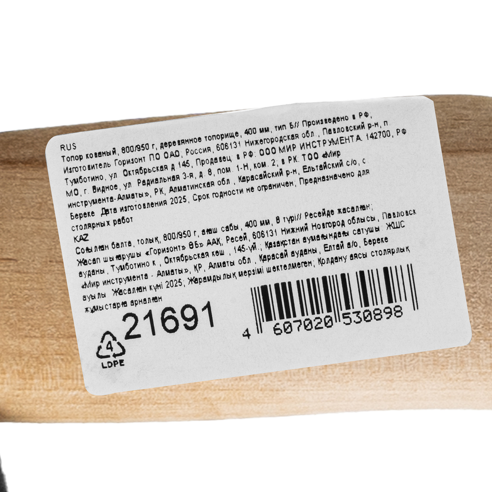 Топор кованный, в сборе, 800/950 г, деревянное топорище, 400 мм, Б2