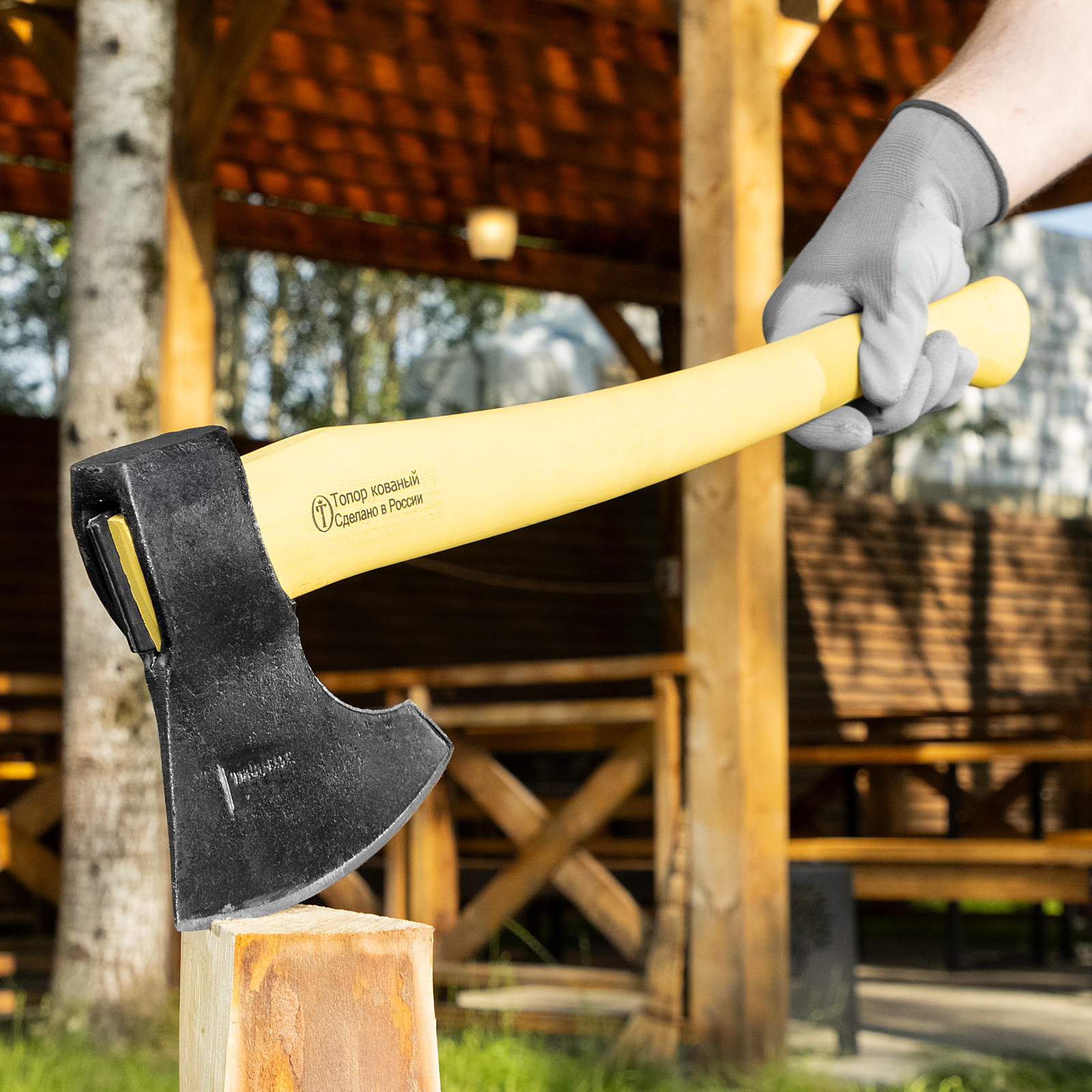 - Надежное топорище — древесина отшлифована, покрыта шпатлевкой и защитной пленкой.