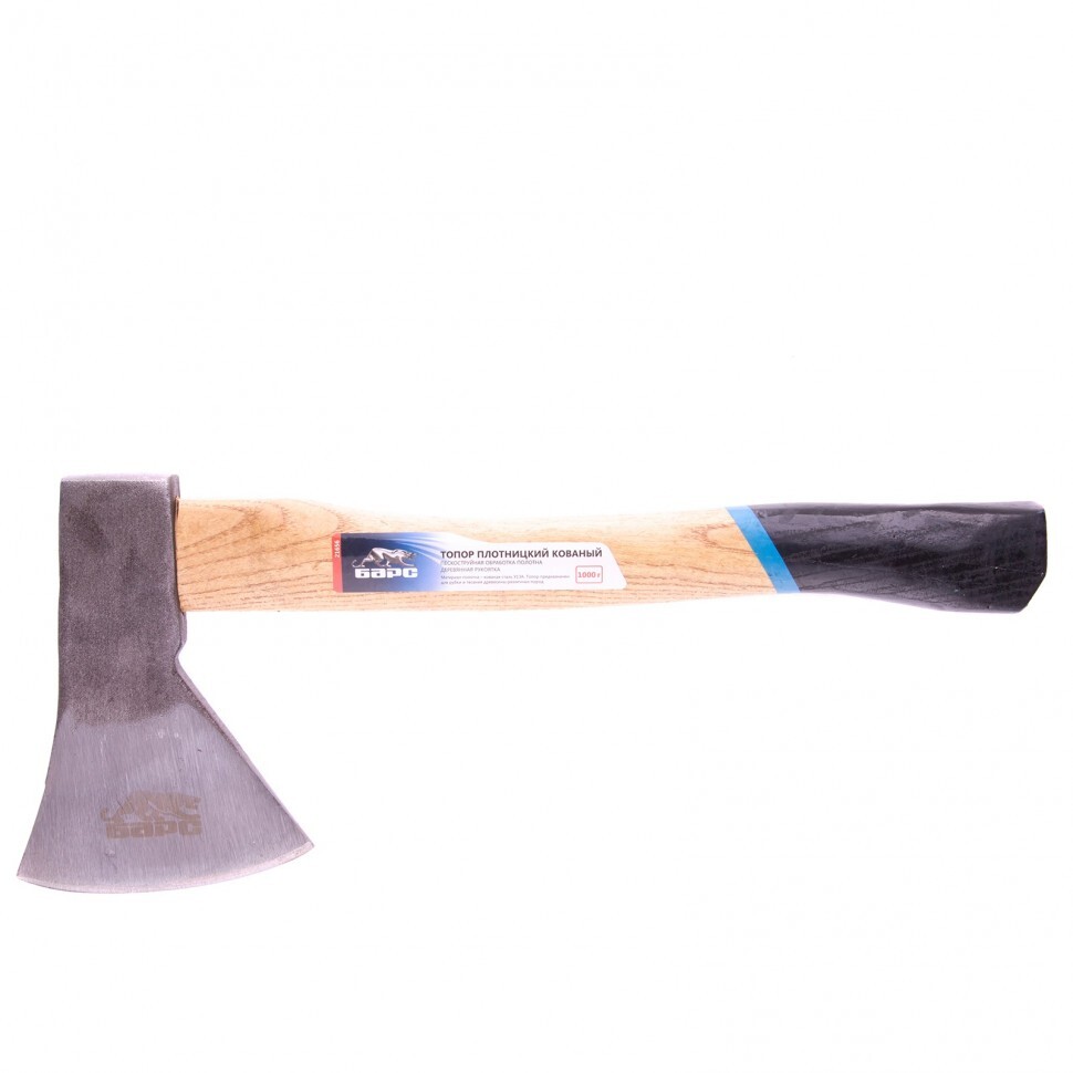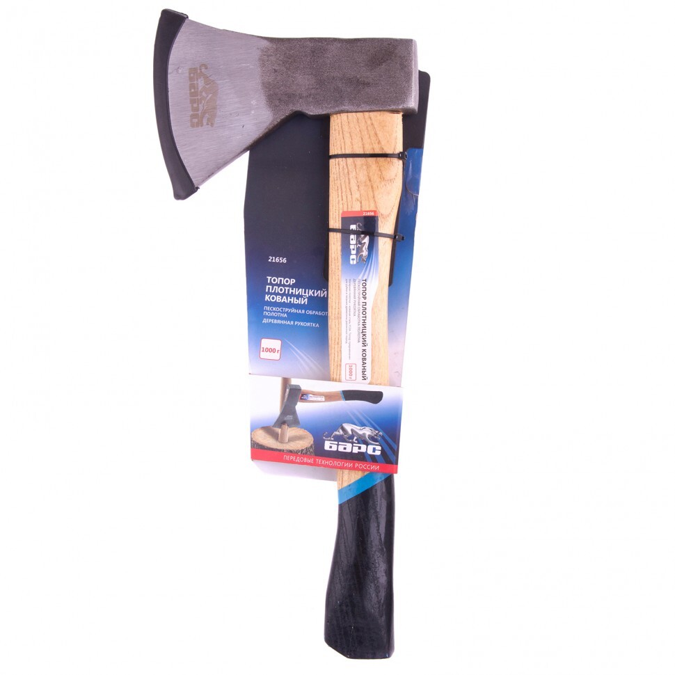 <p>Кованый плотницкий топор Барс 21656 с рабочей частью весом 1000 г имеет деревянную эргономичную рукоятку и полотно с пескоструйным покрытием, что гарантирует высокую эффективность и безопасность работы. Он используется при рубке и тесании древесины любых пород.</p><h2>Преимущества</h2><ul><li>Высокое качество — голова топора выполнена из углеродистой стали У13А.</li><li>Прочность и устойчивость к нагрузкам — полотно закалено до твердости 48-52 HRC (2,5 см от лезвия).</li><li>Продуманность до деталей — топорище выполнено из высококачественной древесины твердых пород и покрыто защитным лаком.</li><li>Длина рукоятки 405 мм — топор легко транспортировать в походном рюкзаке или небольшой сумке для инструмента.</li><li>Сильный удар — полотно весом 1000 г повышает скорость и эффективность работы.</li></ul>