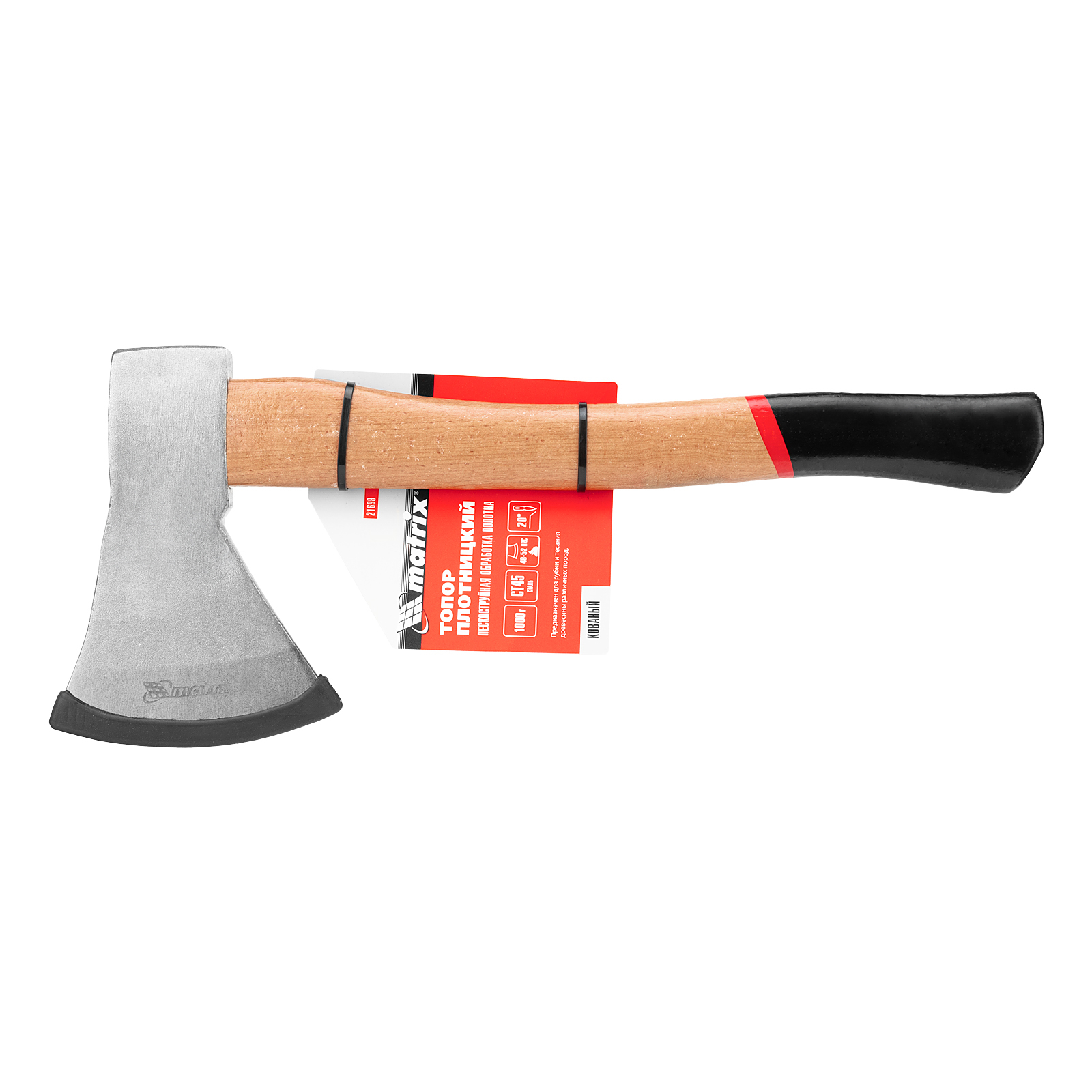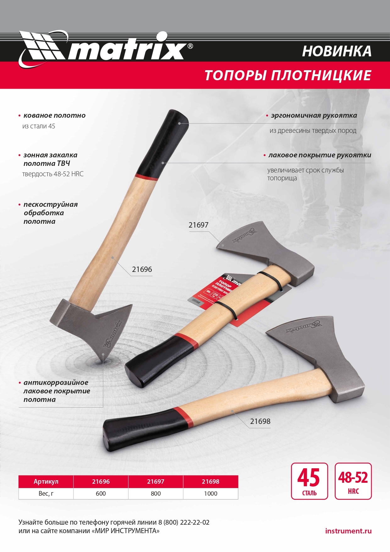 <p>Кованый плотницкий топор Matrix 21698 с весом рабочей части 1000 г имеет эргономичную деревянную рукоятку и пескоструйную обработку полотна. Топор используется при рубке и тесании древесины любых видов пород.</p><h2>Преимущества</h2><ul><li>Прочность и устойчивость к нагрузкам — голова топора выполнена из углеродистой стали 45, рабочие поверхности закалены до твердости 48-52 HRC</li><li>Высококачественное топорище — оно выполнено из древесины твердых лиственных пород и покрыто защитным лаком.</li><li>Небольшие габариты — топор не оказывает сильной нагрузки на руки, его легко транспортировать в походном рюкзаке или небольшой сумке для инструментов.</li></ul>