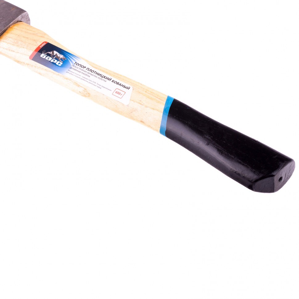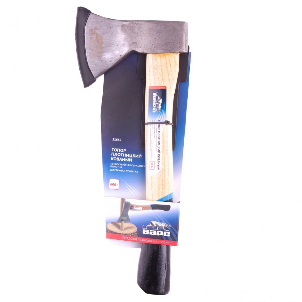 <p>Кованый плотницкий топор Барс 21652 с рабочей частью весом 600 г имеет деревянную эргономичную рукоятку и полотно с пескоструйным покрытием, что гарантирует высокую эффективность и безопасность работы. Он используется при рубке и тесании древесины любых пород.</p><h2>Преимущества</h2><ul><li>Высокое качество — голова топора выполнена из углеродистой стали У13А.</li><li>Прочность и устойчивость к нагрузкам — полотно закалено до твердости 48-52 HRC (2,5 см от лезвия).</li><li>Продуманность до деталей — топорище выполнено из высококачественной древесины твердых пород и покрыто защитным лаком.</li><li>Длина рукоятки 365 мм — топор легко транспортировать в походном рюкзаке или небольшой сумке для инструментов.</li><li>Комфортная работа — полотно весом 600 г не оказывает большой нагрузки на руки, поэтому топор удобен.</li></ul>