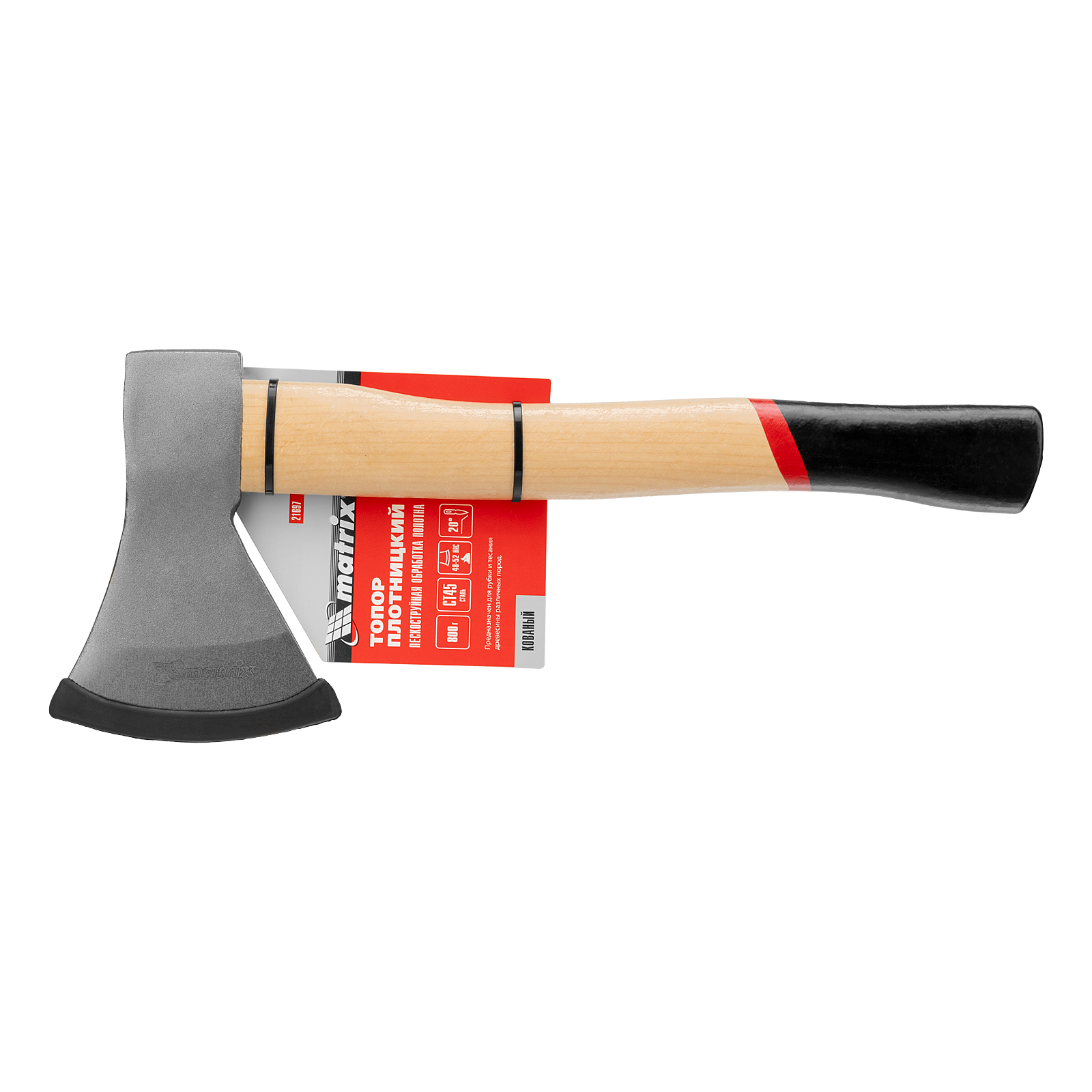 <p>Кованый плотницкий топор Matrix 21697 с весом рабочей части 800 г имеет эргономичную деревянную рукоятку и пескоструйную обработку полотна. Топор используется при рубке и тесании древесины любых видов пород.</p><h2>Преимущества</h2><ul><li>Прочность и устойчивость к нагрузкам — голова топора выполнена из углеродистой стали 45, рабочие поверхности закалены до твердости 48-52 HRC</li><li>Высококачественное топорище — оно выполнено из древесины твердых лиственных пород и покрыто защитным лаком.</li><li>Небольшие габариты — топор не оказывает сильной нагрузки на руки, его легко транспортировать в походном рюкзаке или небольшой сумке для инструментов.</li></ul>