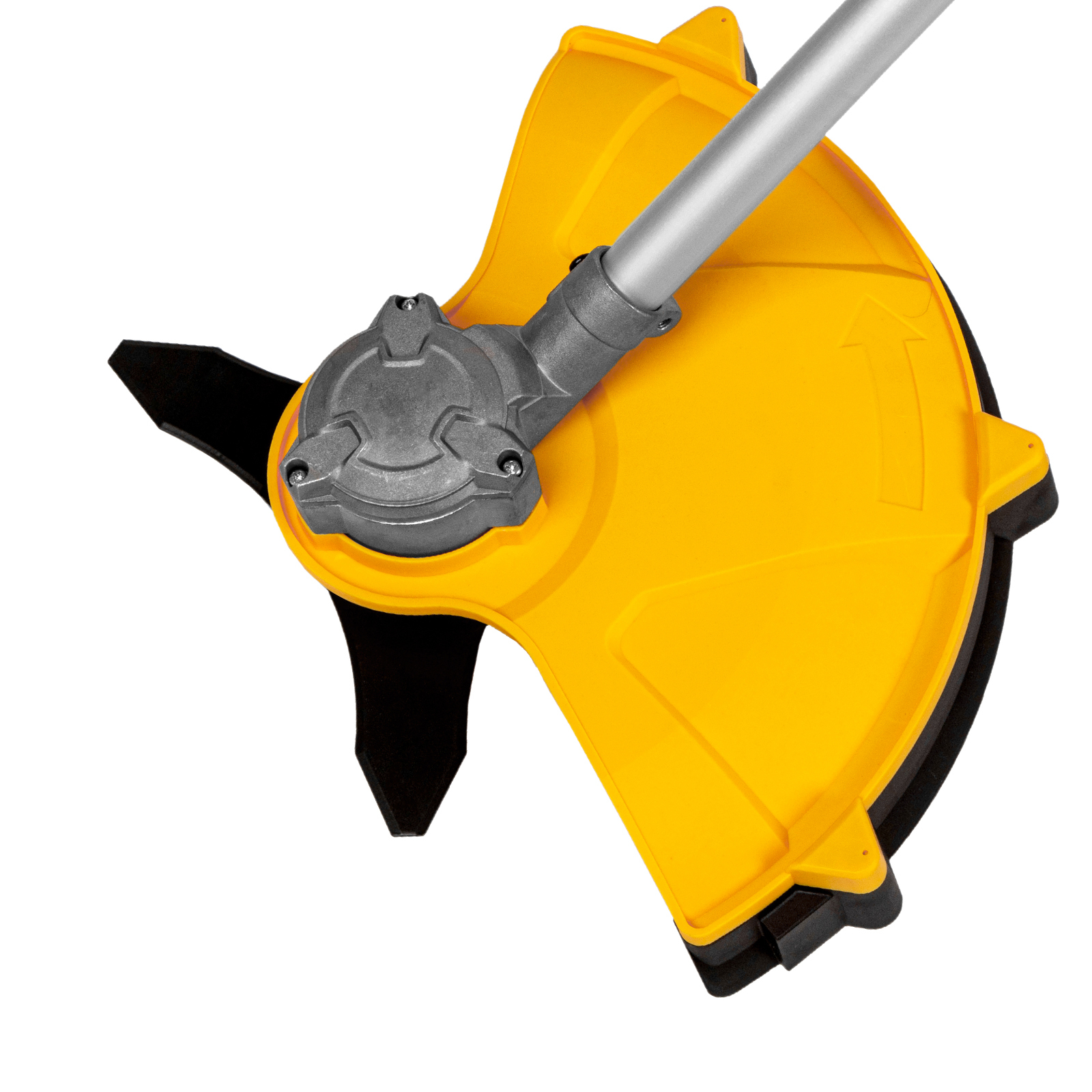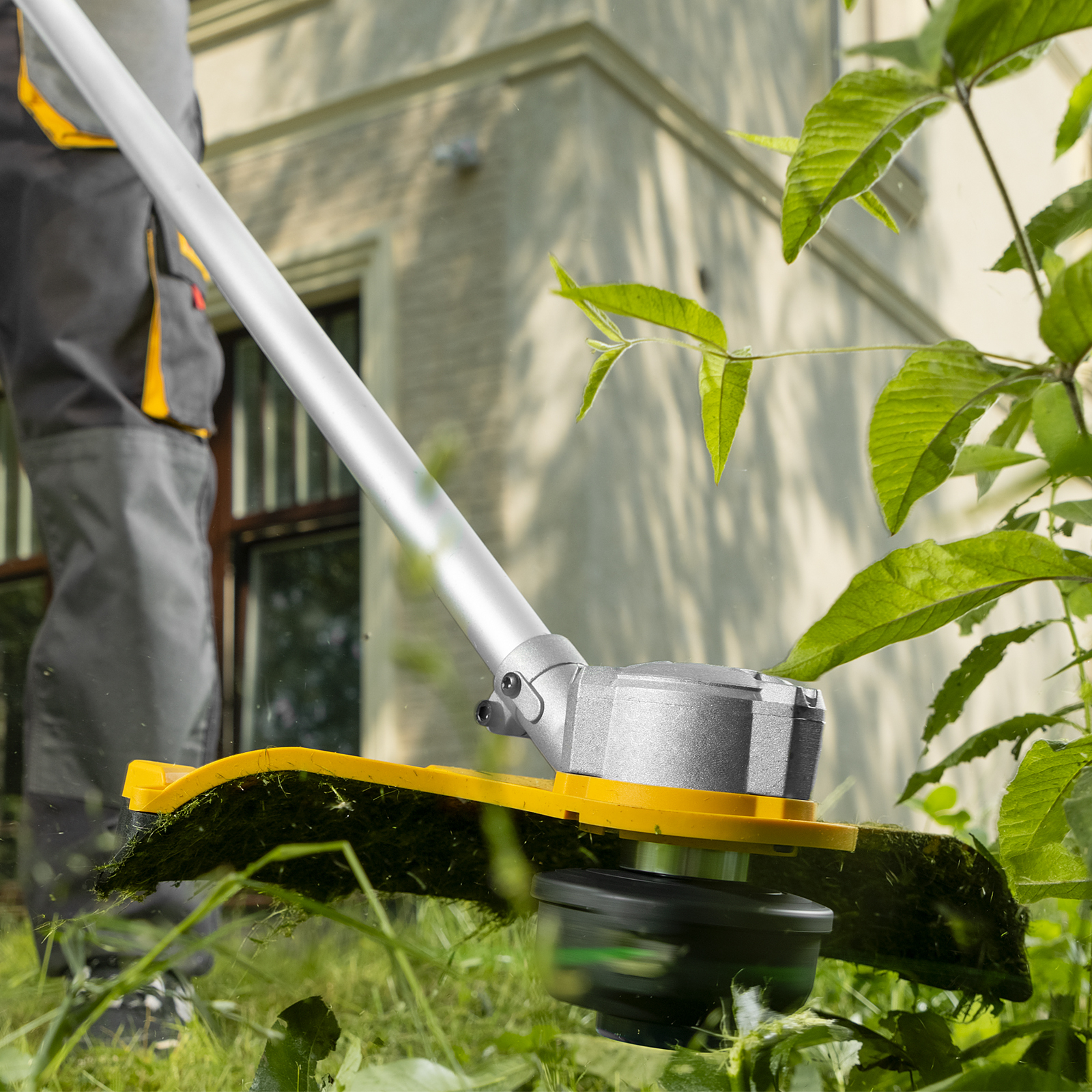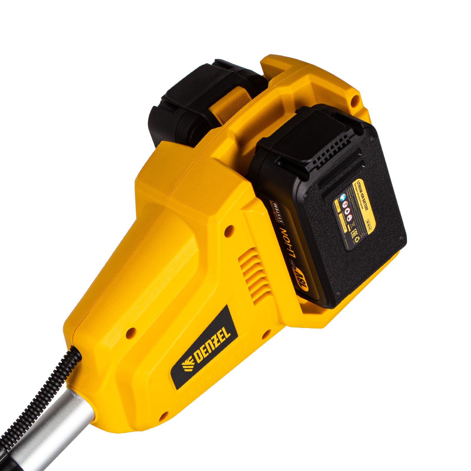 Аккумуляторный бесщеточный триммер Denzel CBC350-36 58720 с двумя батареями Li-ion, 36 В, используется для скашивания густой травы, сорняков и мелкого кустарника на приусадебном участке. В качестве оснастки используется катушка с леской диаметром 2 мм и трехлопастный нож. Ширина скашивания леской составляет 350 мм, ножом — 250 мм.,Триммер работает от двух аккумуляторов увеличенной емкости с интеллектуальной системой распознавания типа нагрузки. Бесщеточный электродвигатель обеспечивает частоту вращения шпули со скоростью 6500 об/мин — этого достаточно для эффективного решения поставленных задач. Т.к. техника не зависит от электросети, работать можно даже в самых отдаленных участках сада.