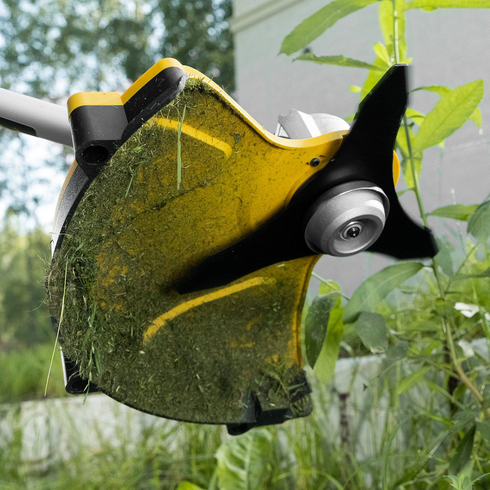 - Комфортная работа — благодаря продуманной форме рукояток и малому весу триммера 3,8 кг его удобно удерживать в руках и маневрировать на сложных участках.