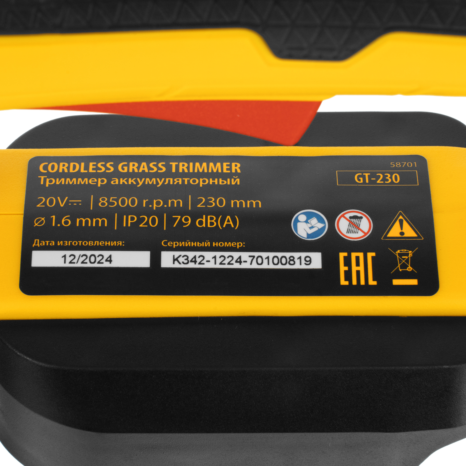 Триммер аккумуляторный GT-230, 230 мм, Li-Ion, 20 В Denzel
