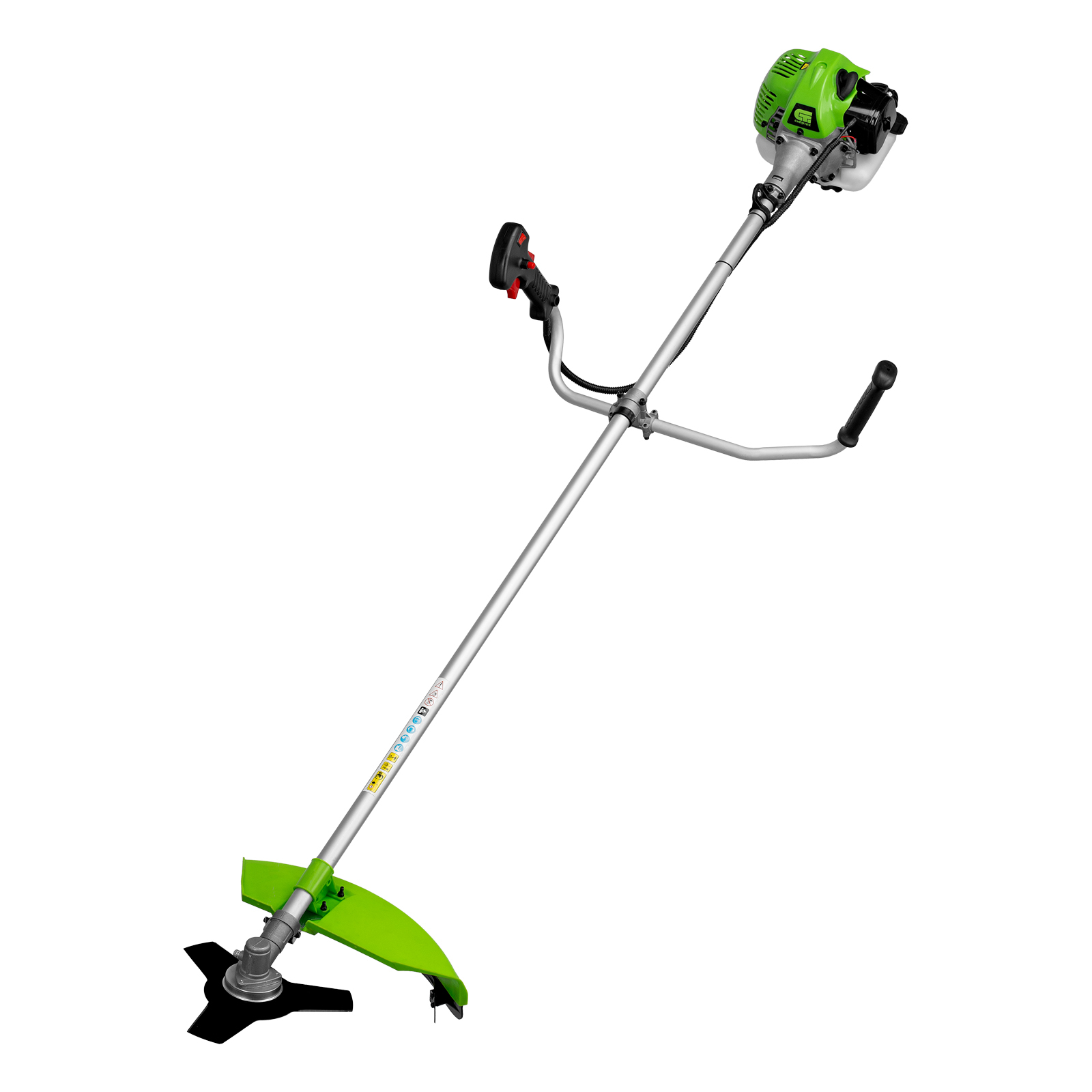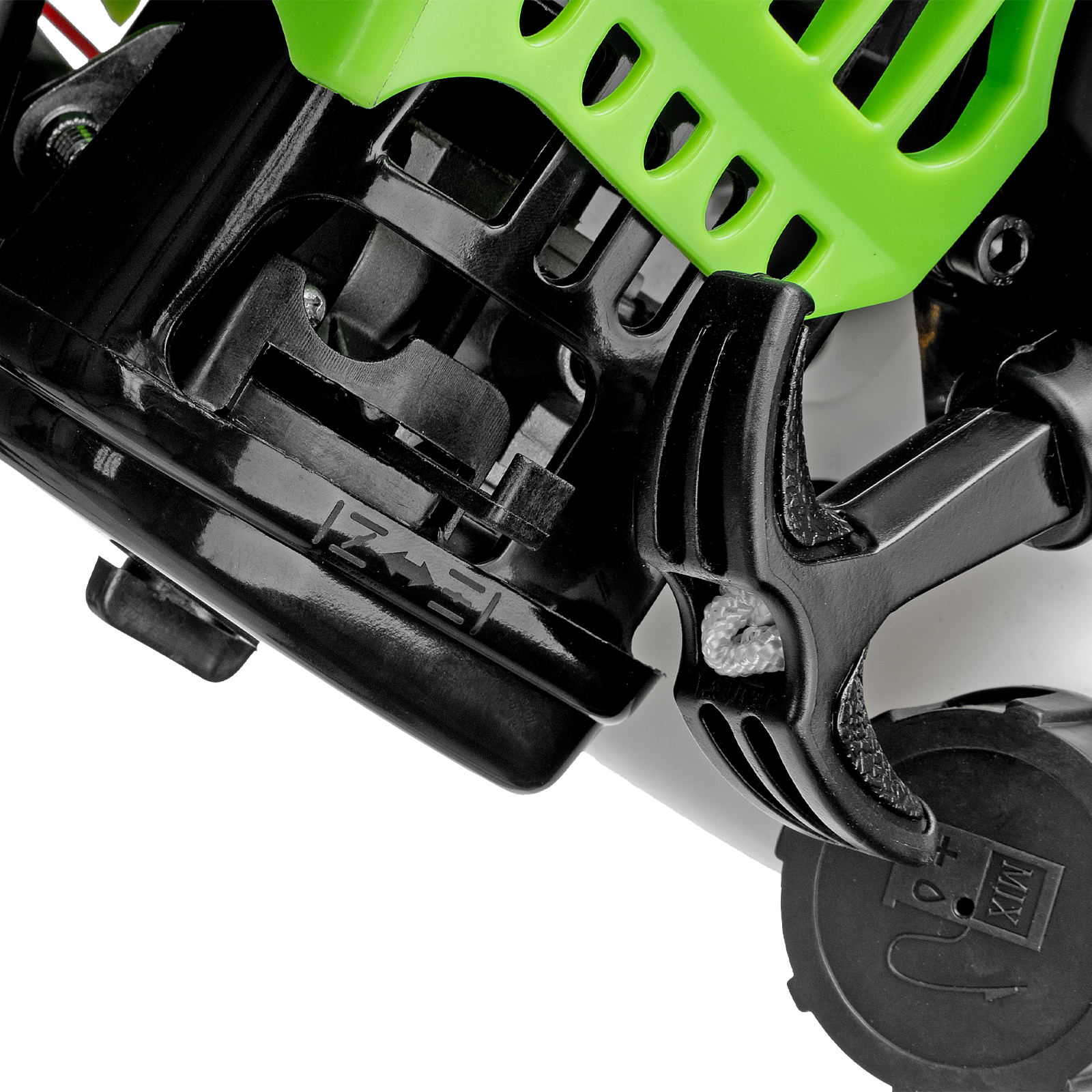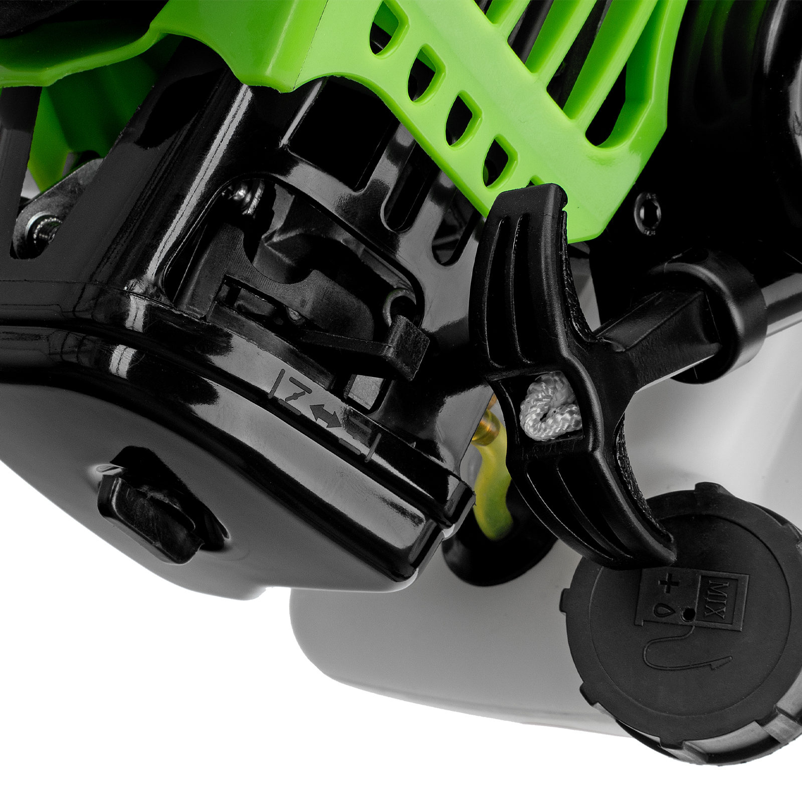 - Безопасность — блокиратор курка газа не дает случайно запустить триммер, прочный кожух защищает пользователя от летящих веток и камней.