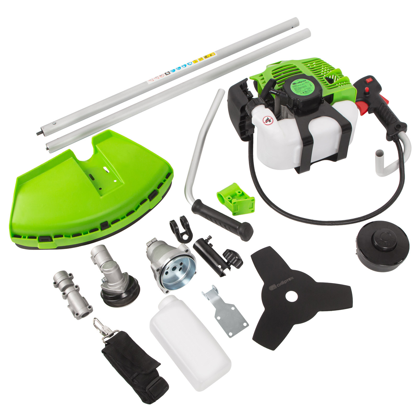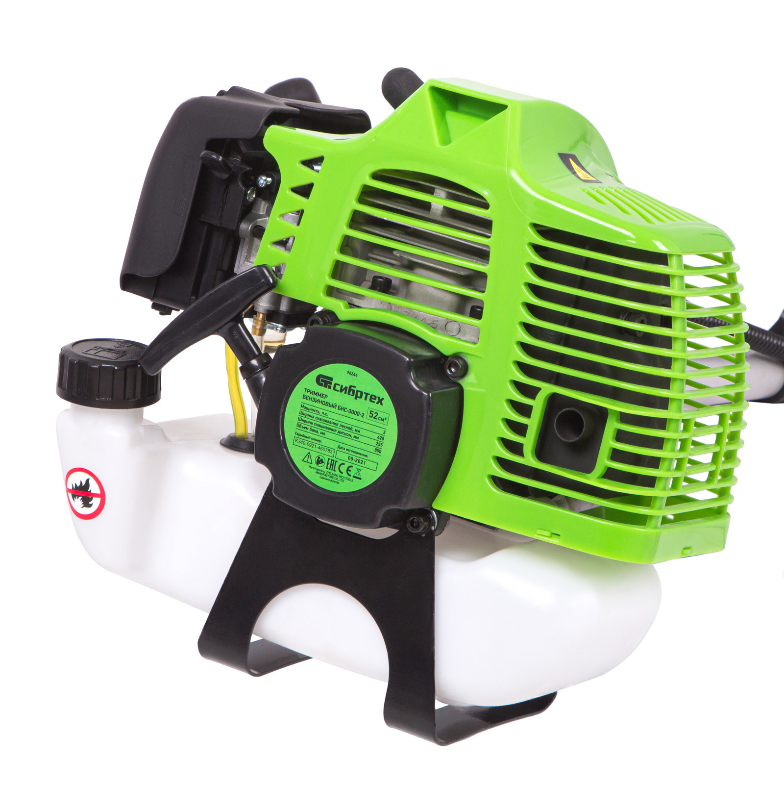 Бензиновый триммер Сибртех БКС-3000-2 96246 с разъемной штангой из 2 частей, оснащенный двигателем объемом 52 куб. см и мощностью 3 л. с., предназначен для срезания высокой травы, выравнивания газонов, прореживания бурьяна, удаления сорняков. Также его можно использовать для заготовки сена или для ухода за придомовой территорией. Частота вращения шпинделя составляет 9500 об/мин, что обеспечивает высокую производительность триммера. В комплект входит усиленная полуавтоматическая катушка из полипропилена и трехлопастный нож. Катушкой с леской можно выравнивать газон, подрезать кустарники, создавать ландшафт. Нож поможет избавиться от жесткой травы и сорняков. За один проход леска делает срез шириной 42 см, а нож — 25,5 см, поэтому обработка участка не займет много времени.
