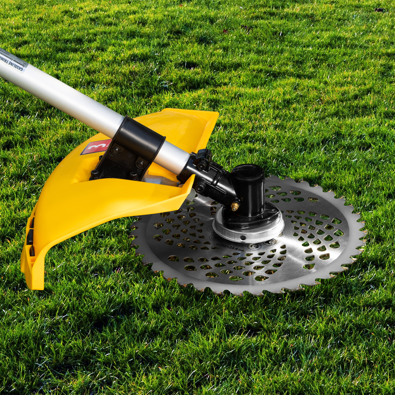 - Дополнительные возможности — можно приобрести и установить на триммер диск Denzel 96323 с шириной скашивания 230 мм для быстрого удаления растительности с жесткими стеблями (полыни, крапивы, лебеды), 96328 для скашивания молодых побегов кустарника диаметром до 3 мм.
