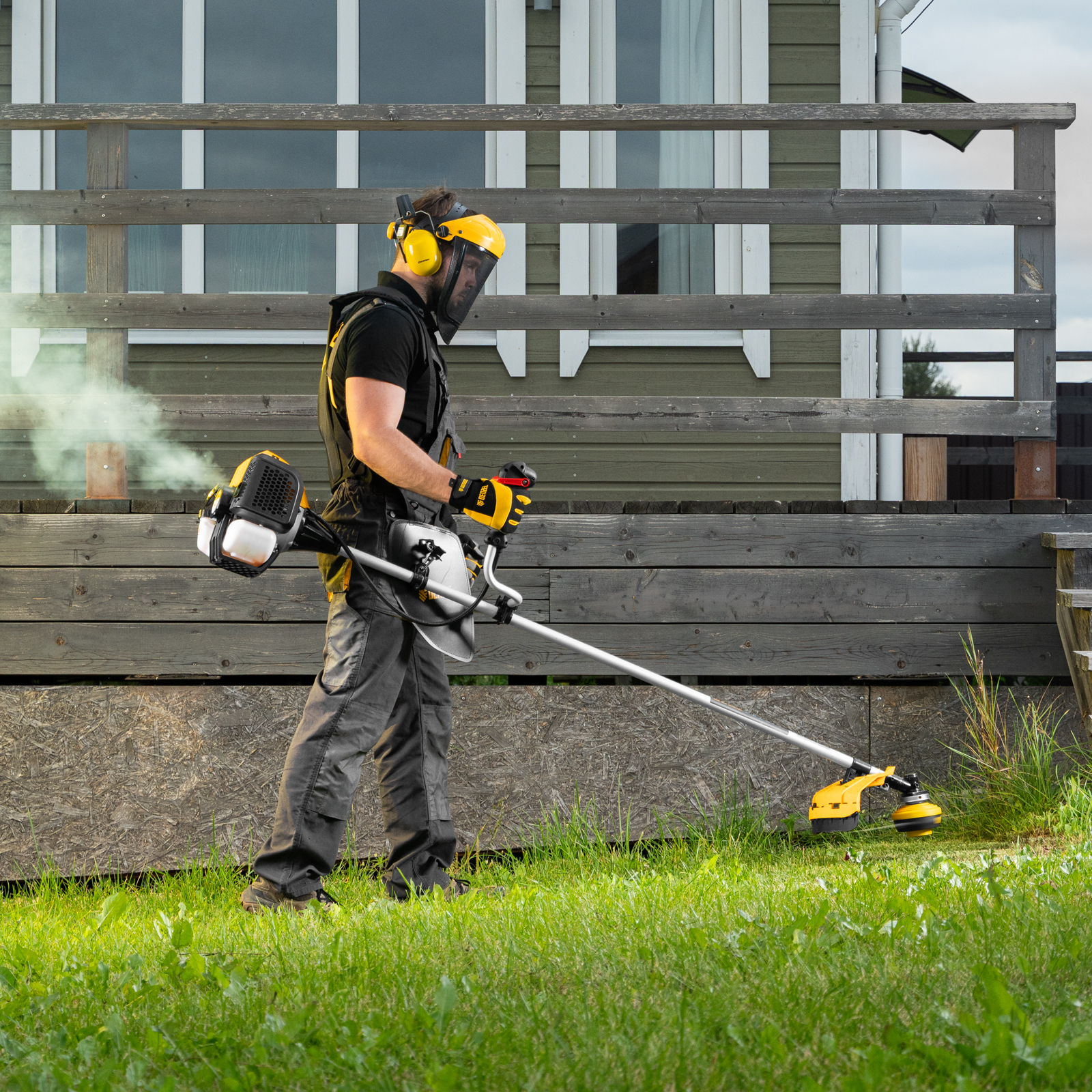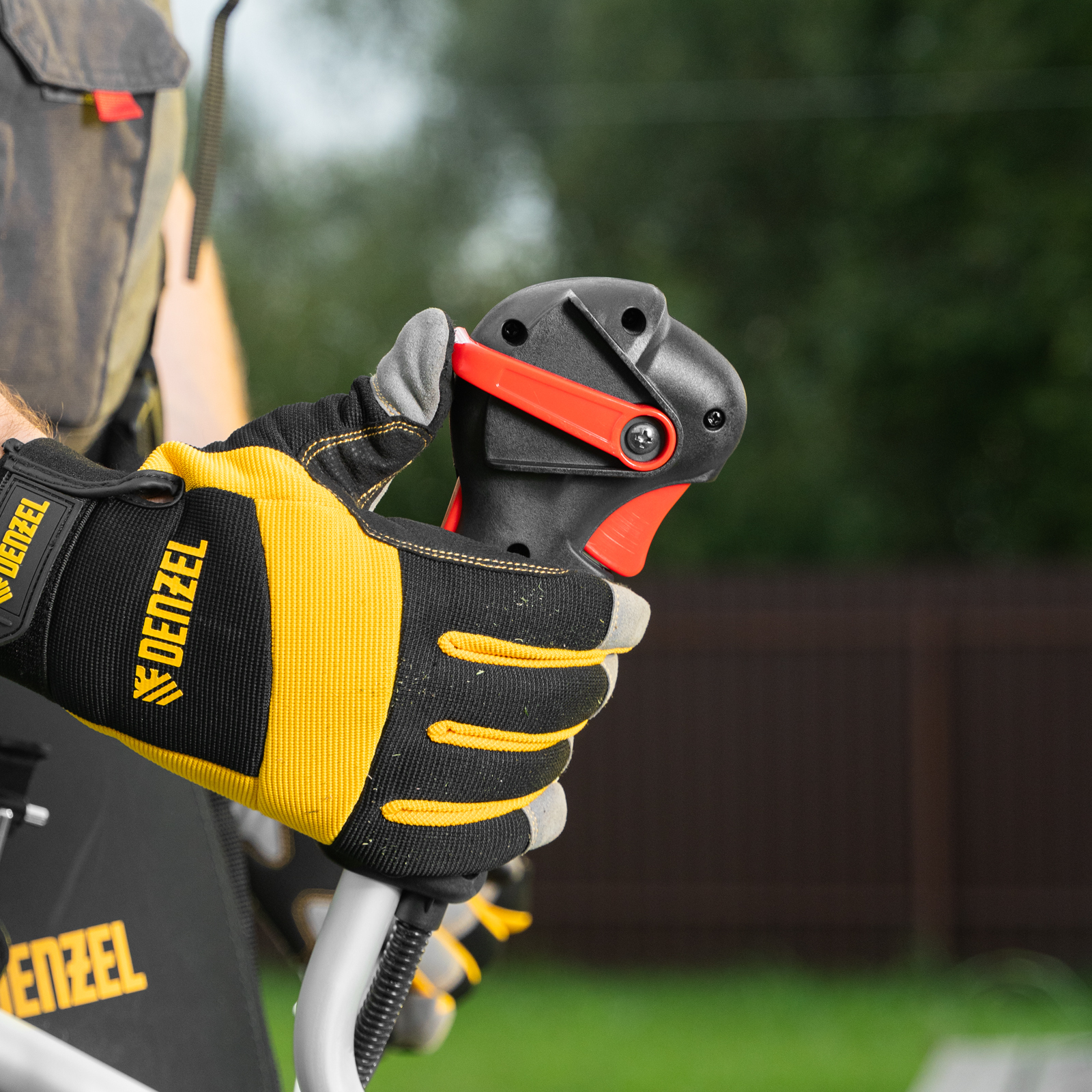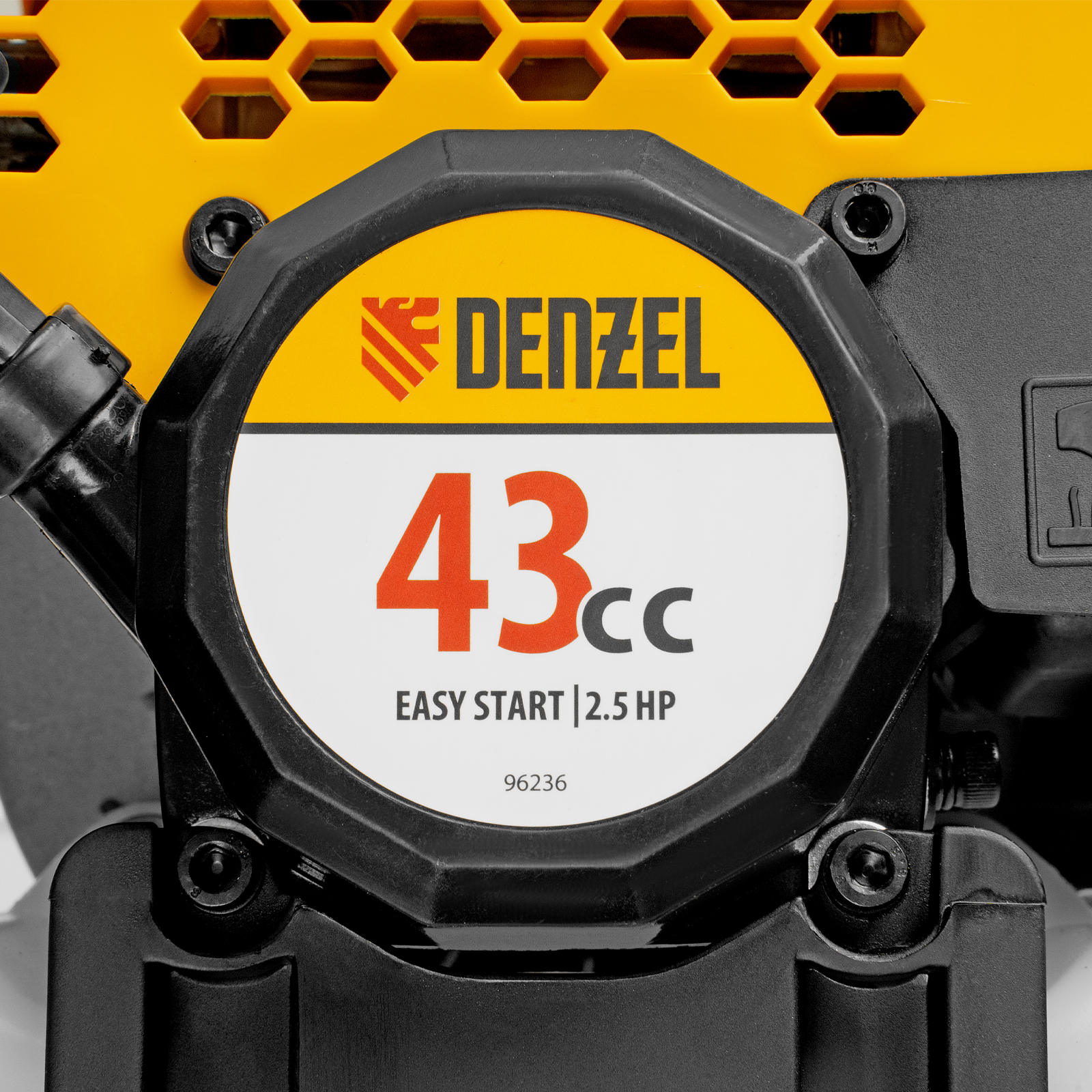 Бензиновый триммер Denzel DGT-430 96236 с двигателем объемом 43 см3 и мощностью 2,5 л.с., с неразъемной штангой, состоит из 2 частей. Предназначен для скашивания густой травой и создания аккуратных лужаек, подходит для скашивания травы всех типов, в том числе с жесткими древовидными стеблями (полыни, крапивы, лебеды, борщевика), а также срезания кустарника и молодых побегов деревьев с диаметром стволов до 10 мм. Подходит для мест, в которых с обычными газонокосилками работать тяжело. Экономичный двигатель позволяет эффективно обрабатывать участок площадью до 9-10 соток.,В комплект поставки входят режущие насадки: усиленная полиамидная катушка, трехлопастный нож и пильный диск.