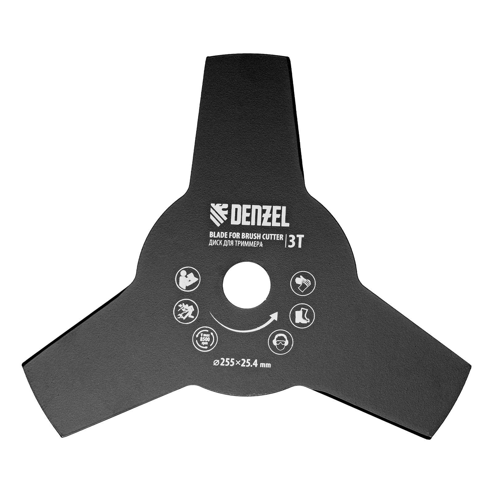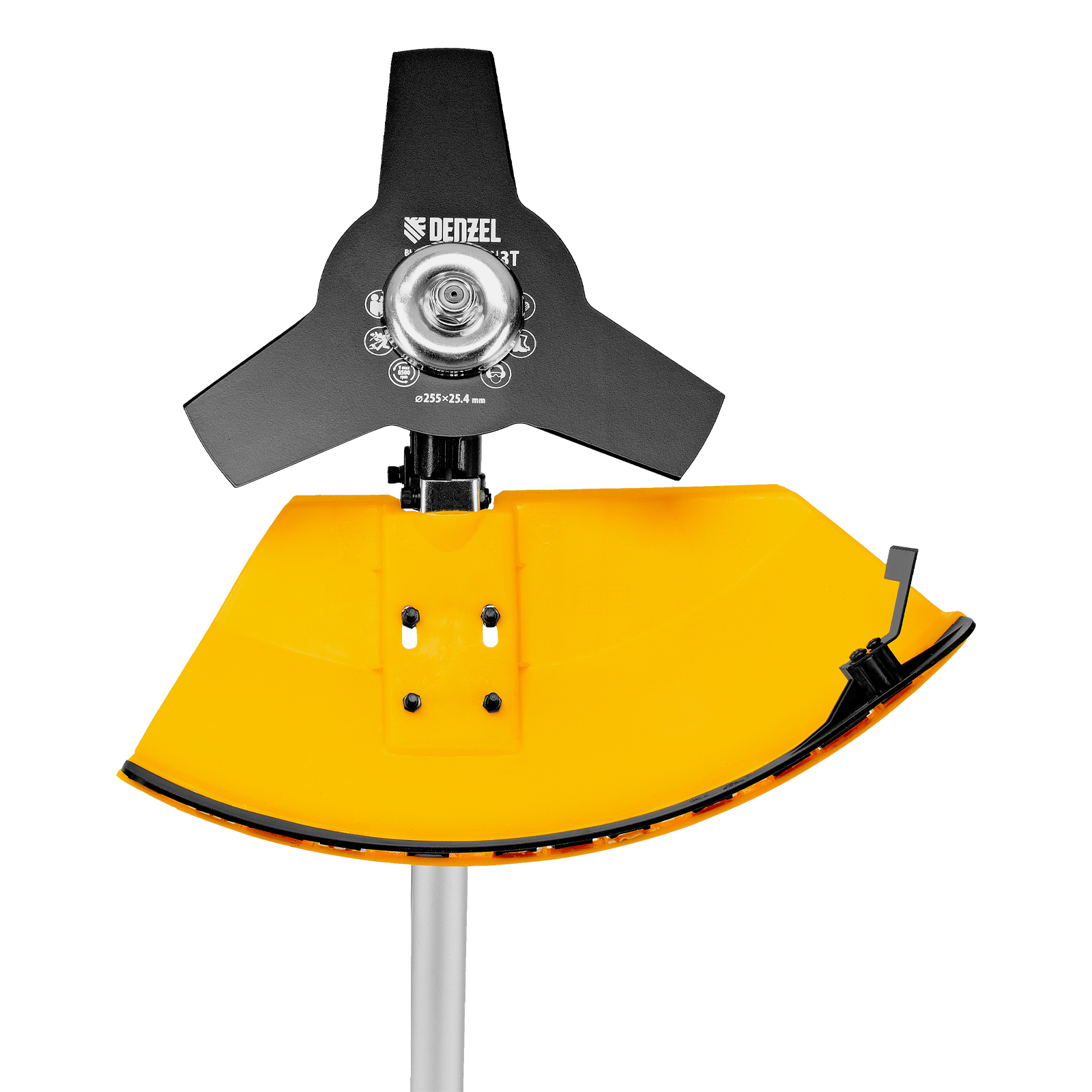 - Дополнительные возможности — можно приобрести и установить на триммер диск Denzel 96323 для быстрого удаления растительности с жесткими стеблями или 96328 для скашивания молодых побегов кустарника диаметром до 3 мм.