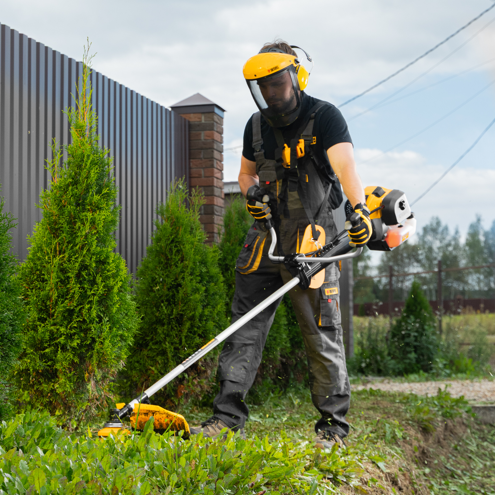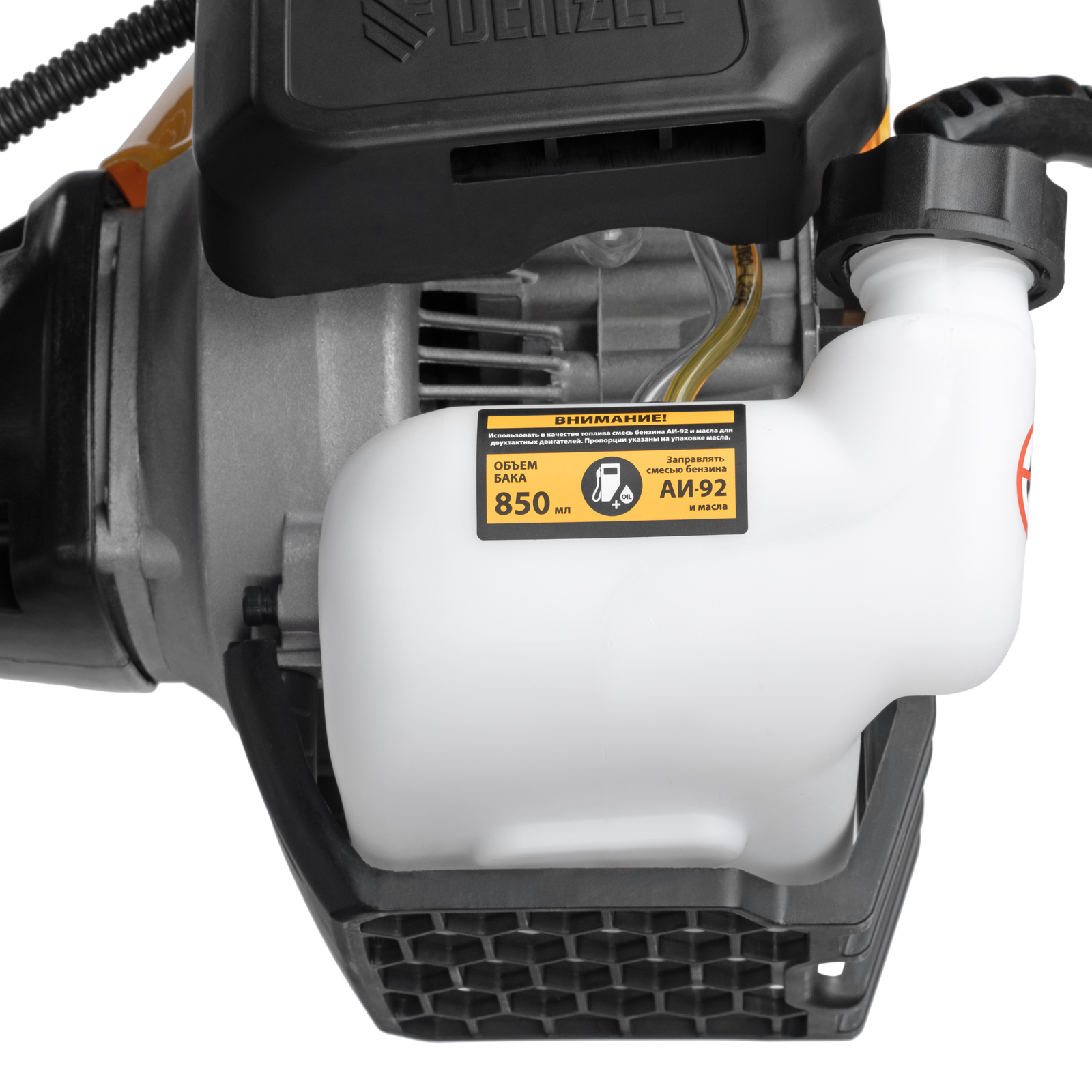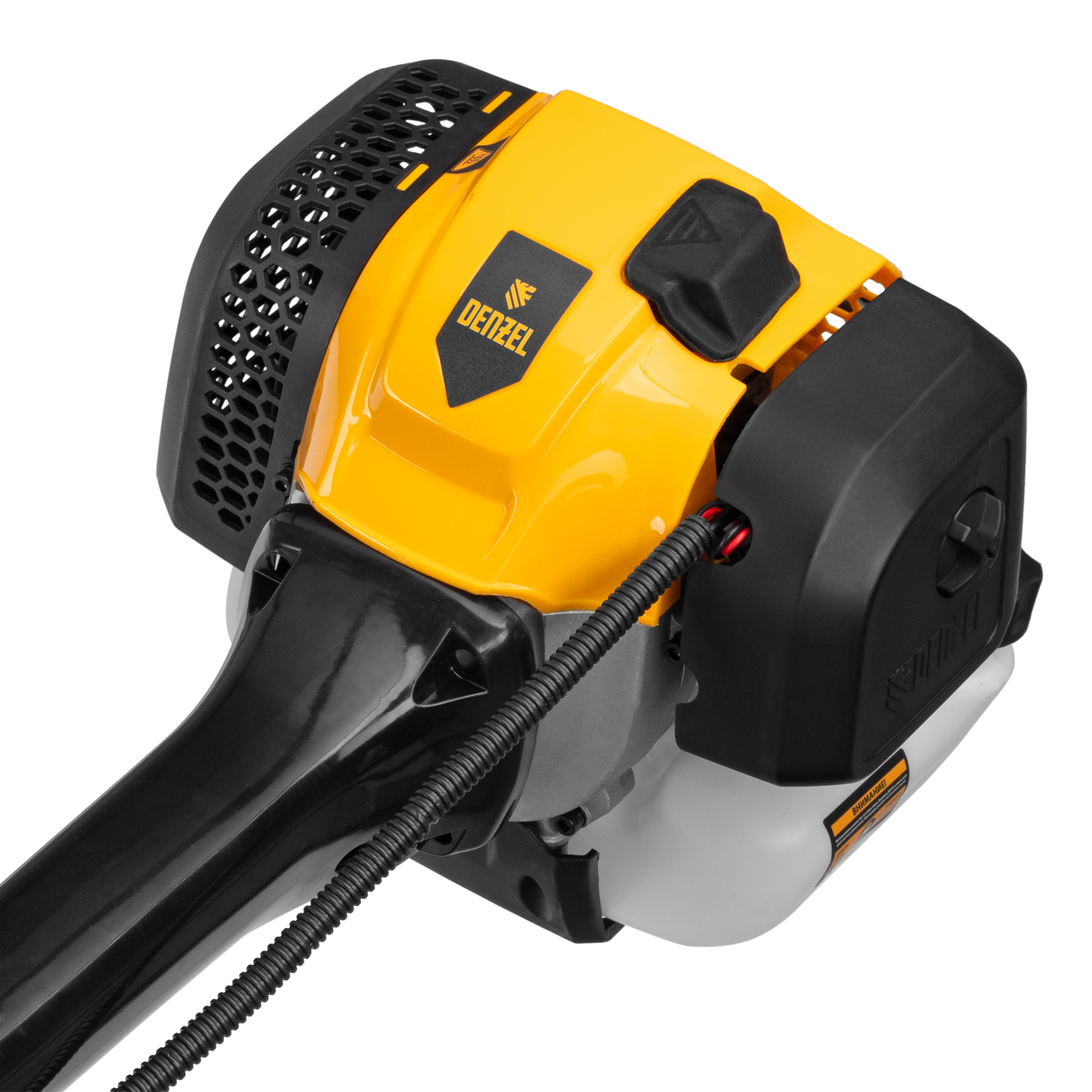 Бензиновый триммер Denzel DGT-52-PRO 96278 с системой анти-вибро и неразъемной штангой состоит из 2 частей и оснащен мощным двигателем объемом 52 куб. см. Способен скашивать не только газонную траву, но и растительность с жесткими древовидными стеблями (полынь, крапиву, лебеду, борщевик), а также срезать кустарник и молодые побеги деревьев со стволами диаметром до 10 мм. Для этих целей предназначены полуавтоматическая катушка с леской, трехлопастный нож и пильный диск.
