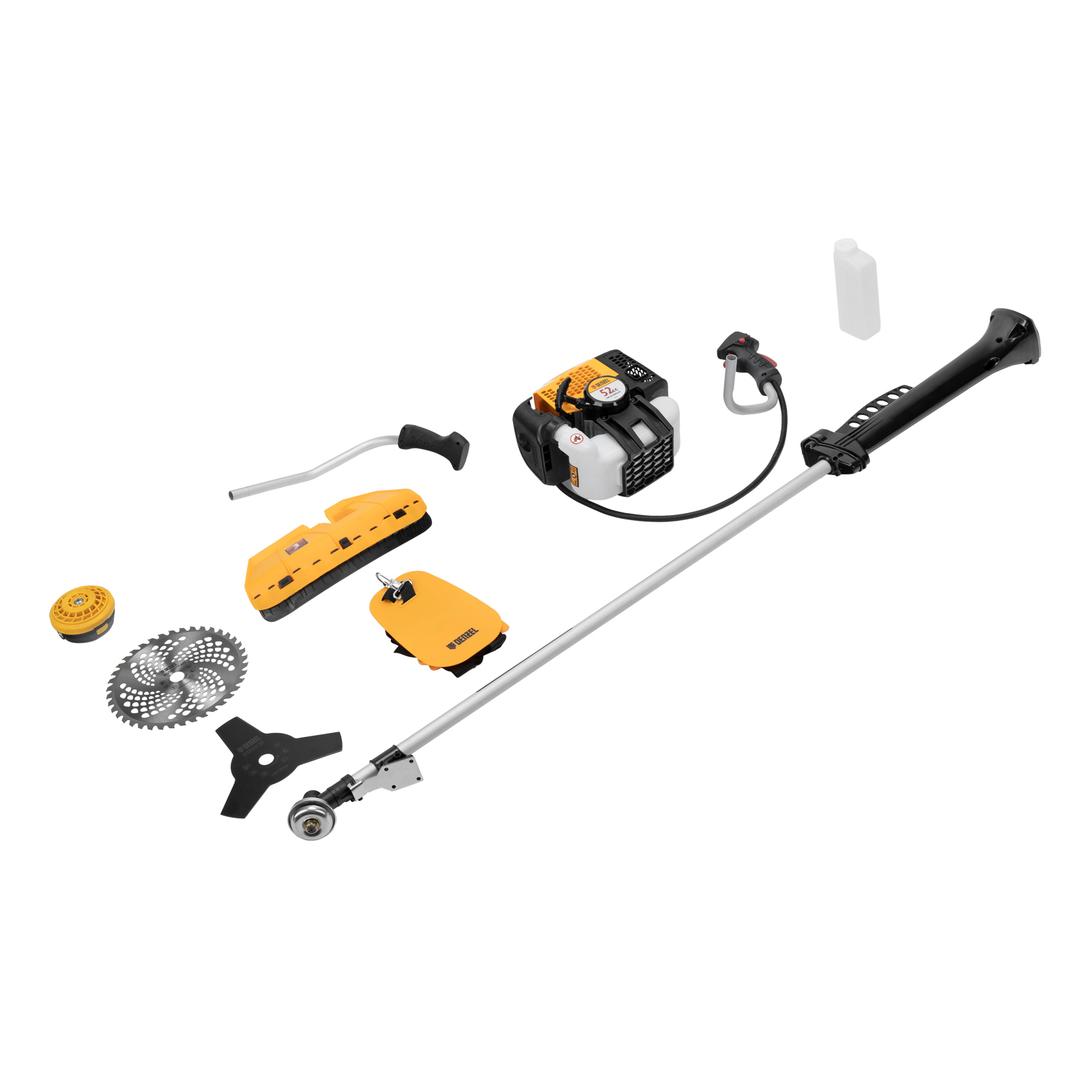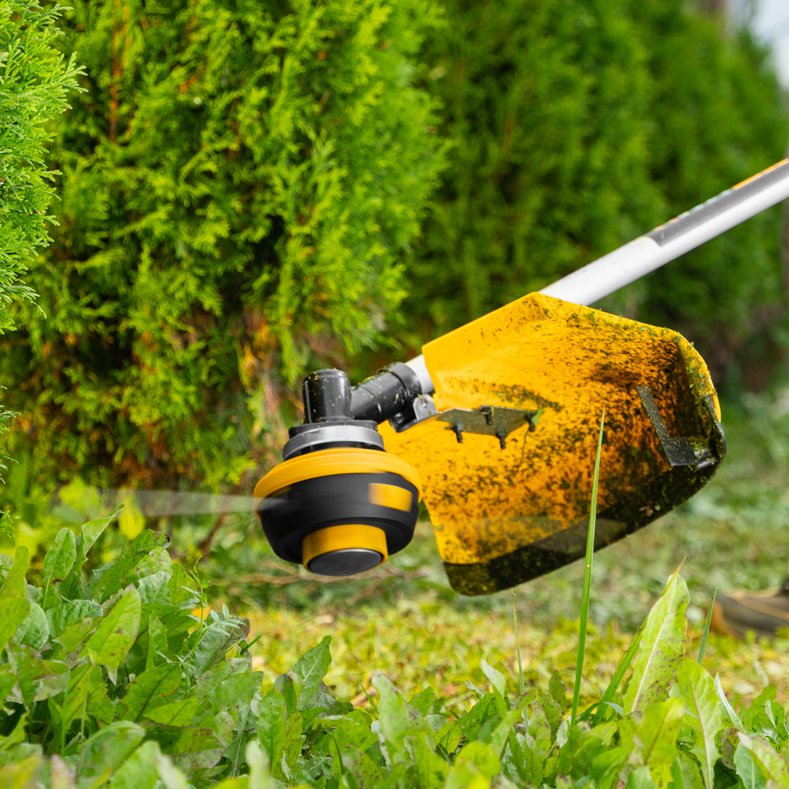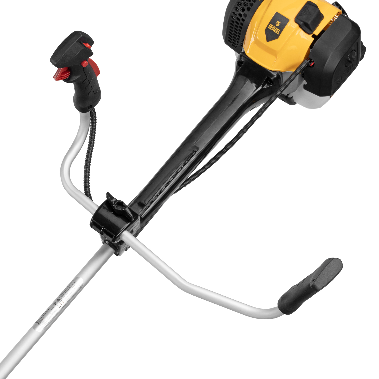 Бензиновый триммер Denzel DGT-52-PRO 96278 с системой анти-вибро и неразъемной штангой состоит из 2 частей и оснащен мощным двигателем объемом 52 куб. см. Способен скашивать не только газонную траву, но и растительность с жесткими древовидными стеблями (полынь, крапиву, лебеду, борщевик), а также срезать кустарник и молодые побеги деревьев со стволами диаметром до 10 мм. Для этих целей предназначены полуавтоматическая катушка с леской, трехлопастный нож и пильный диск.