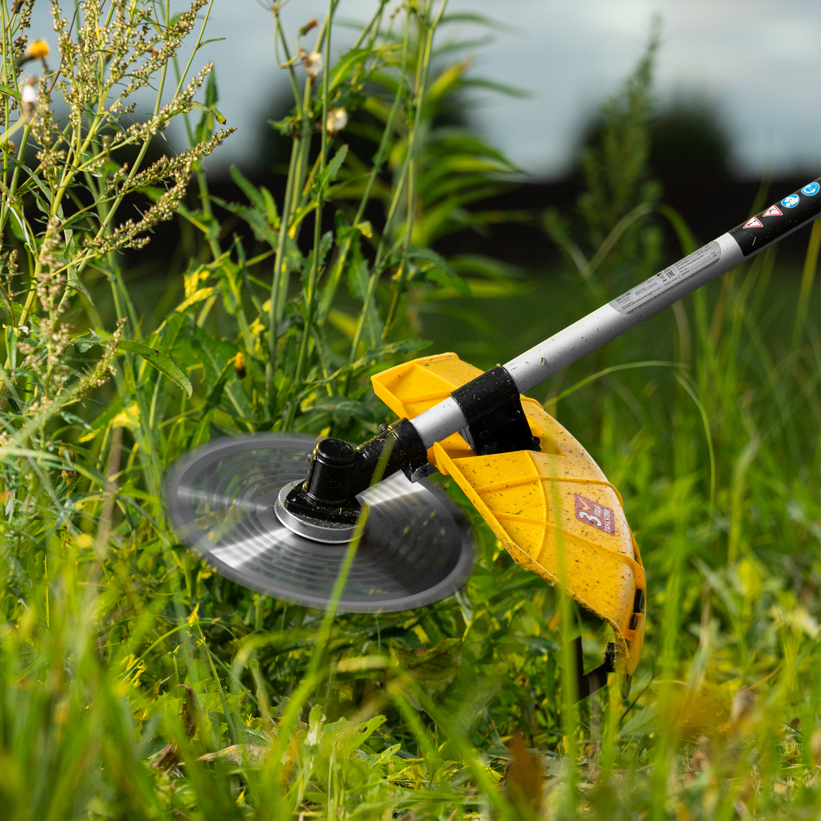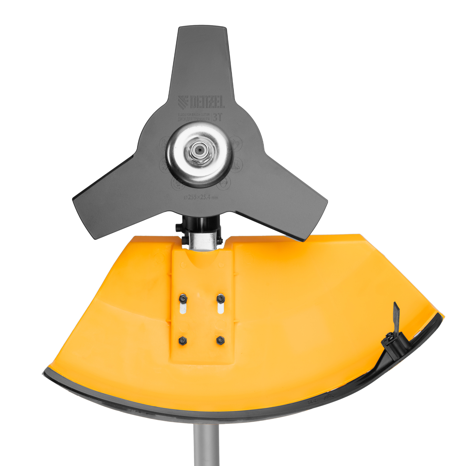 - Дополнительные возможности — можно приобрести и установить на триммер диск Denzel 96323 с шириной скашивания 230 мм для быстрого удаления растительности с жесткими стеблями, 96328 для скашивания молодых побегов кустарника диаметром до 3 мм.