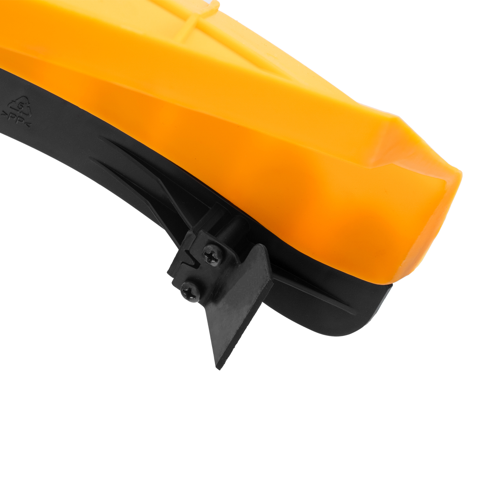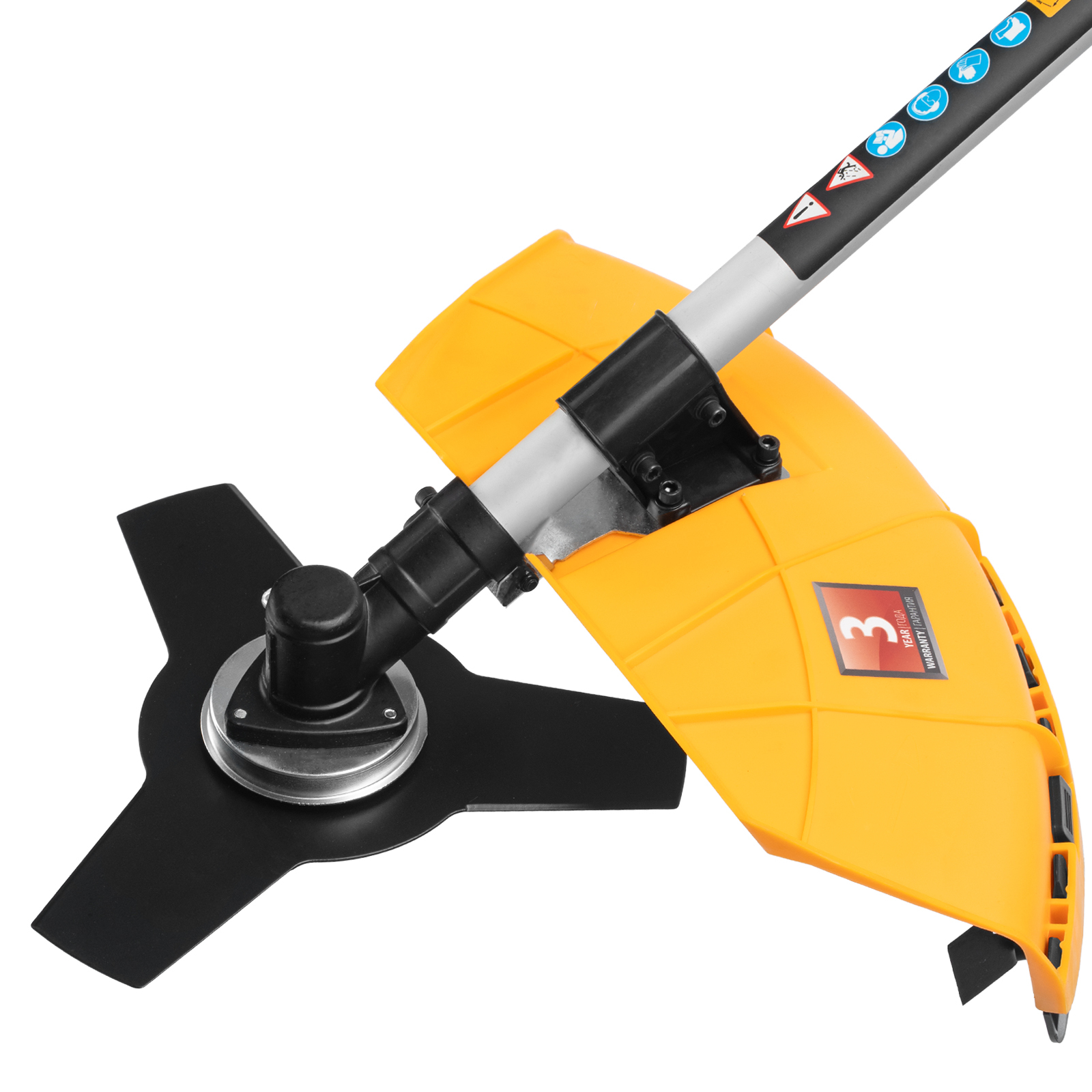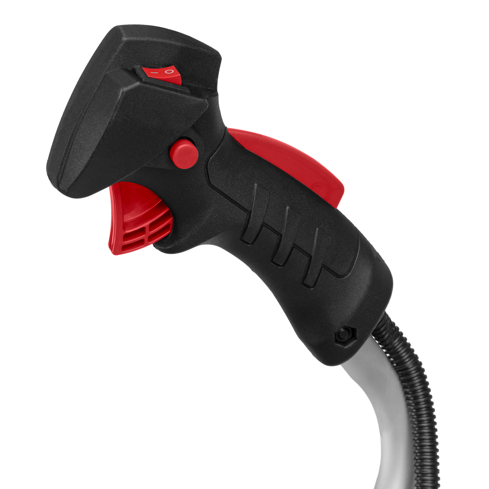 - Безопасность — защитный кожух из прочного пластика закрывает режущую часть, а блокиратор курка газа исключает случайный запуск двигателя.