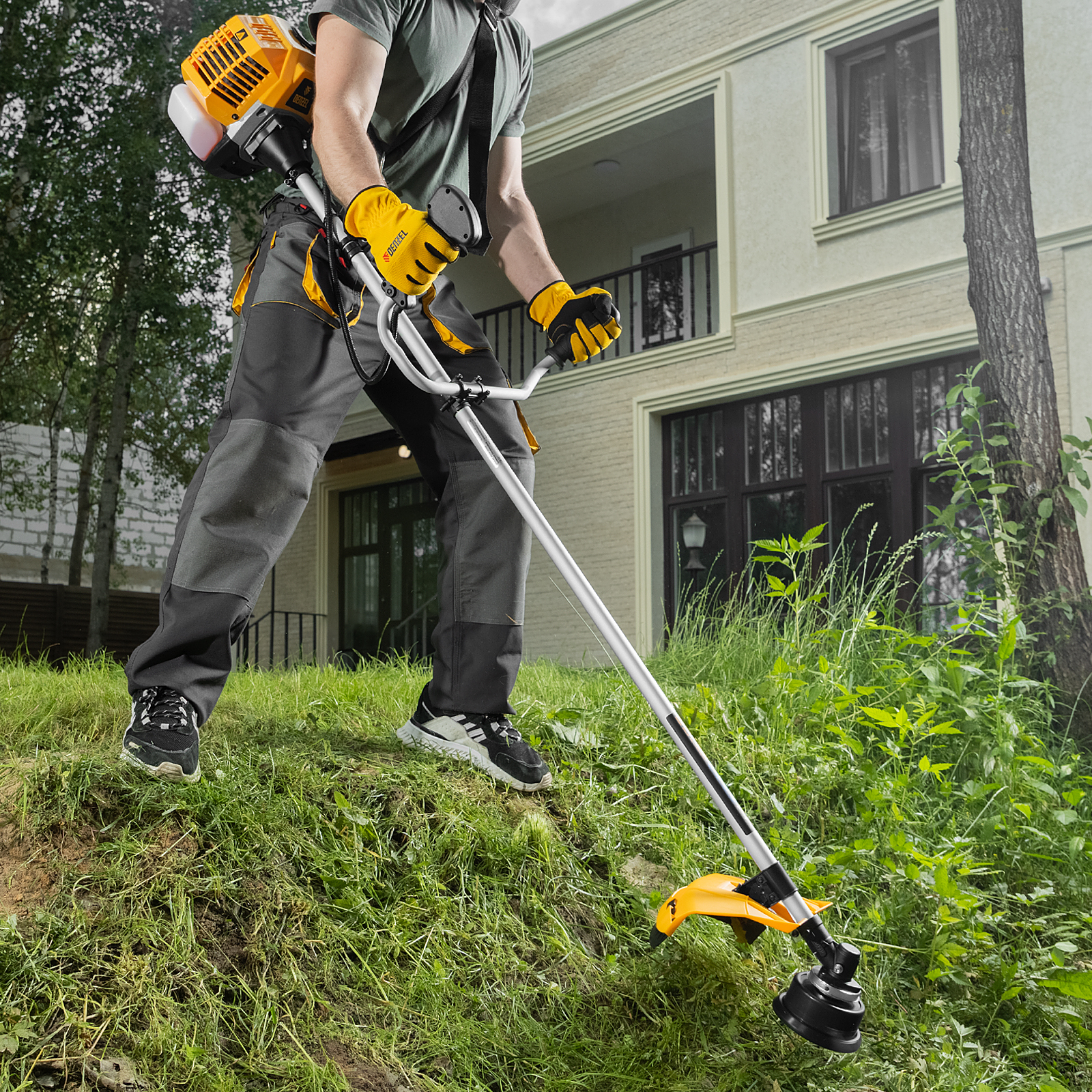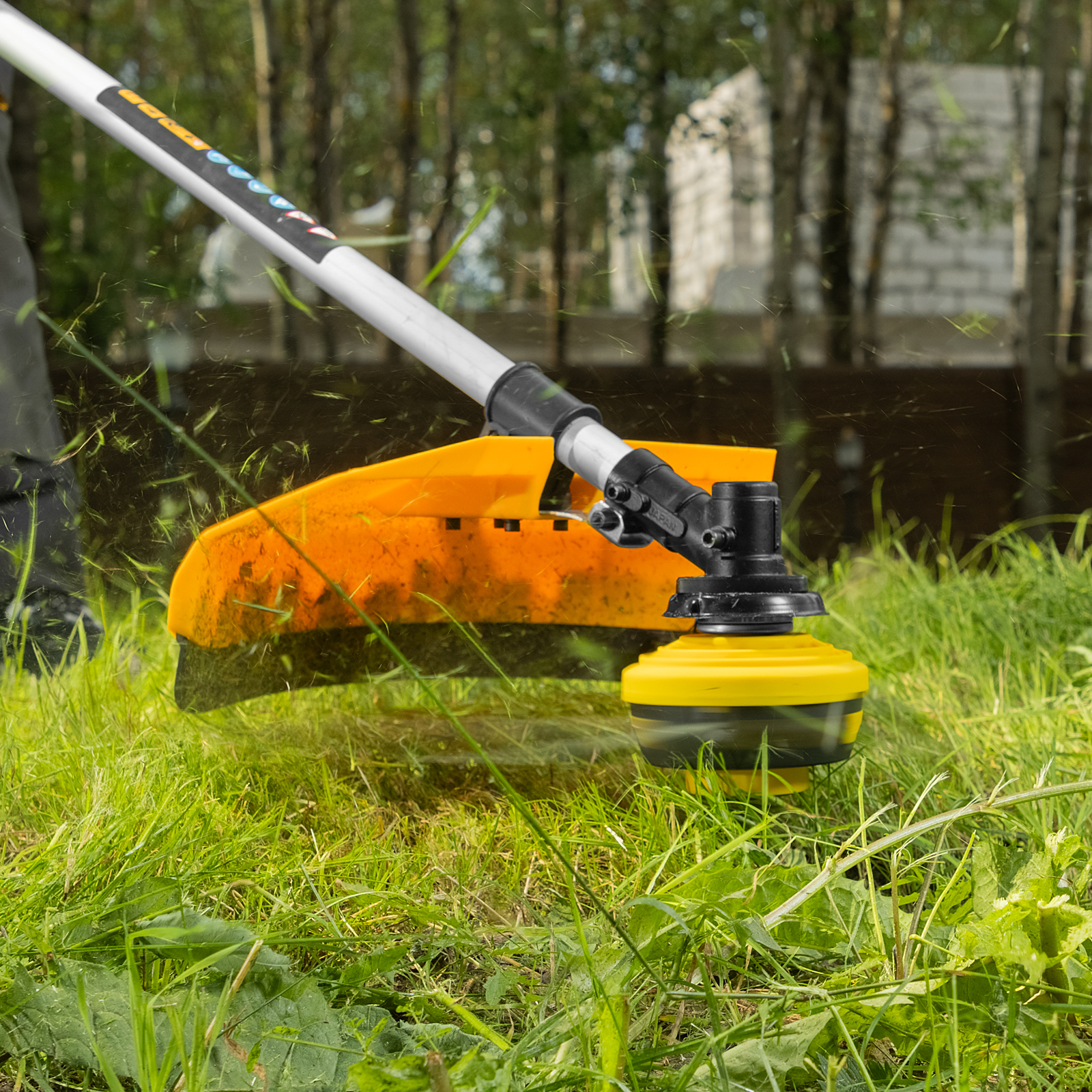 - Разгрузка позвоночника — одноплечевой ремень перераспределяет вес триммера, обеспечивая комфорт во время длительной работы.