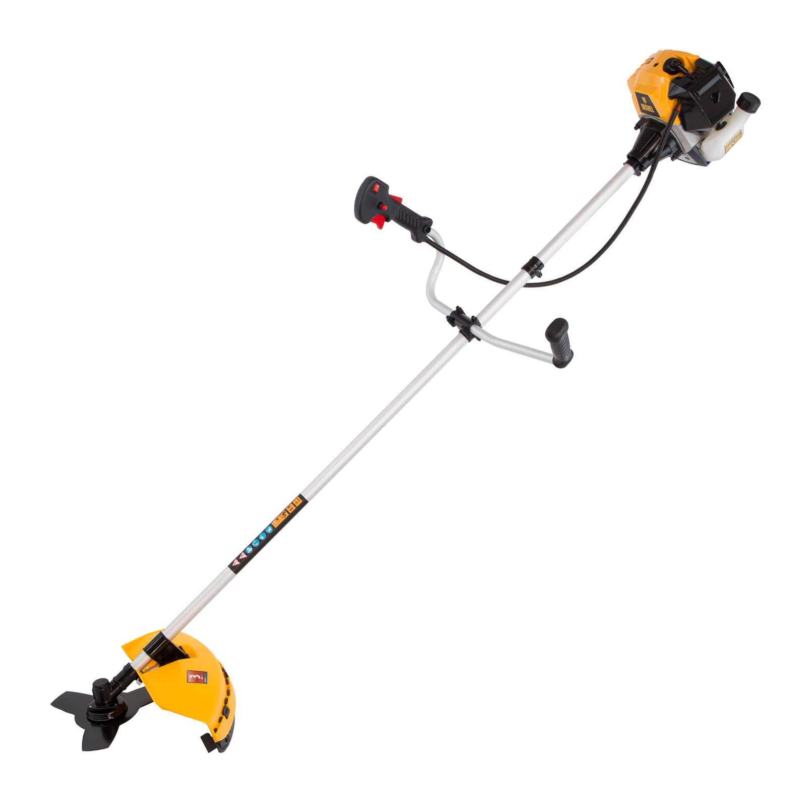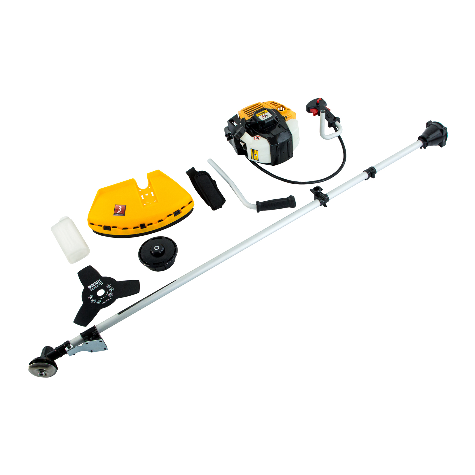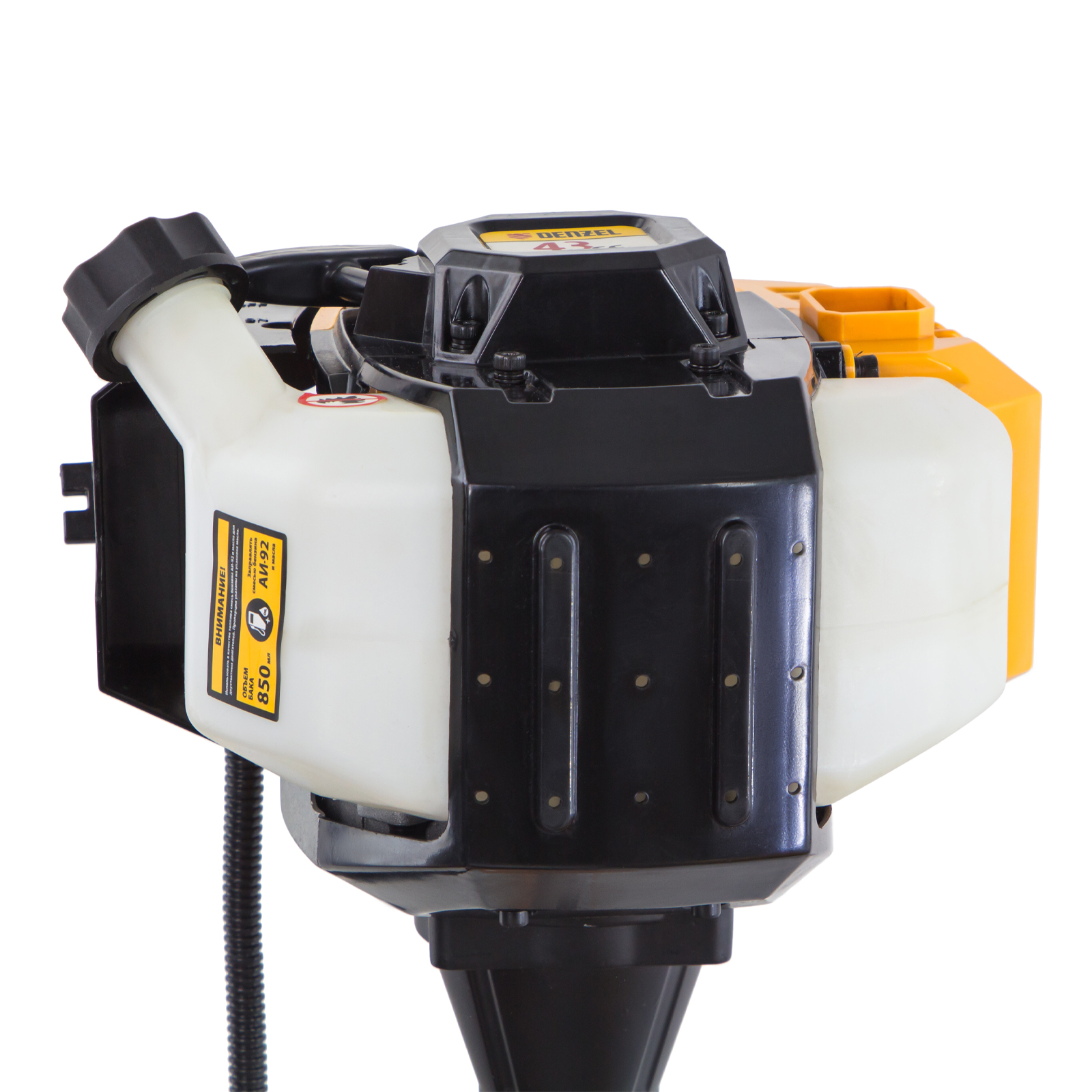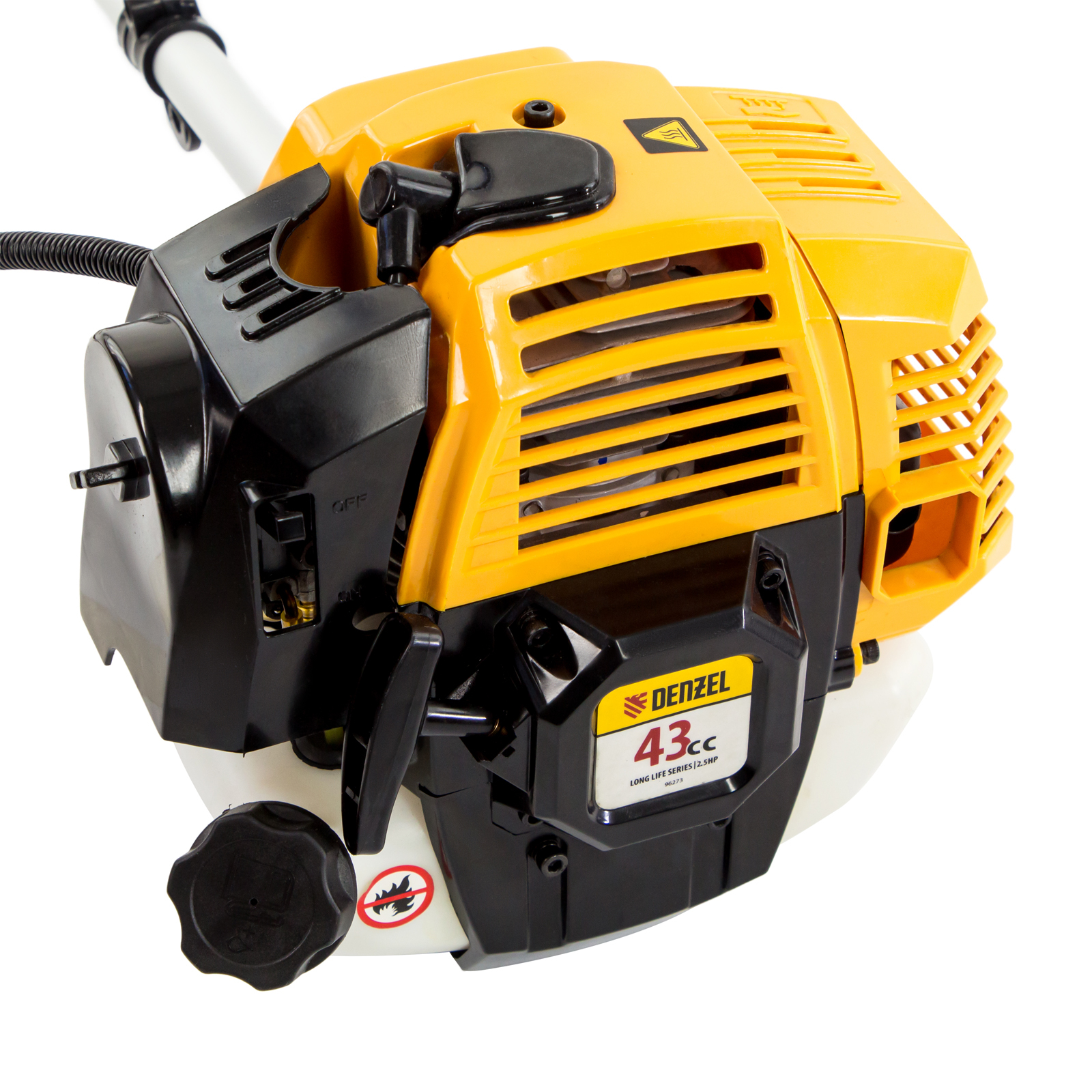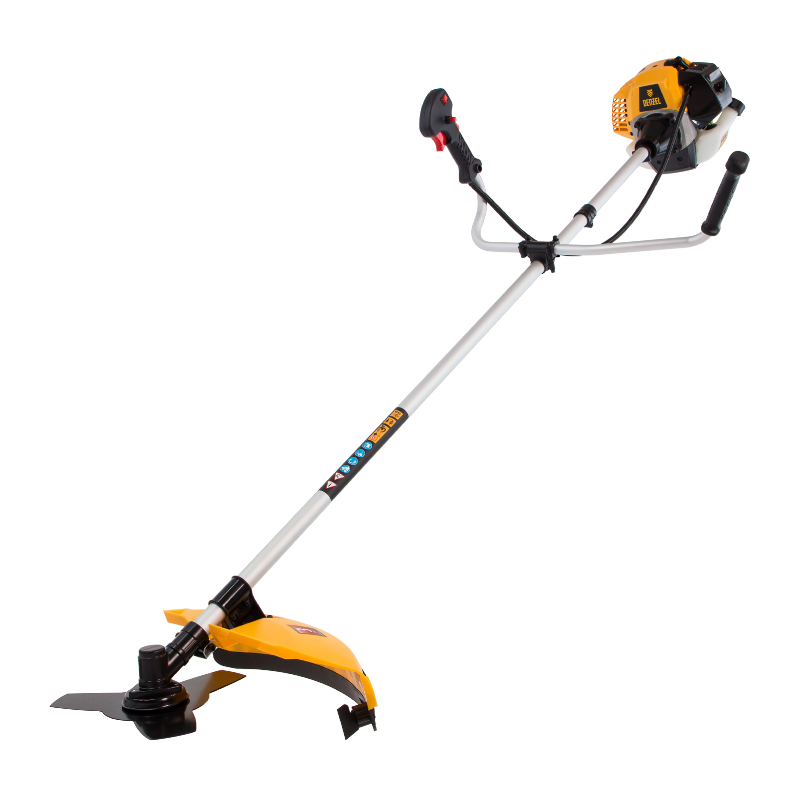 Бензиновый триммер Denzel DR-43 96273 с двигателем объемом 43 см3 и неразъемной штангой состоит из 2 частей и предназначен для ухода за газоном и формирования у него ровных границ, скашивания травы различных типов, в том числе с жесткими стеблями (полынь, крапива, лебеда). Удобен для работы в самых труднодоступных местах — на овражках, вокруг деревьев, вдоль стен и заборов. Эффективное решение этих задач обеспечивают режущие насадки — трехлопастный нож из стали и усиленная катушка из полиамида с леской. Они вращаются со скоростью 9500 об/мин, ширина скашивания составляет 25,5 и 42 см.,Инструмент не нужно включать в розетку, поэтому с ним можно работать в удаленных от дома уголках. Комплект поставки состоит из 2 частей для удобства транспортировки. Редуктор и корпус сцепления уже установлены на штангу, что облегчает его окончательную сборку.