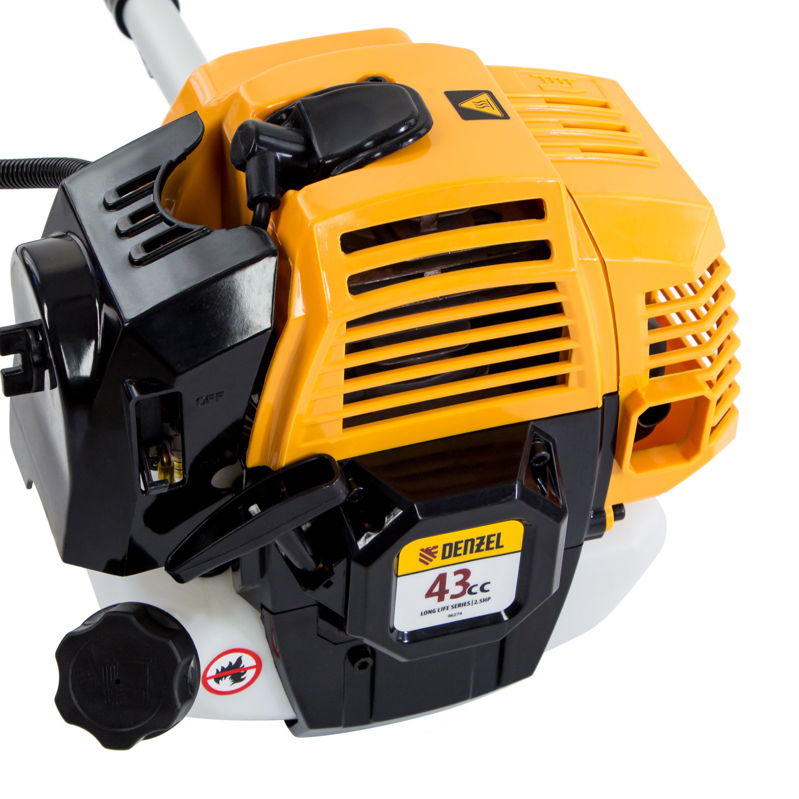 Бензиновый триммер Denzel DR-43S 96274 с двигателем объемом 43 см3 и разъемной штангой, состоит из 2 частей. Используется для ухода за газоном, скашивания травы различных типов, в том числе с жесткими стеблями (полынь, крапива, лебеда). Триммер эффективен на сложных участках: вдоль стен, в ямках и на возвышенностях, вокруг деревьев. Две режущие насадки — трехлопастный нож и катушка с леской — вращаются со скоростью 9500 об/мин, обеспечивая ширину скашивания 25,5 и 42 см. ,Эффективную работу инструмента обеспечивает двухтактный двигатель мощностью 2,5 л.с. При этом триммер экономично расходует топливо, поэтому часто заправлять его не придется.