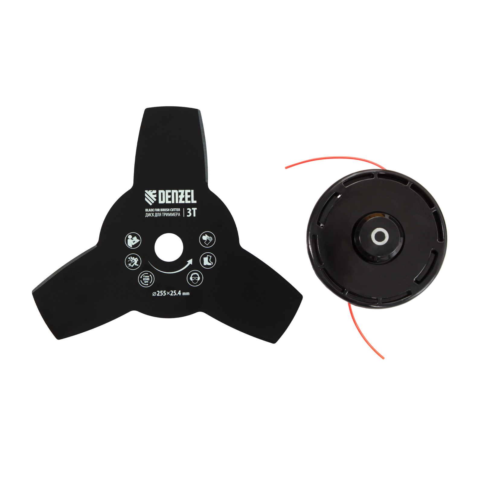 - Дополнительные возможности — можно приобрести диск Denzel 96323 с шириной скашивания 230 мм для быстрого удаления растительности с жесткими стеблями, 96328 для скашивания молодых побегов кустарника диаметром до 3 мм, 96340 для срезания борщевика, кустарника и молодых побегов деревьев с диаметром стволов до 10 мм.