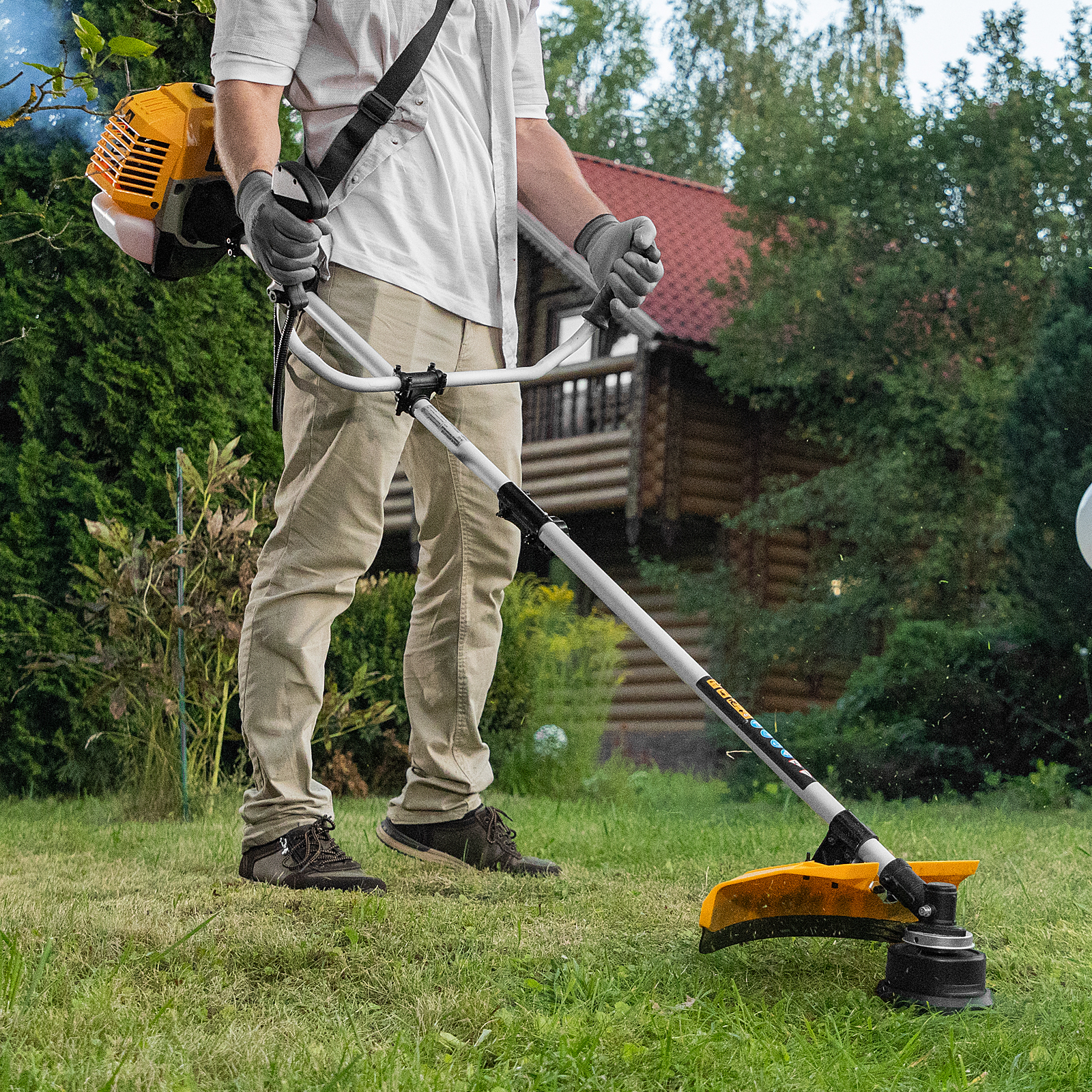 - Удобное управление — асимметричные рукоятки обеспечивают оптимальное положение рук, благодаря весу 7 кг триммер легко удерживать и направлять.