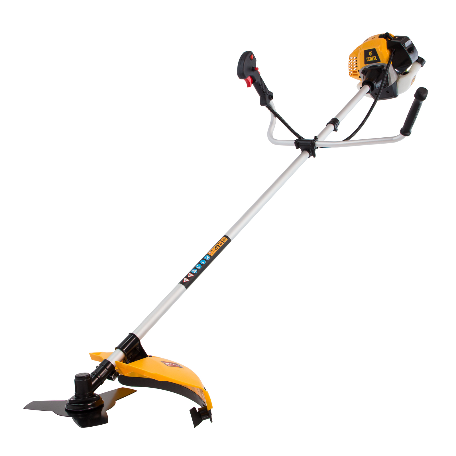 - Дополнительные возможности — можно приобрести диск Denzel 96323 с шириной скашивания 230 мм для быстрого удаления растительности с жесткими стеблями, 96328 для скашивания молодых побегов кустарника диаметром до 3 мм, 96340 для срезания борщевика, кустарника и молодых побегов деревьев с диаметром стволов до 10 мм.