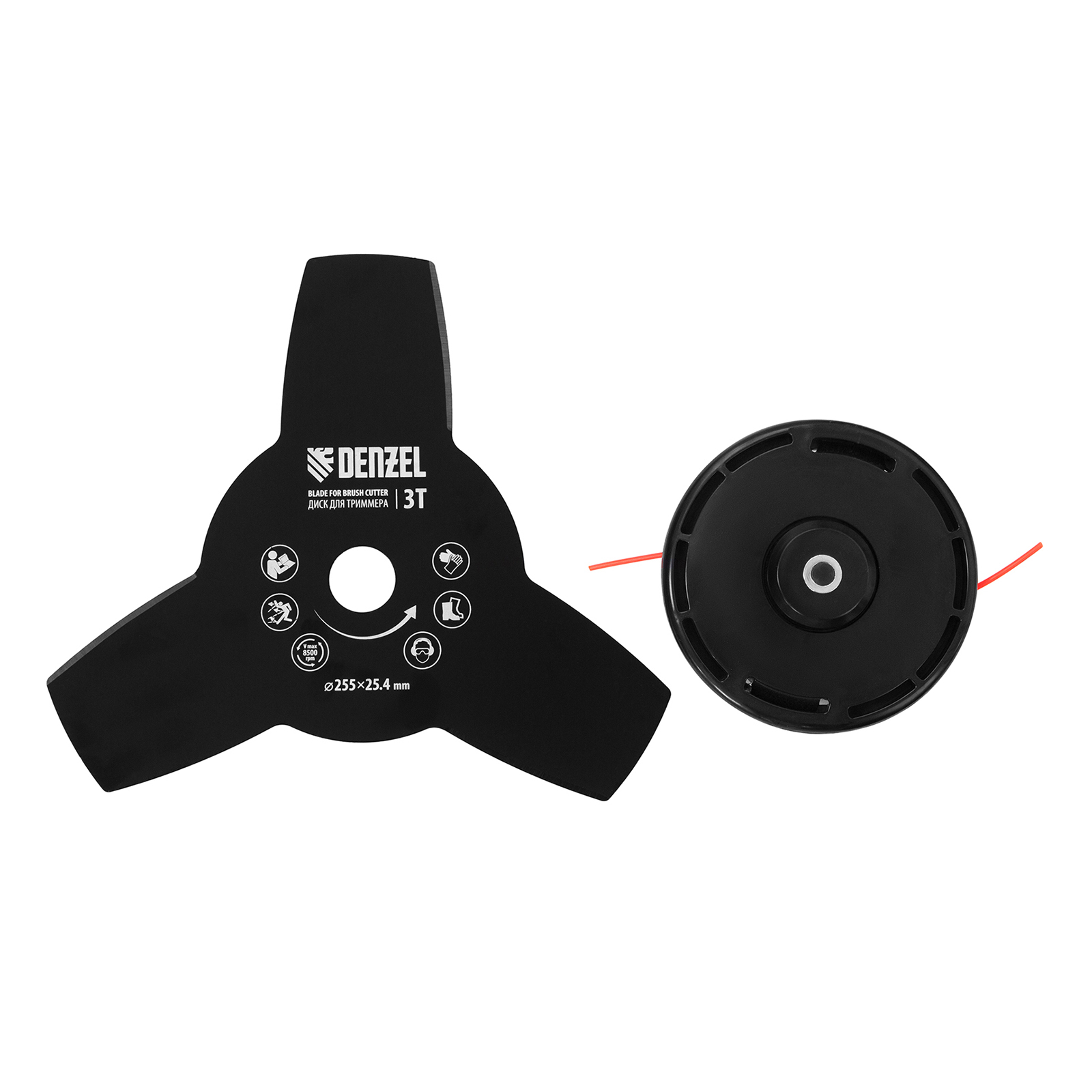 - Дополнительные возможности — можно приобрести диск Denzel 96323 с шириной скашивания 230 мм для быстрого удаления растительности с жесткими стеблями, 96328 для скашивания молодых побегов кустарника диаметром до 3 мм, 96340 для срезания борщевика, кустарника и молодых побегов деревьев с диаметром стволов до 10 мм.
