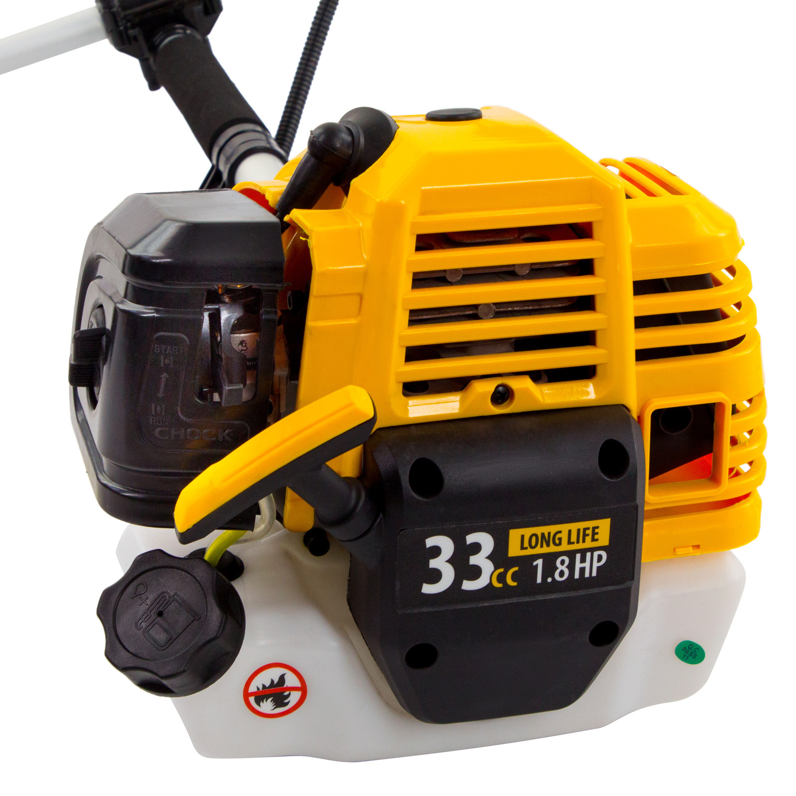 Бензиновый триммер Denzel DT-33S 96223 с двигателем мощностью 1,8 л.с. и объемом 33 см³, с разъемной штангой, поставляется комплектом из 2 частей и предназначен для подравнивания газона и скашивания травы всех типов, в том числе с жесткими древовидными стеблями (полыни, крапивы, лебеды, борщевика), а также срезания кустарника и молодых побегов деревьев с диаметром стволов до 10 мм. Удобен для работы в труднодоступных местах, может работать с мокрой травой. В комплекте катушка с леской и пильный диск, ширина скашивания составляет 420 мм и 255 мм соответственно.