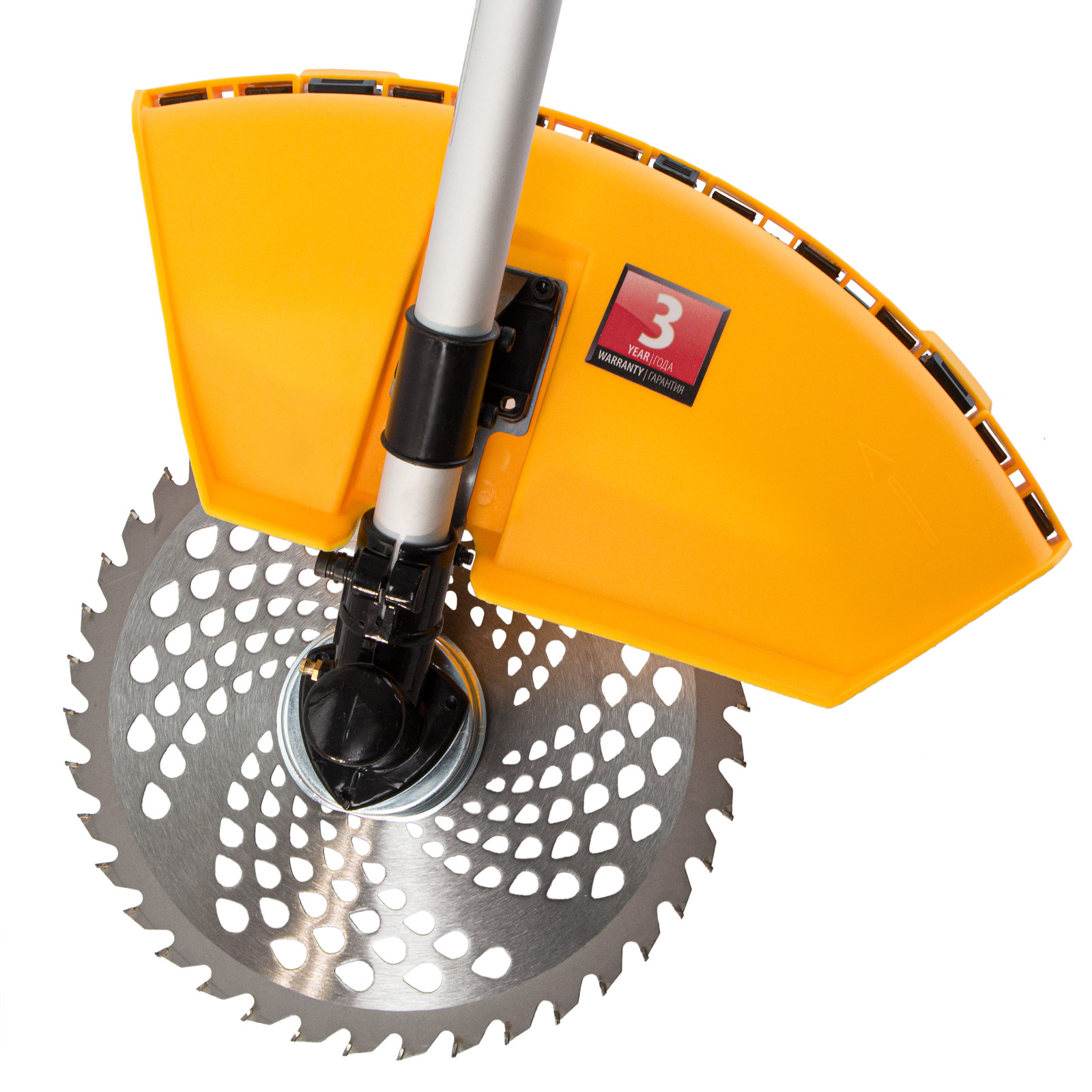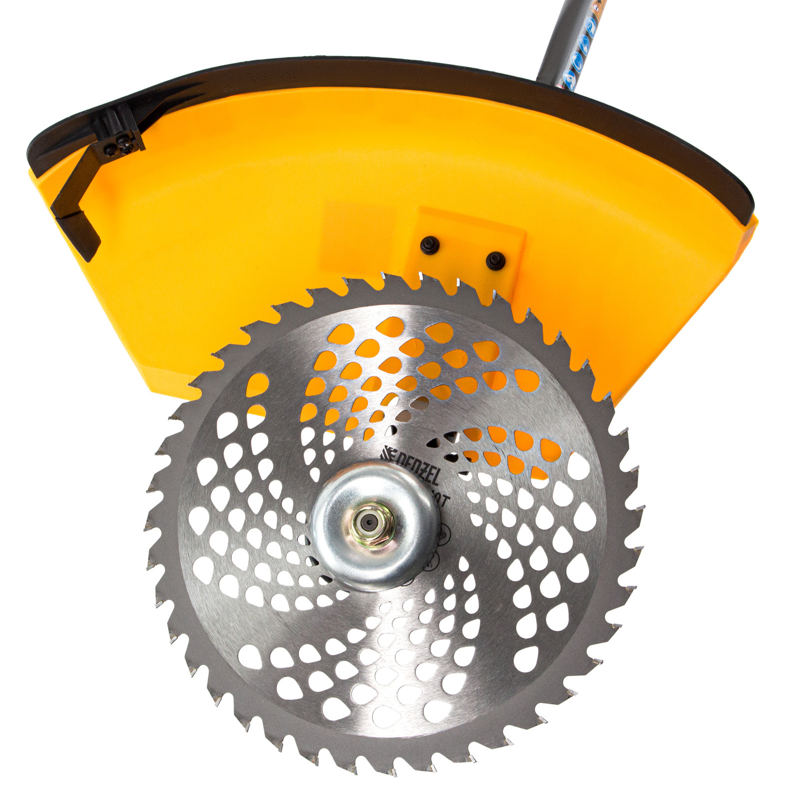 - Дополнительные возможности — можно приобрести диски Denzel 96323, 96325 для быстрого удаления растительности с жесткими стеблями (полыни, крапивы, лебеды), 96328 для скашивания молодых побегов кустарника диаметром до 3 мм.