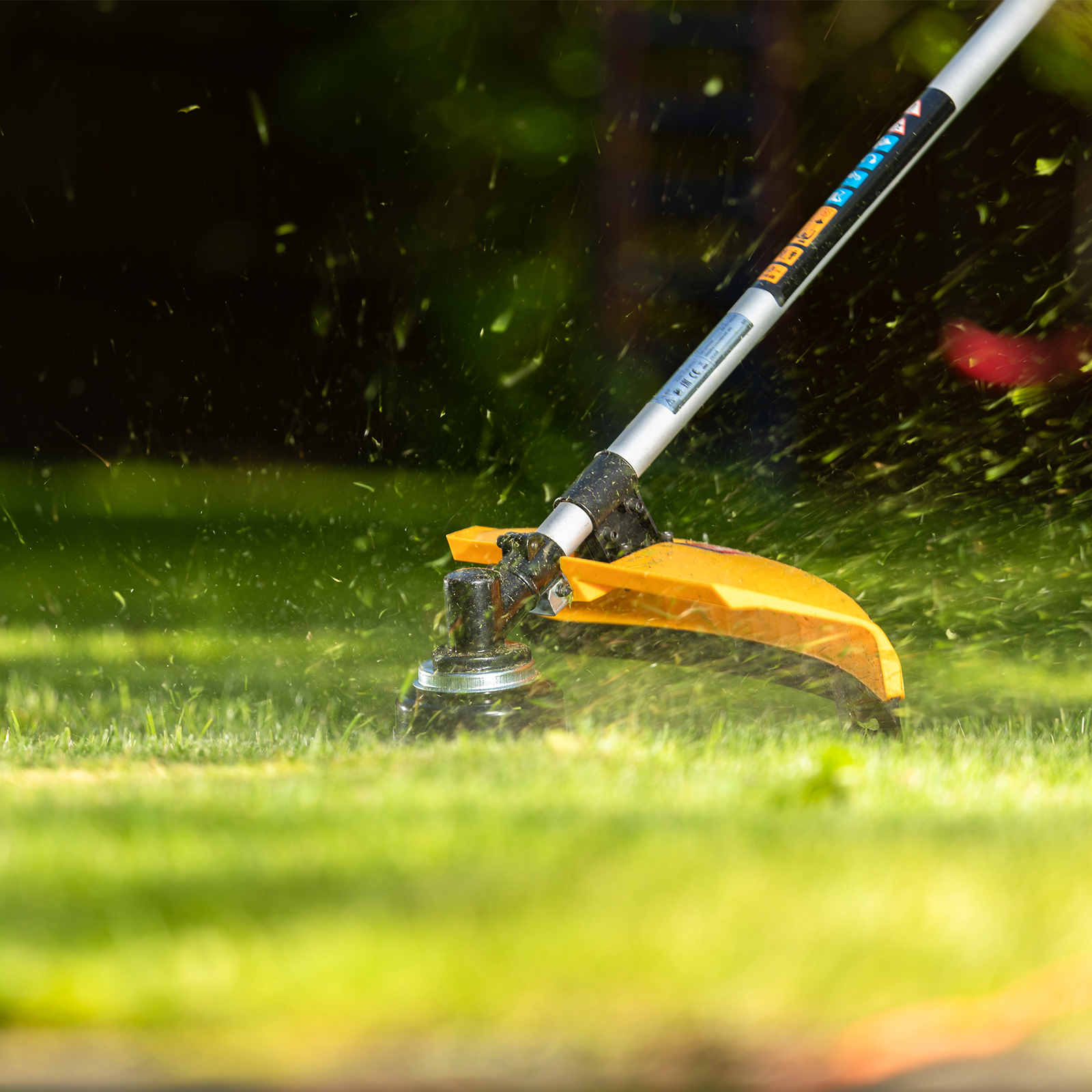 - Удобное хранение и транспортировка — штанга легко разбирается на 2 части, поэтому триммер не занимает много места.