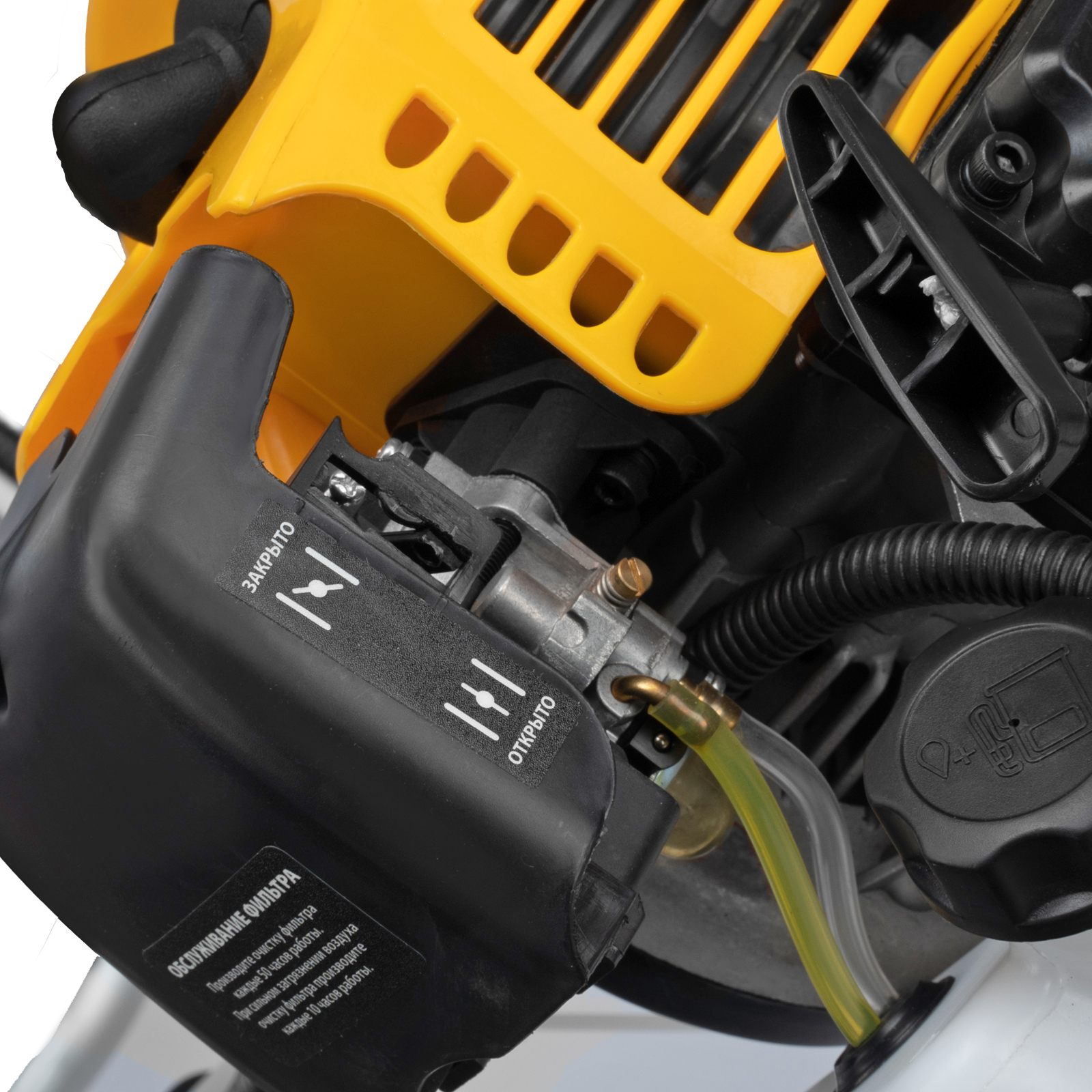 - Безопасность — блокиратор курка газа препятствует случайному запуску двигателя, прочный пластиковый кожух защищает пользователя от летящей травы, грязи и прочих твердых частиц.