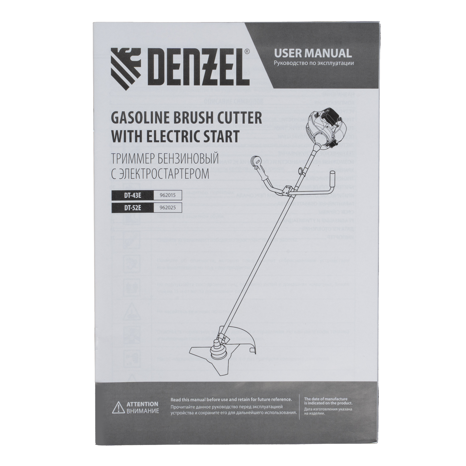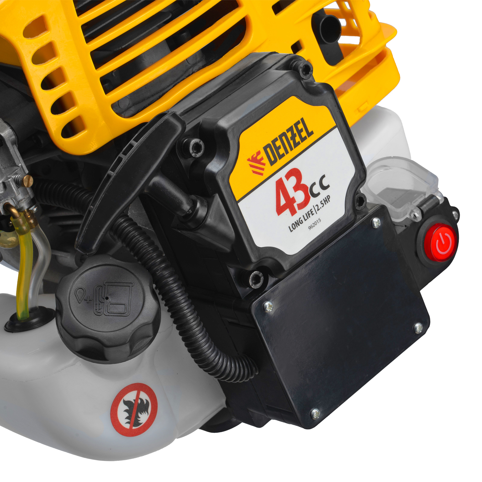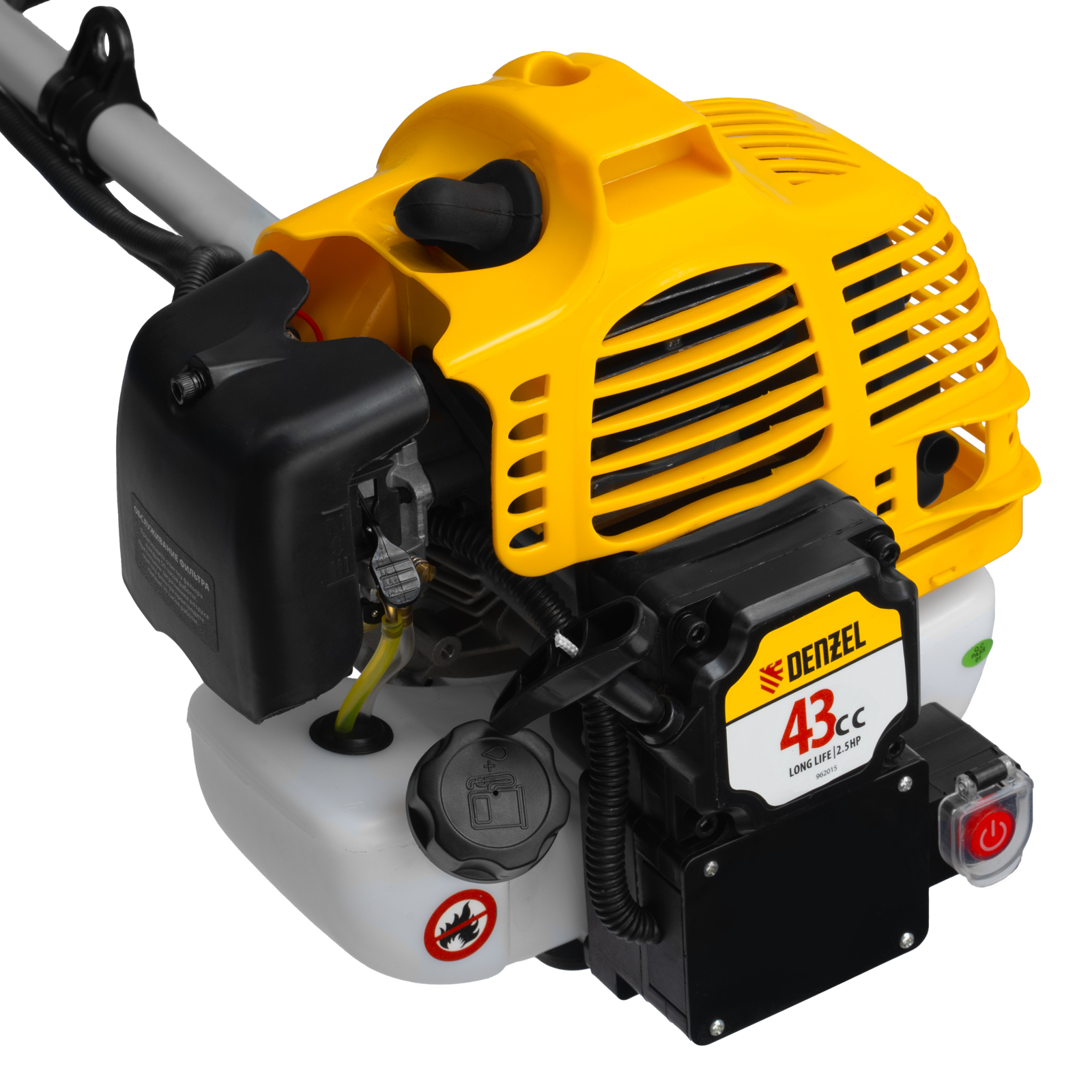 Триммер бензиновый DT-43E, 43 см3, неразъемная штанга, электростартер, состоит из 2 частей Denzel