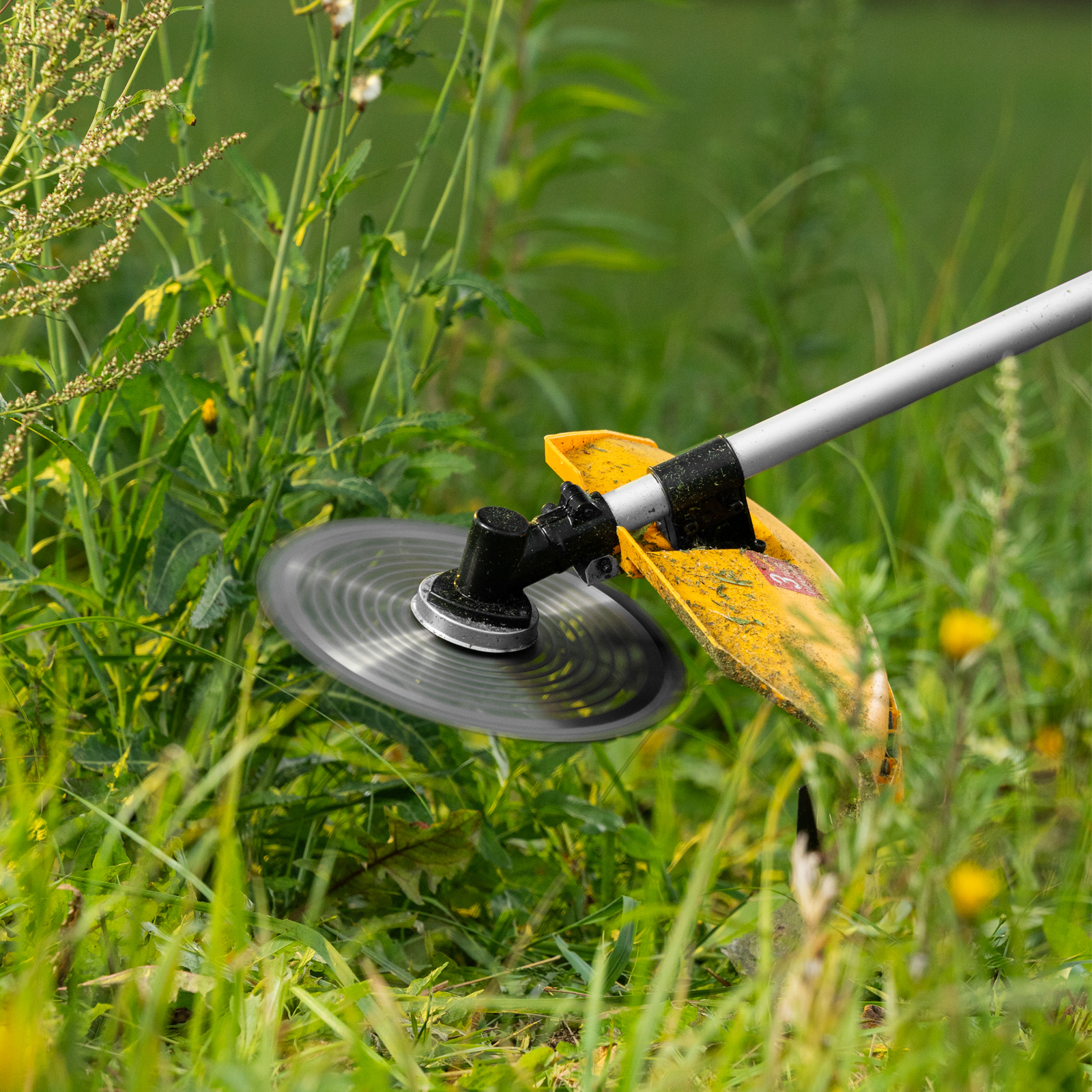 - Дополнительные возможности — можно приобрести и установить на триммер диски Denzel 96323, 96325 для быстрого удаления растительности с жесткими стеблями (полыни, крапивы, лебеды), 96328 для скашивания молодых побегов кустарника диаметром до 3 мм.