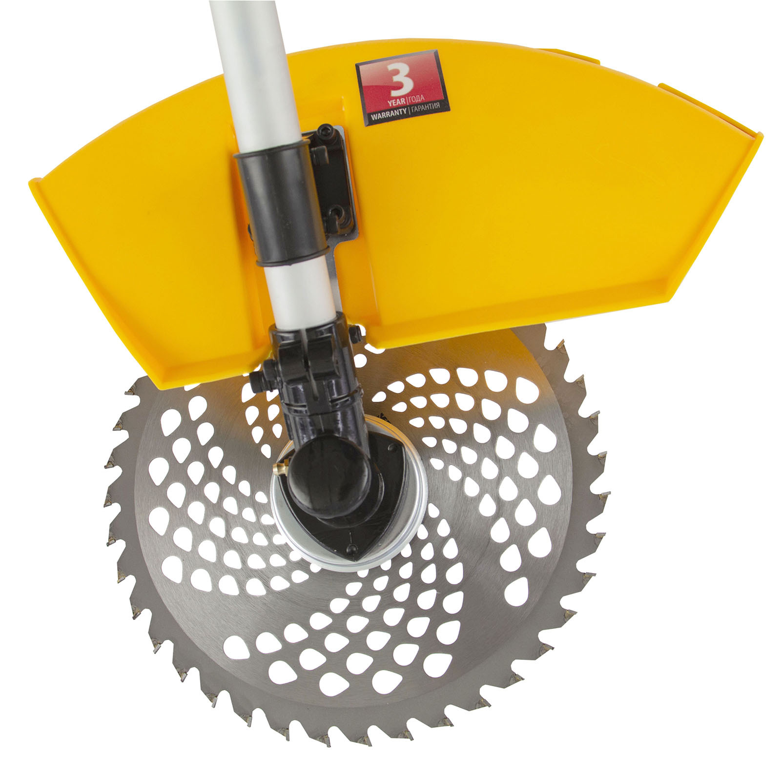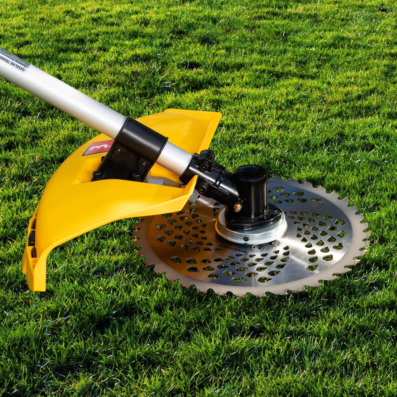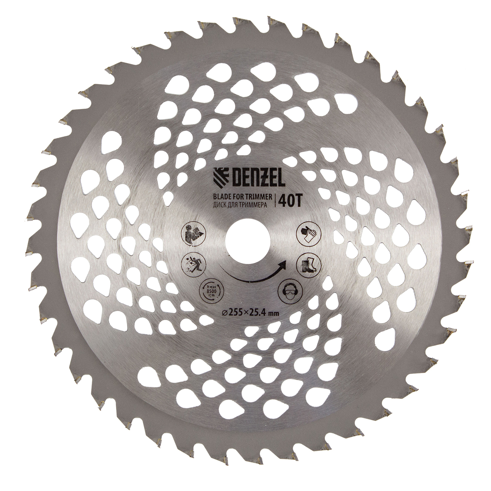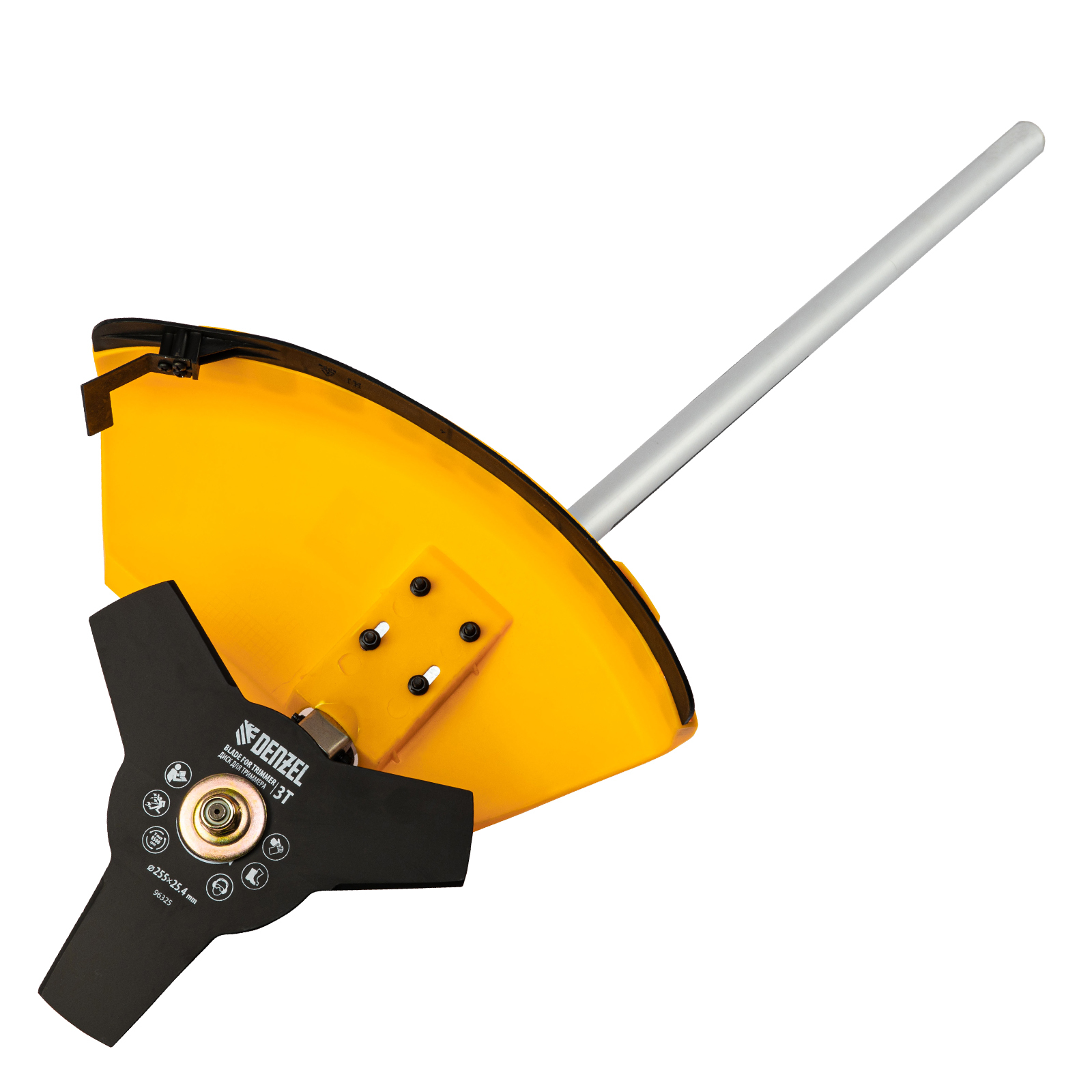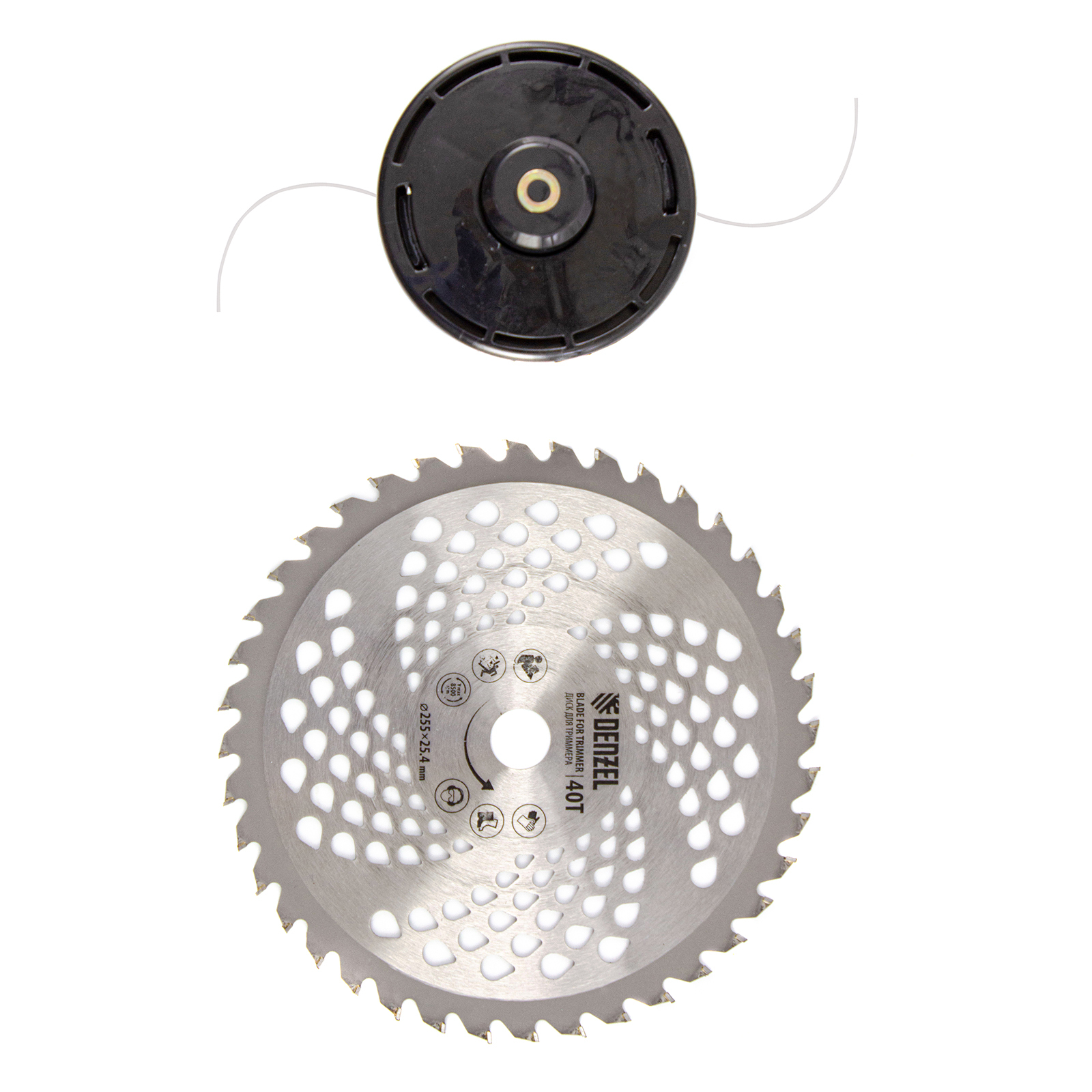 - Дополнительные возможности — можно приобрести диски Denzel 96323, 96325 для быстрого удаления растительности с жесткими стеблями (полыни, крапивы, лебеды), 96328 для скашивания молодых побегов кустарника диаметром до 3 мм.
