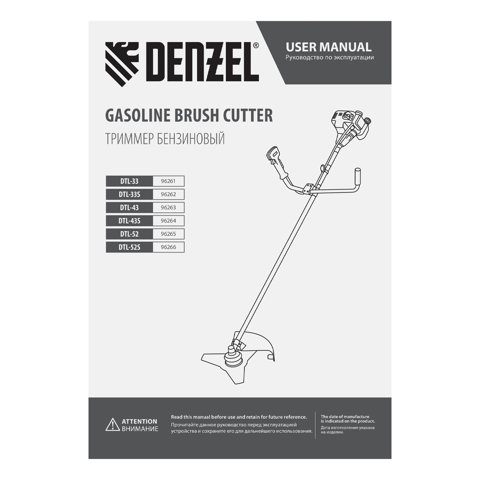 Триммер бензиновый DTL-33S, 33 см3, разъемная штанга, состоит из 2 частей Denzel