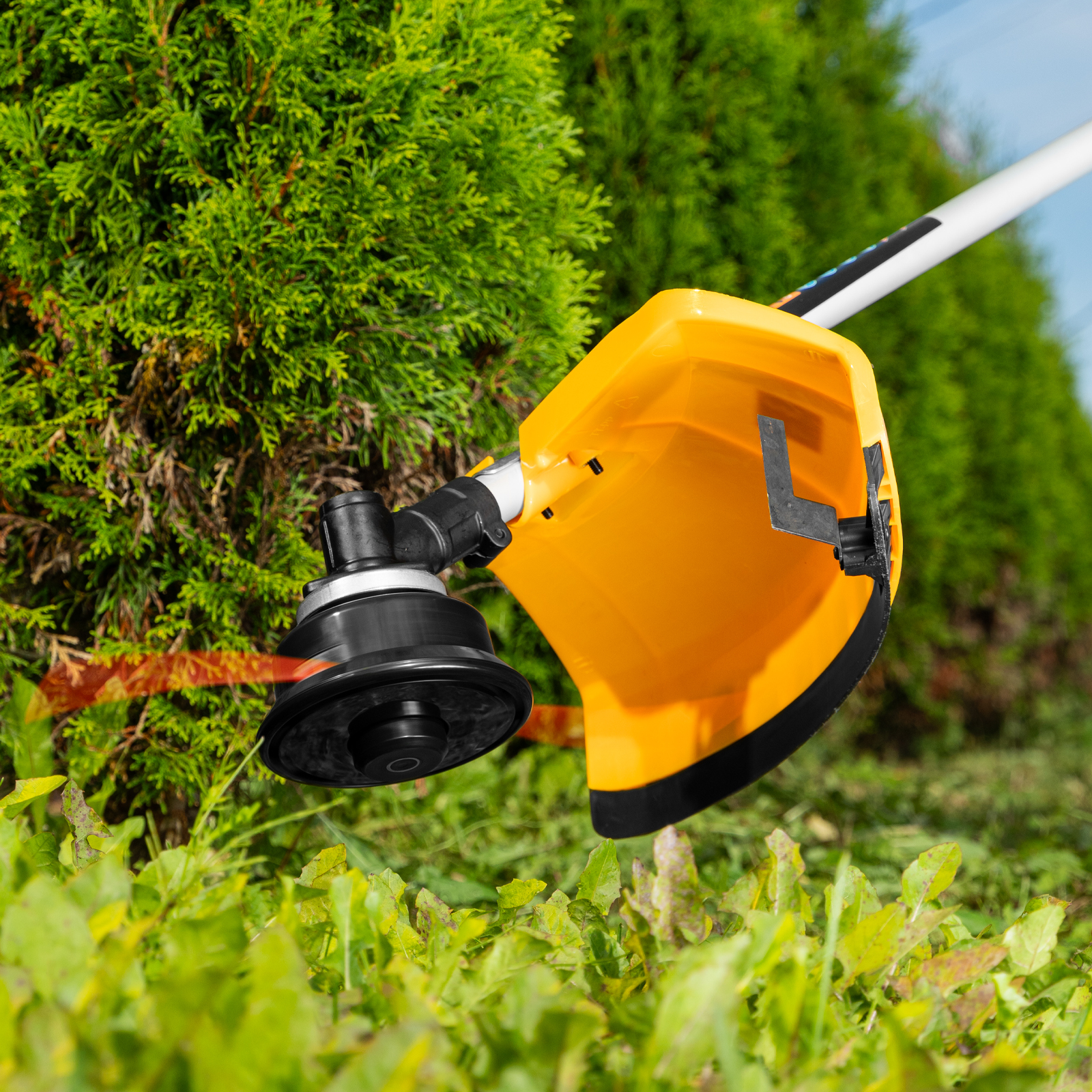 - Автоматическое укорачивание лески — специальный нож на защитном кожухе обрезает лишние «хвосты», предохраняя двигатель от перегрузки и перегрева.