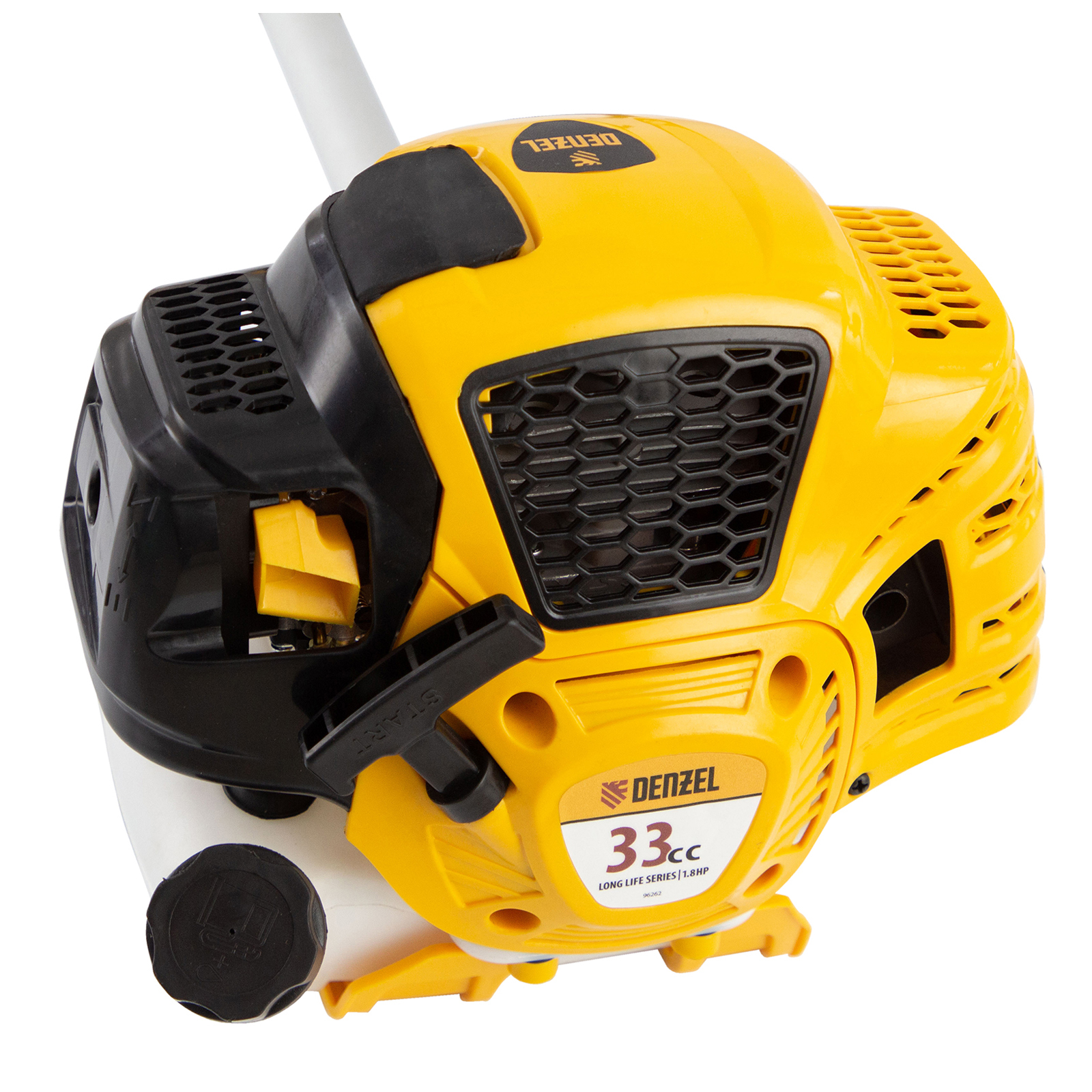 Бензиновый триммер Denzel DTL-33S 96262 с разъемной штангой, состоящей из 2 частей, оснащен 2-тактным двигателем объемом 33 см3. Предназначен для стрижки газона, скашивания травы всех типов, в том числе с жесткими древовидными стеблями (полыни, крапивы, лебеды, борщевика), а также срезания кустарника и молодых побегов деревьев с диаметром стволов до 10 мм. Усиленная катушка с леской и пильный диск, вращающиеся со скоростью 9500 об/мин, обеспечивают ширину скашивания 42 и 25,5 см. Инструмент не требует подключения к электросети, поэтому подходит для работы с влажной травой и может использоваться на отдаленных от дома участках.