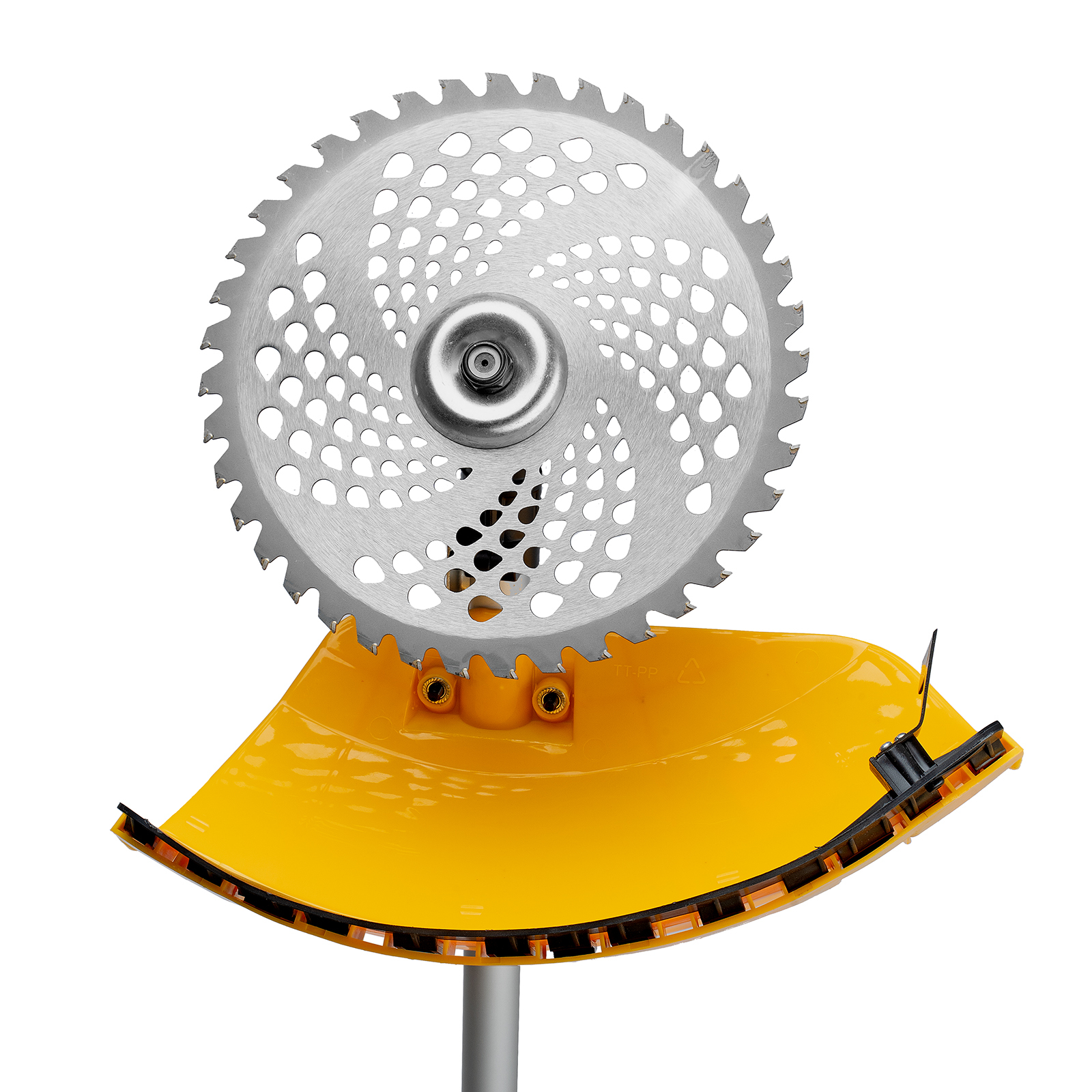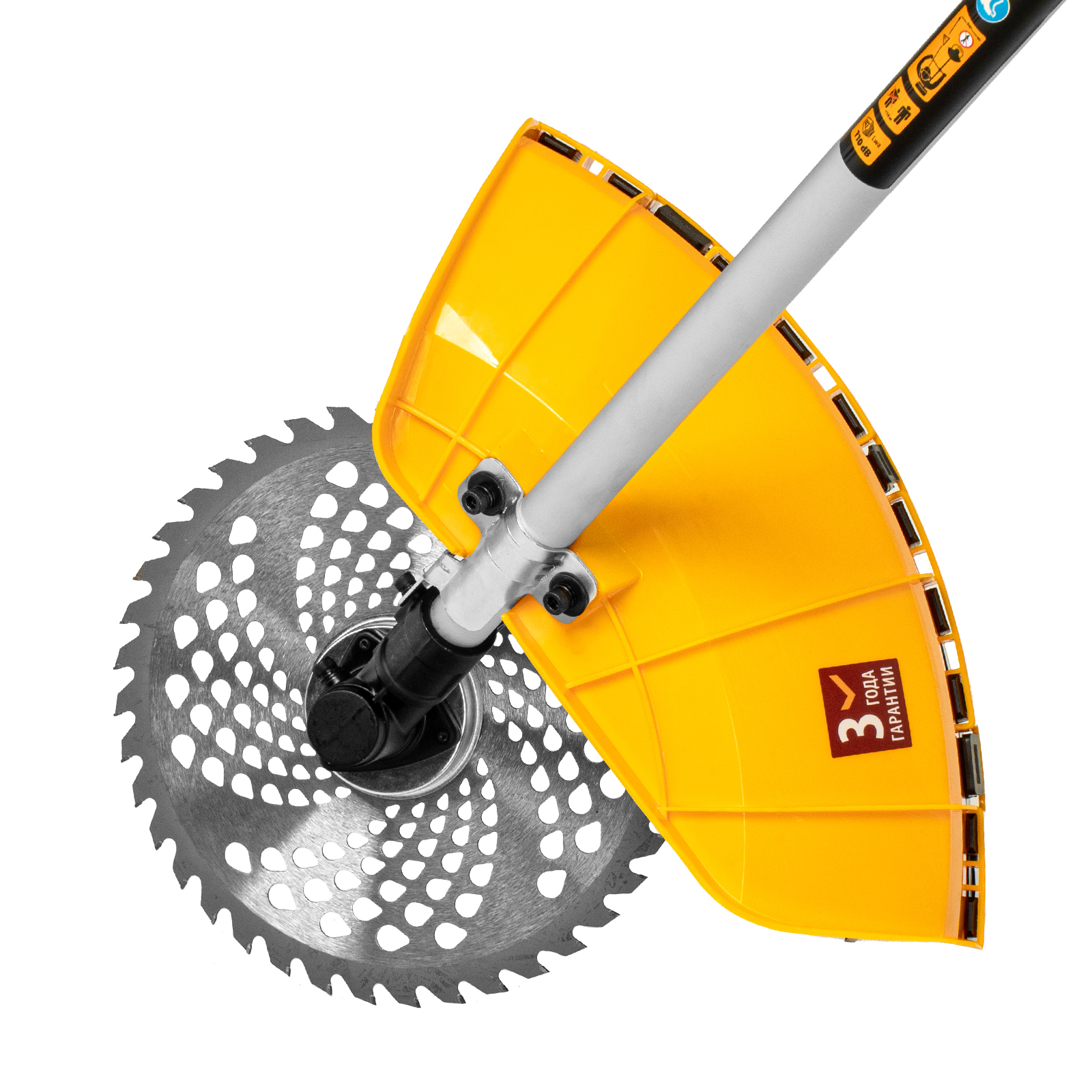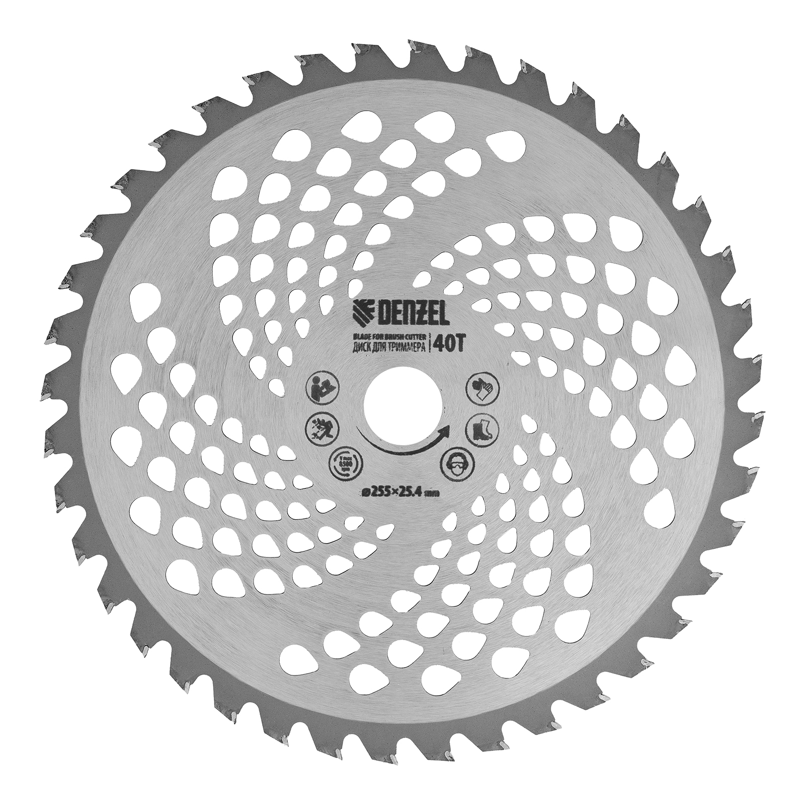 - Дополнительные возможности — можно приобрести диски Denzel 96323, 96325 для быстрого удаления растительности с жесткими стеблями, 96328 для скашивания молодых побегов кустарника диаметром до 3 мм.