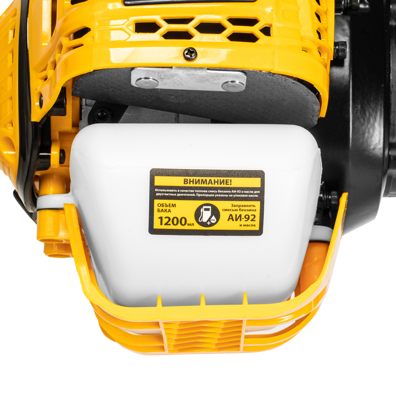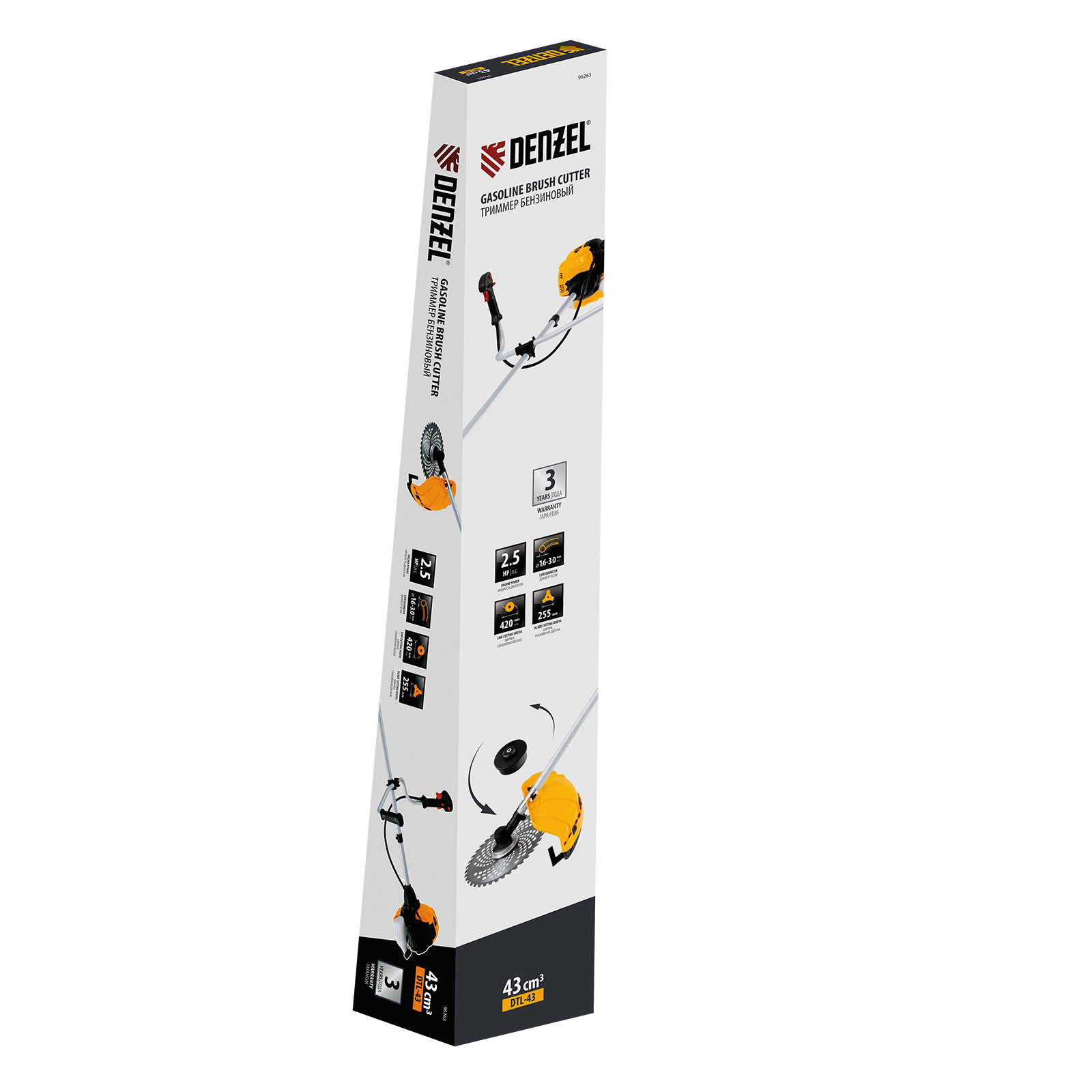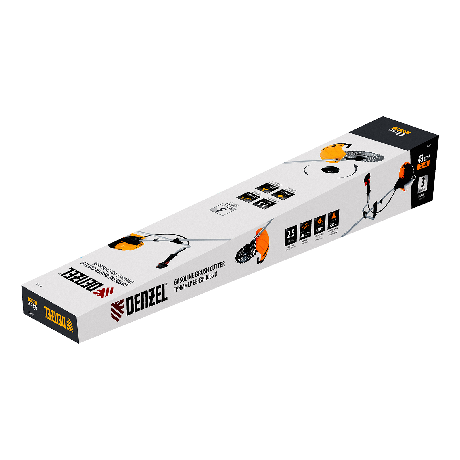 Бензиновый триммер Denzel DTL-43 96263 с двигателем объемом 43 см3, имеет неразъемную штангу и поставляется комплектом из 2 частей. Предназначен для скашивания травы всех типов, в том числе с жесткими древовидными стеблями (полыни, крапивы, лебеды, борщевика), а также срезания кустарника и молодых побегов деревьев с диаметром стволов до 10 мм. Двигатель мощностью 2,5 л.с. обеспечивает скорость вращения насадок 9500 об/мин. В комплект входят 2 оснастки: катушка с леской (обеспечивает ширину скашивания 42 см) и остро заточенный пильный диск (25,5 см). Триммер не зависит от наличия электросети, поэтому его можно использовать вдали от дома. Эргономичная конструкция обеспечивает маневренность даже на труднодоступных участках.